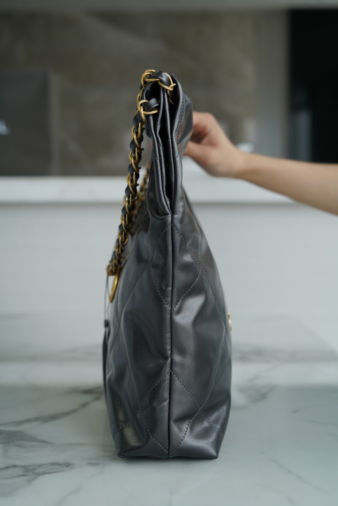 Chanel 22P Spring/Summer New Collection 22 Handbag in Gray with Silver hardware. It is made with a small-sized leather that is both soft and durable. The simple exterior design conceals sophisticated elements created by the designer, such as the hollowed-out Chanel logo. These small embellishments elevate the overall elegance to a higher level, exuding a nostalgic charm and a relaxed, casual vibe.