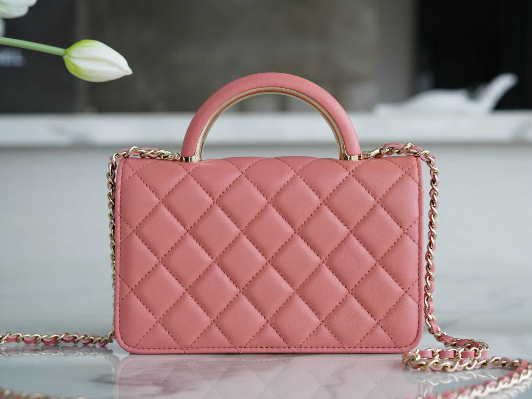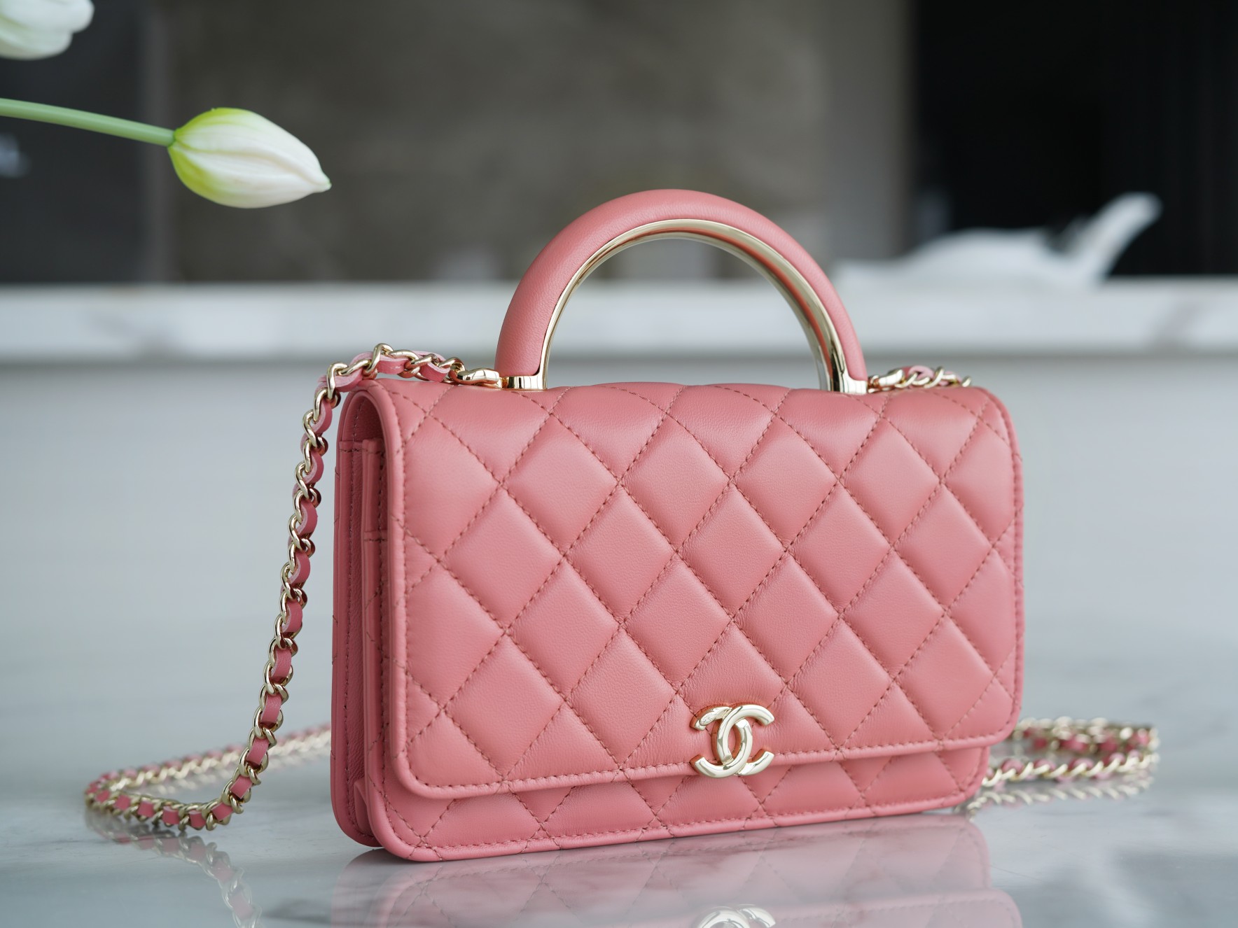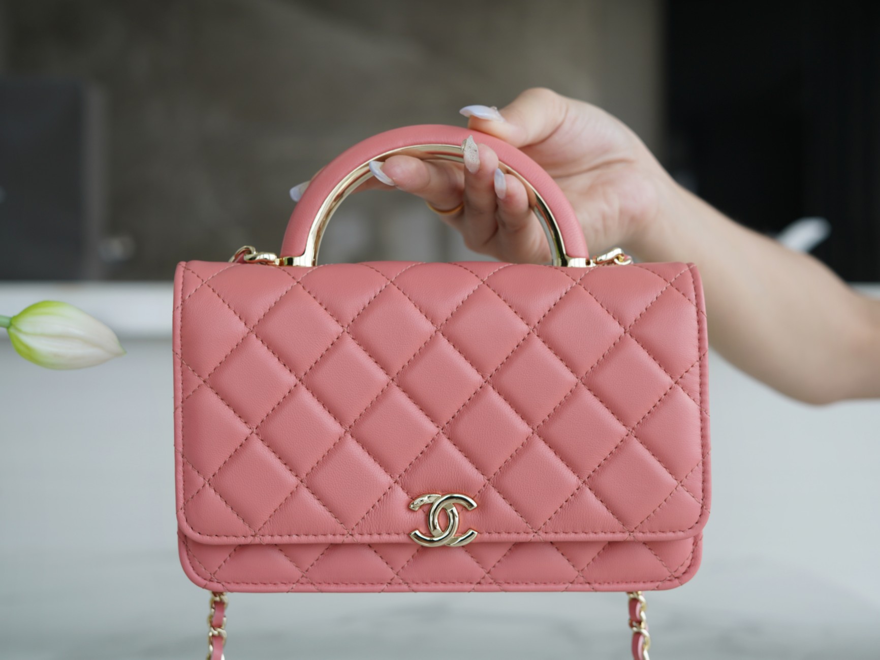 The CHANEL 22A Early Autumn Collection features a WOC (Wallet on Chain) with a metal handle. It has a comfortable and delicate touch, paired with a chubby little handle. The design is simple and interesting, making it convenient and delightful to carry around. It’s versatile, timeless, and always in style.