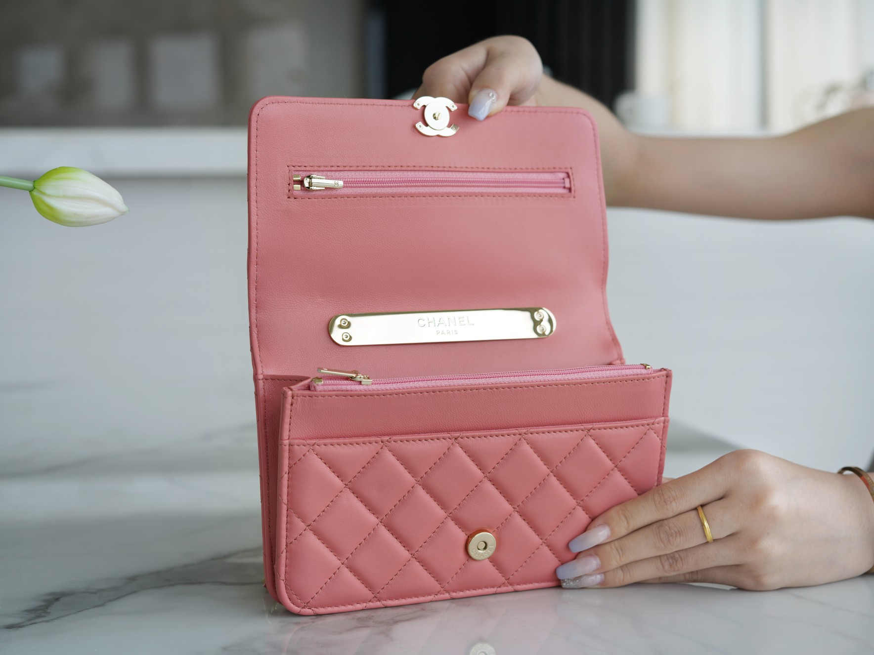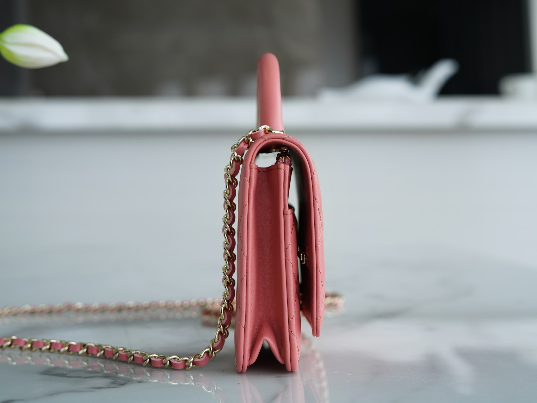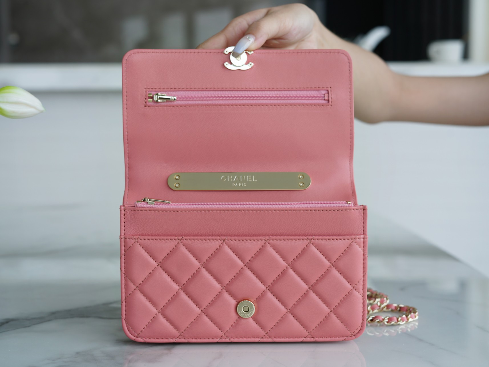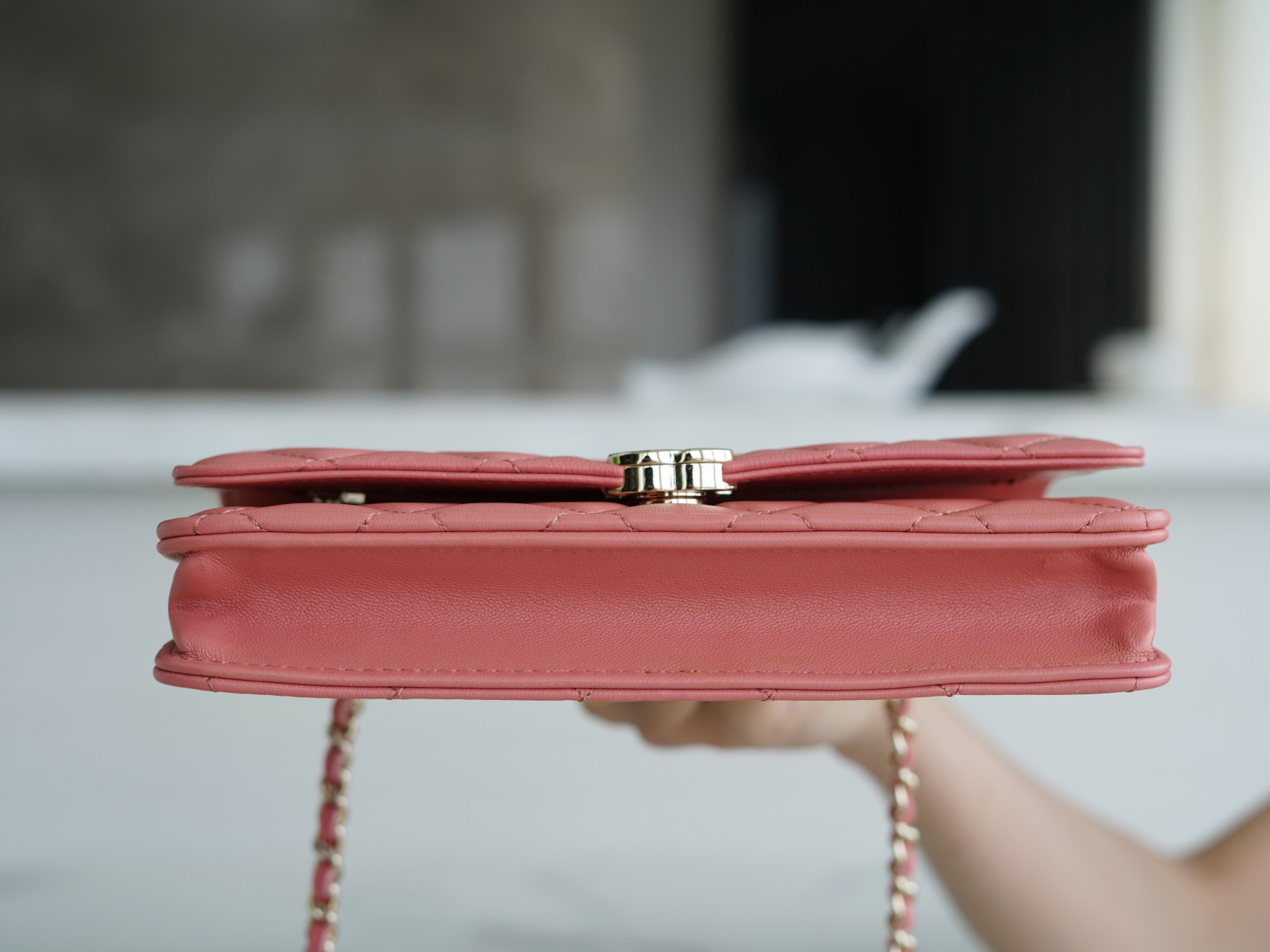 The CHANEL 22A Early Autumn Collection features a WOC (Wallet on Chain) with a metal handle. It has a comfortable and delicate touch, paired with a chubby little handle. The design is simple and interesting, making it convenient and delightful to carry around. It’s versatile, timeless, and always in style.