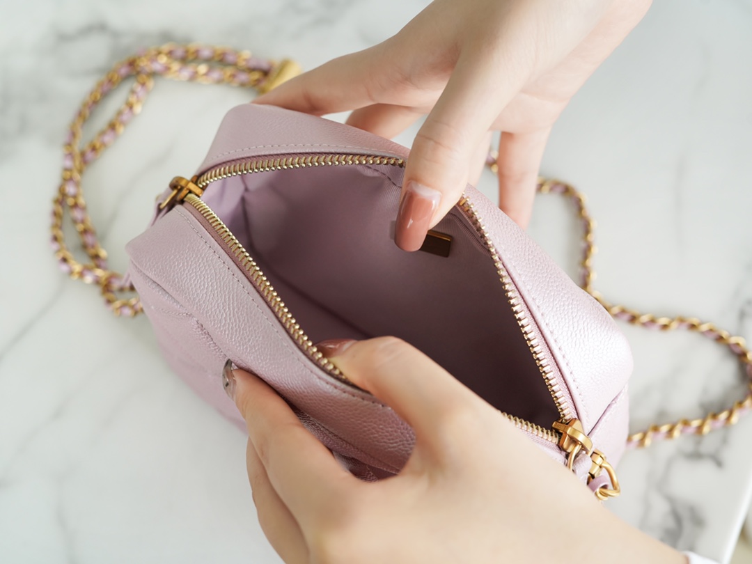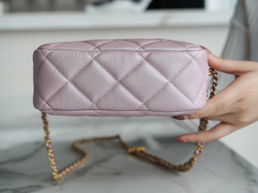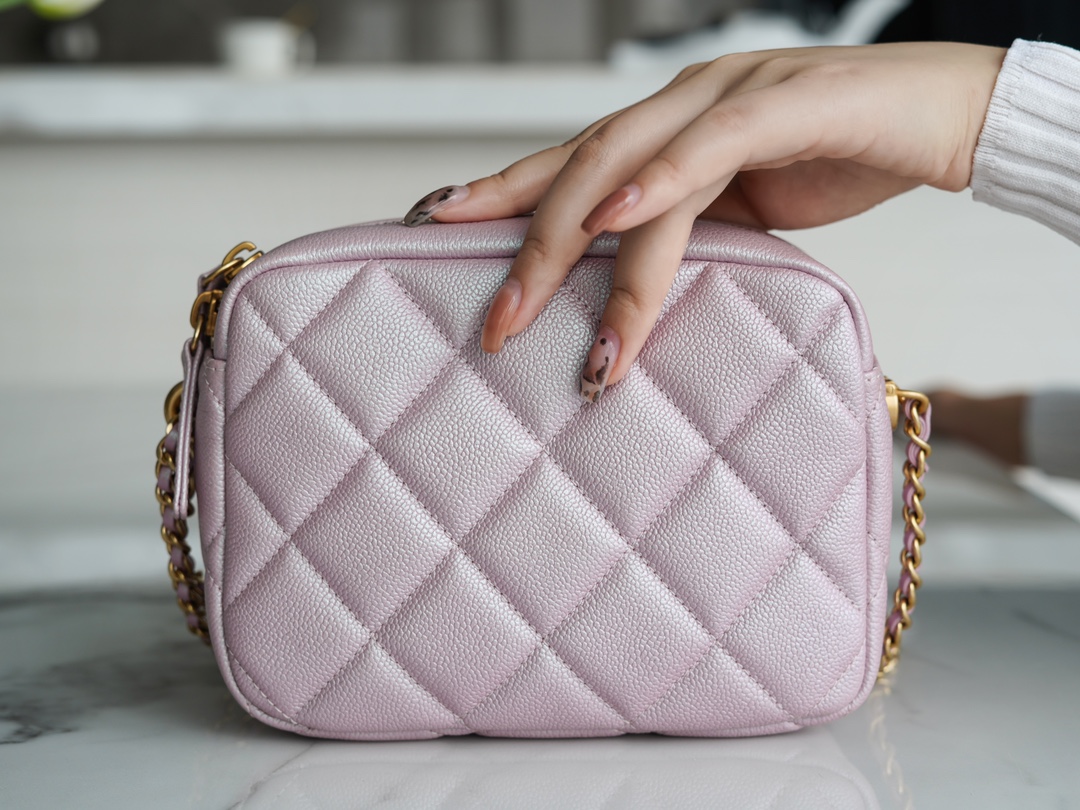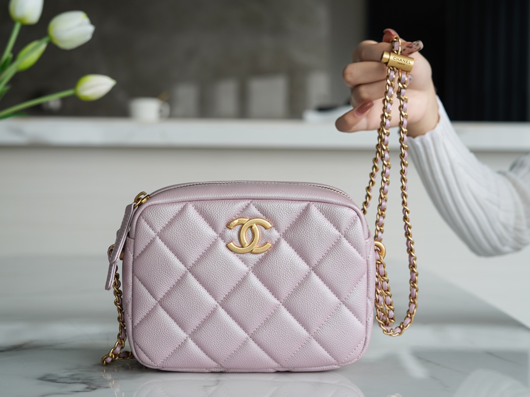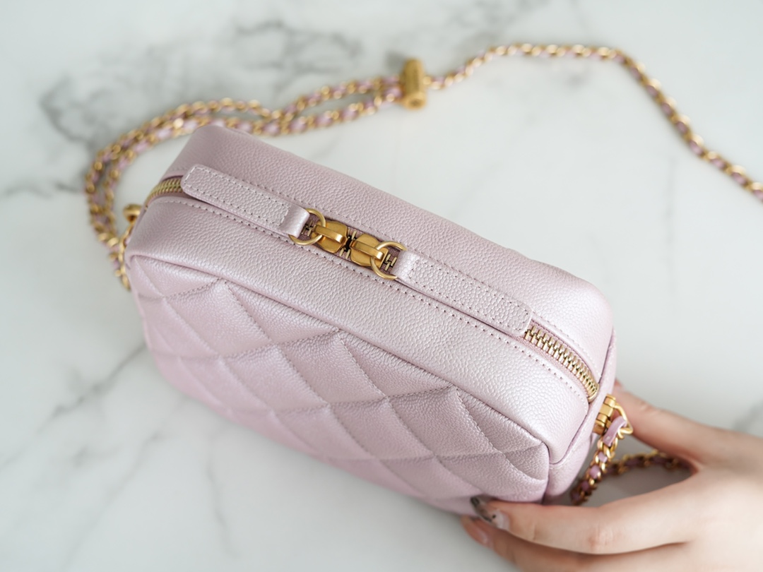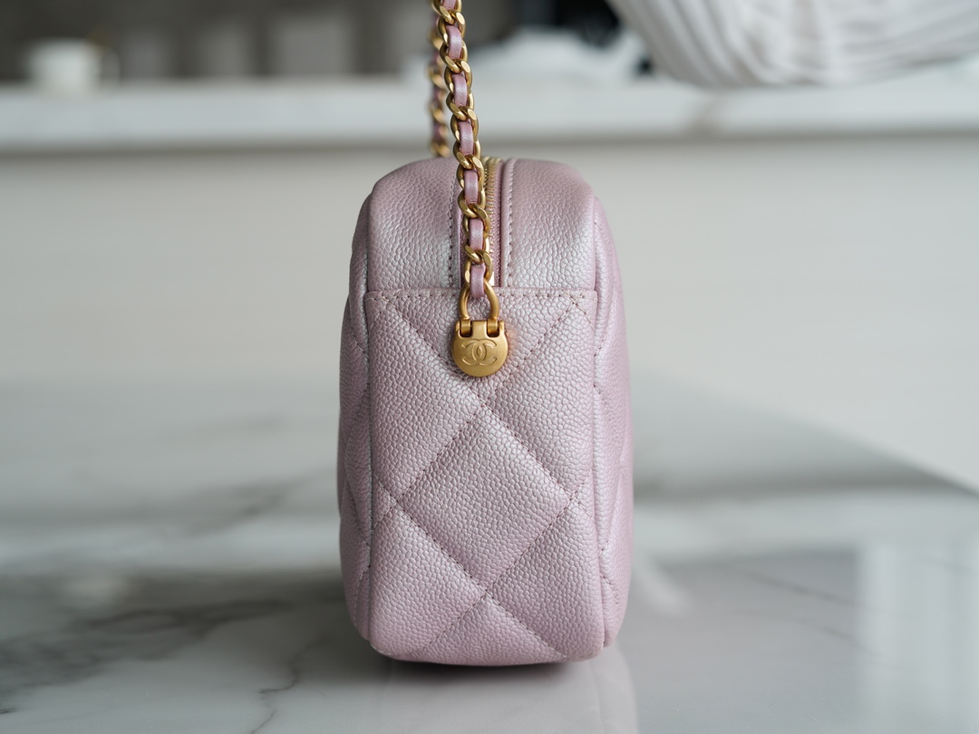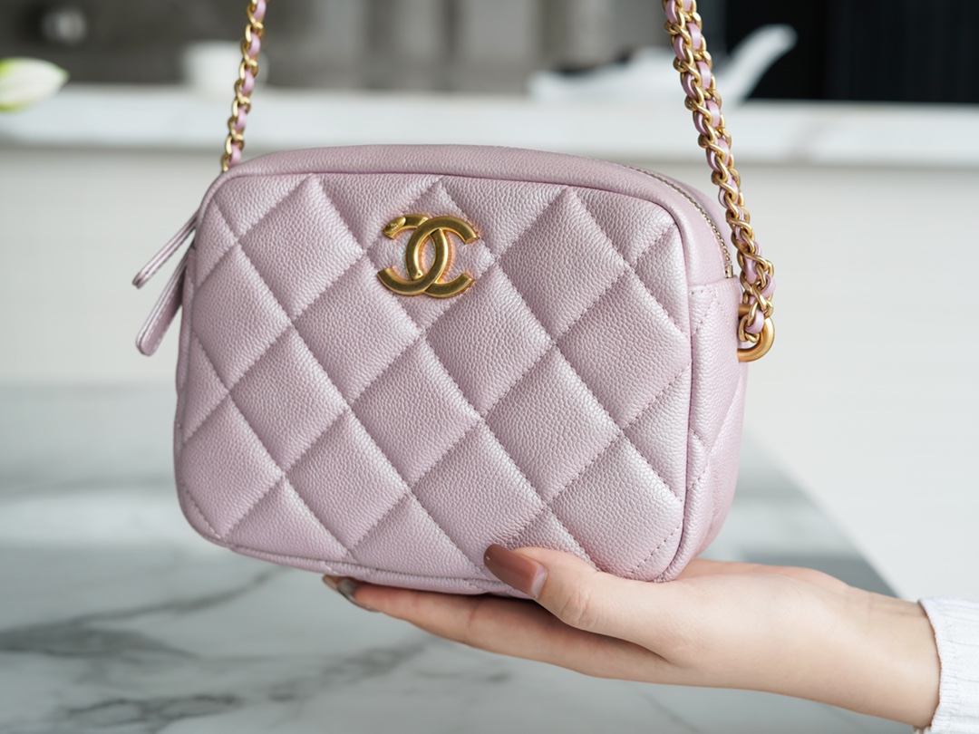 The CHANEL Fall/Winter new bullet shell crossbody bag in iridescent pink is undoubtedly the must-have item of the season. This season’s “C” camera bag is the king of cost-effectiveness, combining all the perfect features. The bullet shell has adjustable length buttons, cleverly designed with exquisite craftsmanship. The lychee-patterned cowhide gives it a pearlescent and enchanting touch, paired with a vintage and stylish sandy gold accent. Handcrafted to be sturdy and durable, this is a must-have item.