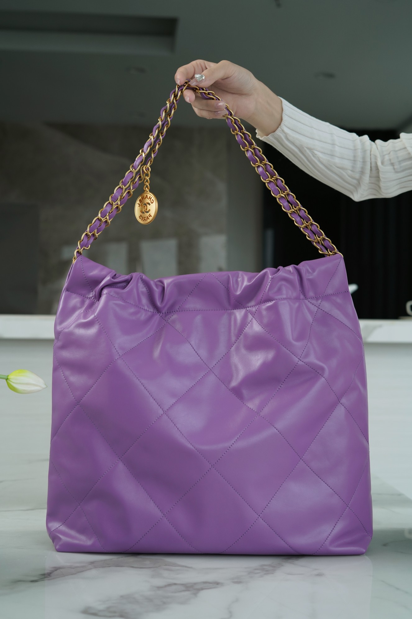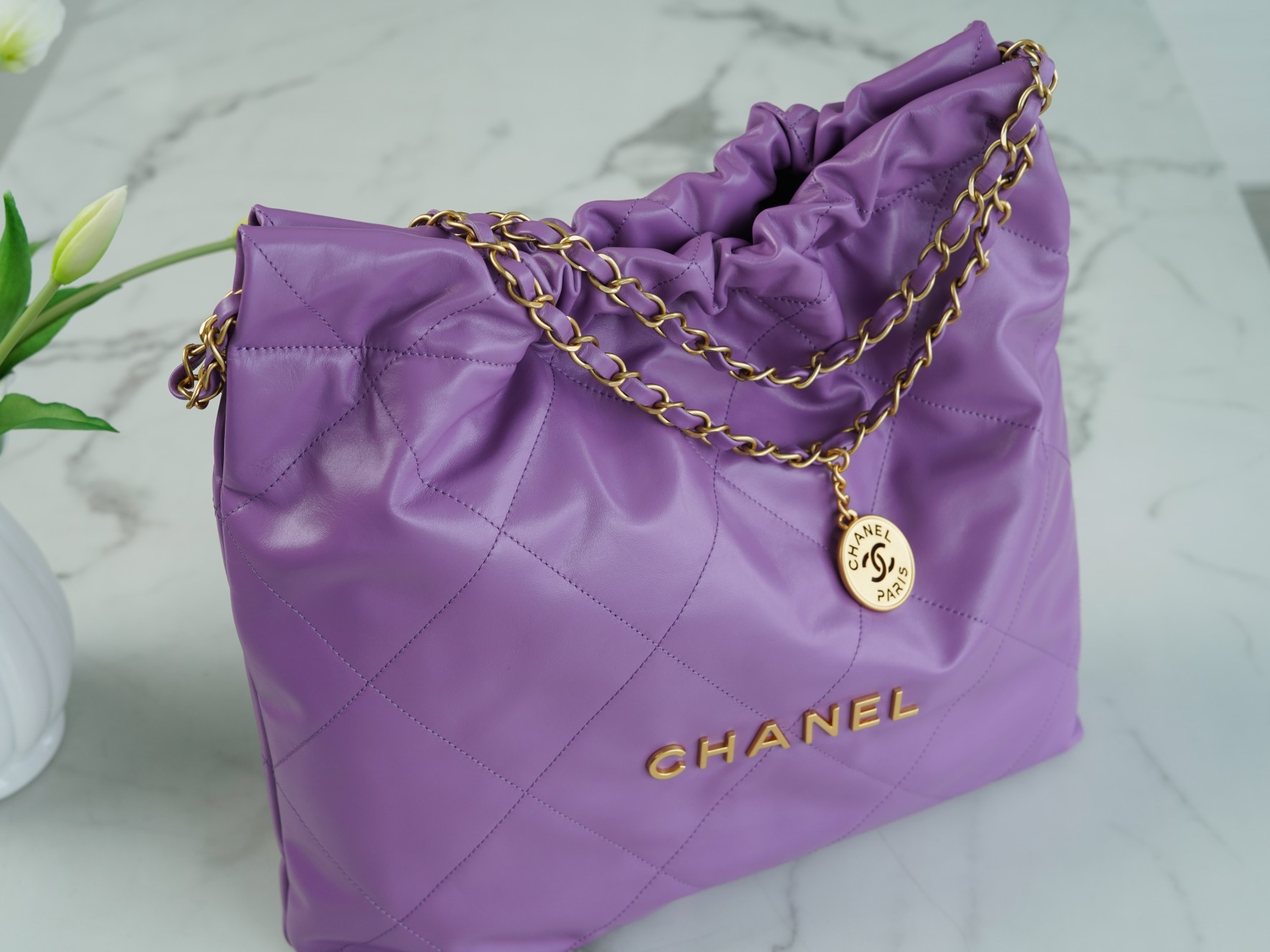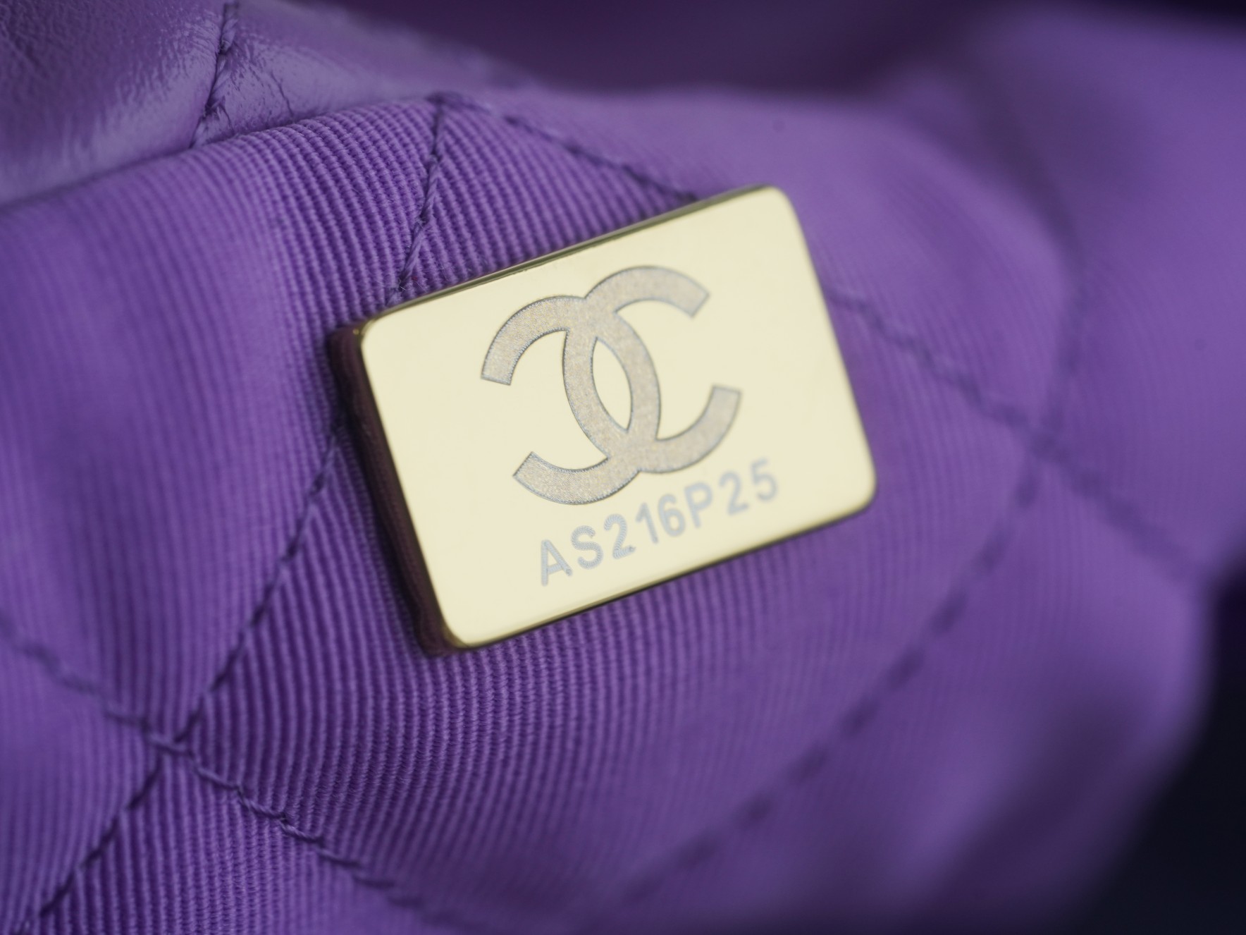 Chanel 22P Spring/Summer New Collection 22 Handbag in Medium Size, featuring a beautiful purple color. It is crafted using top-grade genuine Italian leather, known for its exquisite texture and glossy appearance. The leather is both soft and durable, offering the perfect combination of qualities. Despite its simple exterior, this handbag incorporates advanced designs from the fashion house, such as the hollowed-out Chanel logo gold coins. These delicate embellishments elevate the overall elegance to a higher level, exuding a nostalgic charm and a relaxed, carefree vibe.