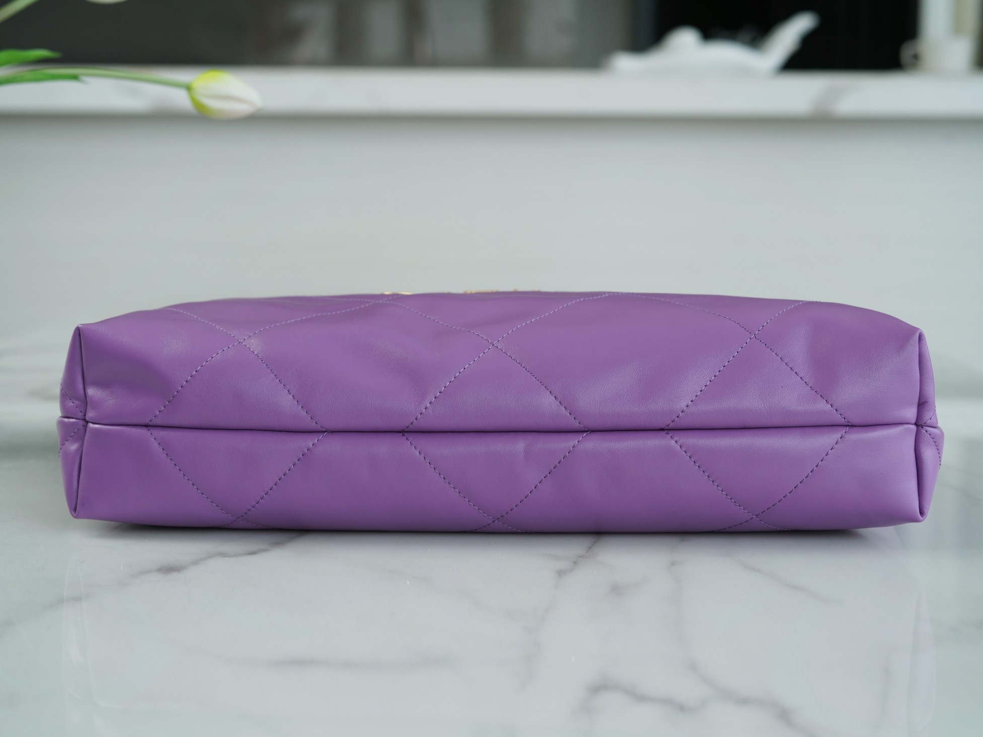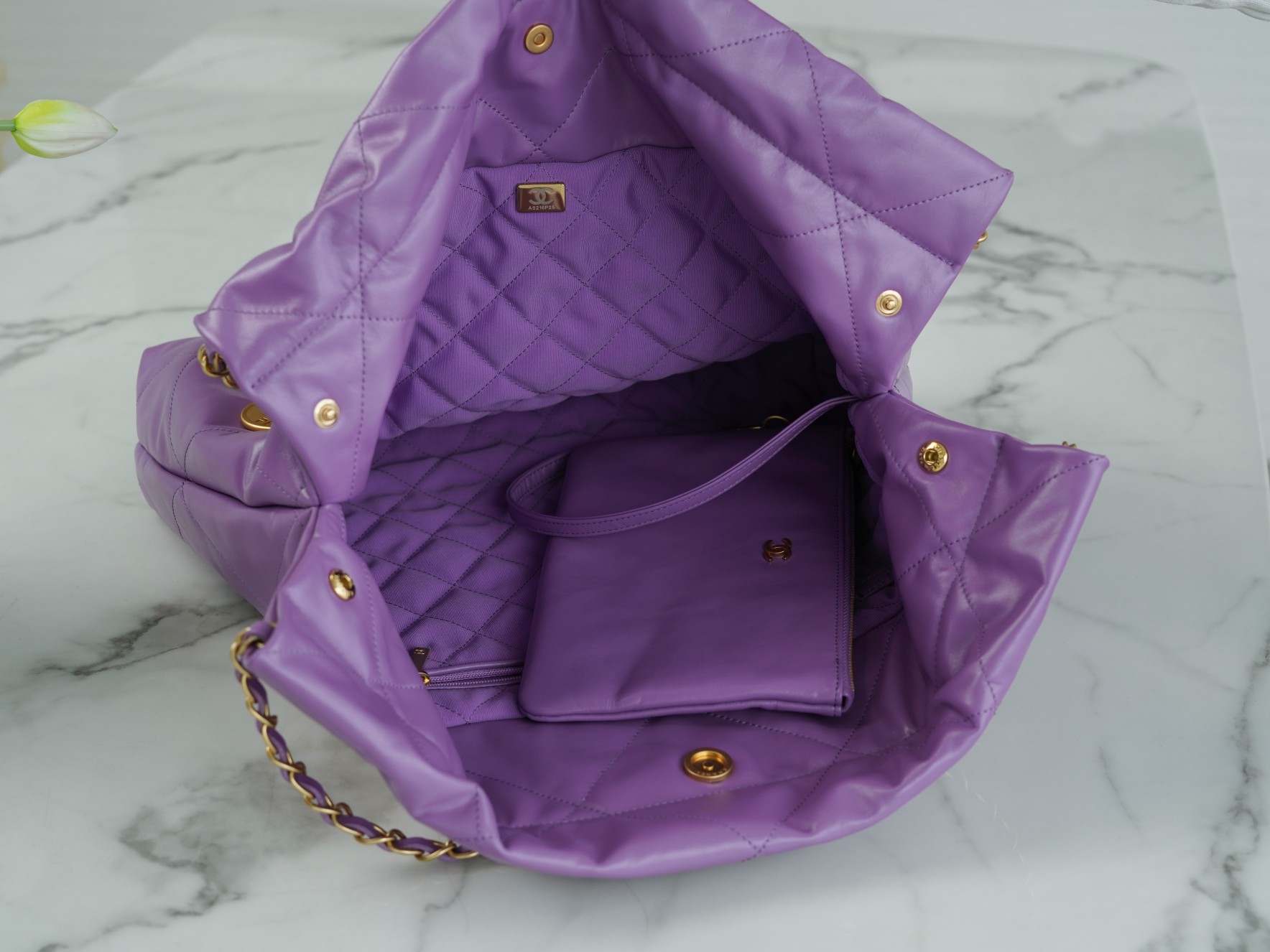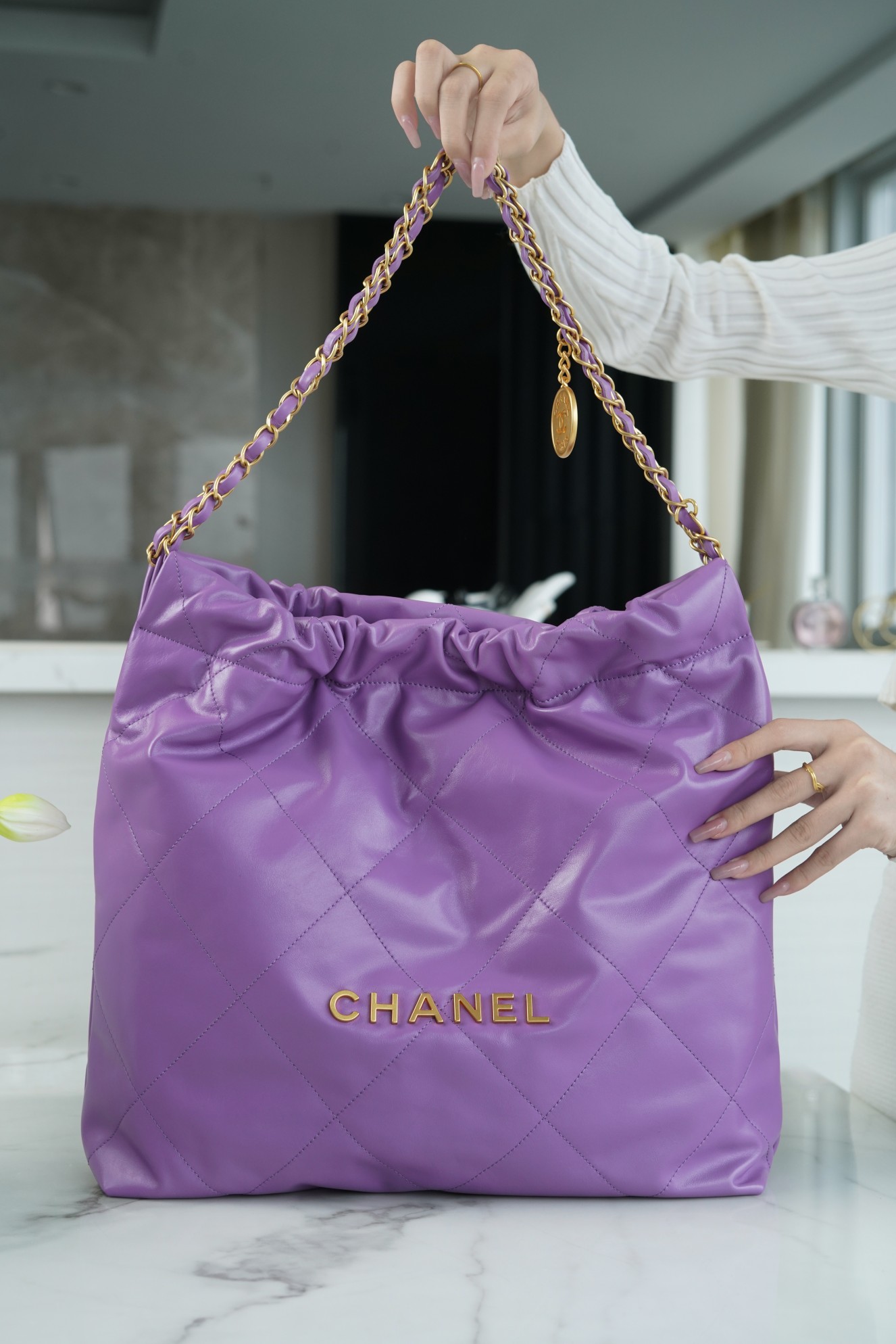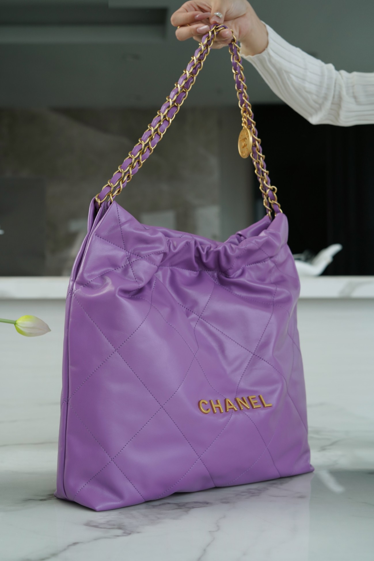 Chanel 22P Spring/Summer New Collection 22 Handbag in Medium Size, featuring a beautiful purple color. It is crafted using top-grade genuine Italian leather, known for its exquisite texture and glossy appearance. The leather is both soft and durable, offering the perfect combination of qualities. Despite its simple exterior, this handbag incorporates advanced designs from the fashion house, such as the hollowed-out Chanel logo gold coins. These delicate embellishments elevate the overall elegance to a higher level, exuding a nostalgic charm and a relaxed, carefree vibe.