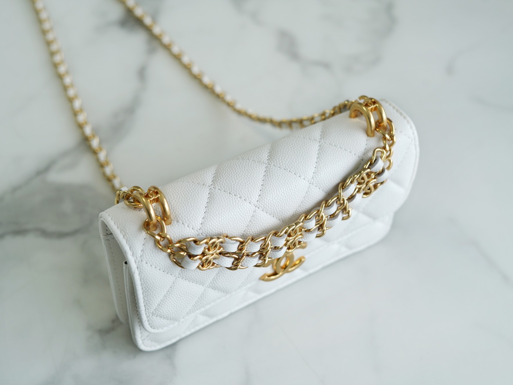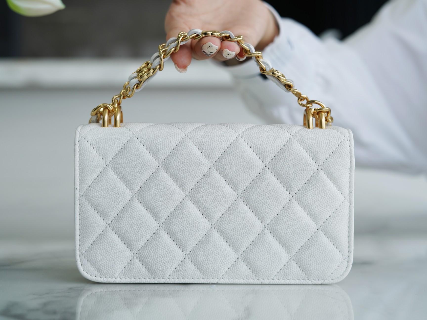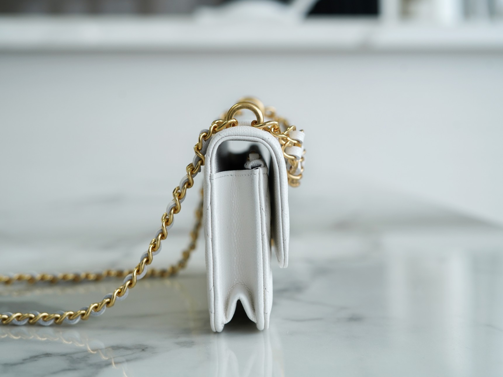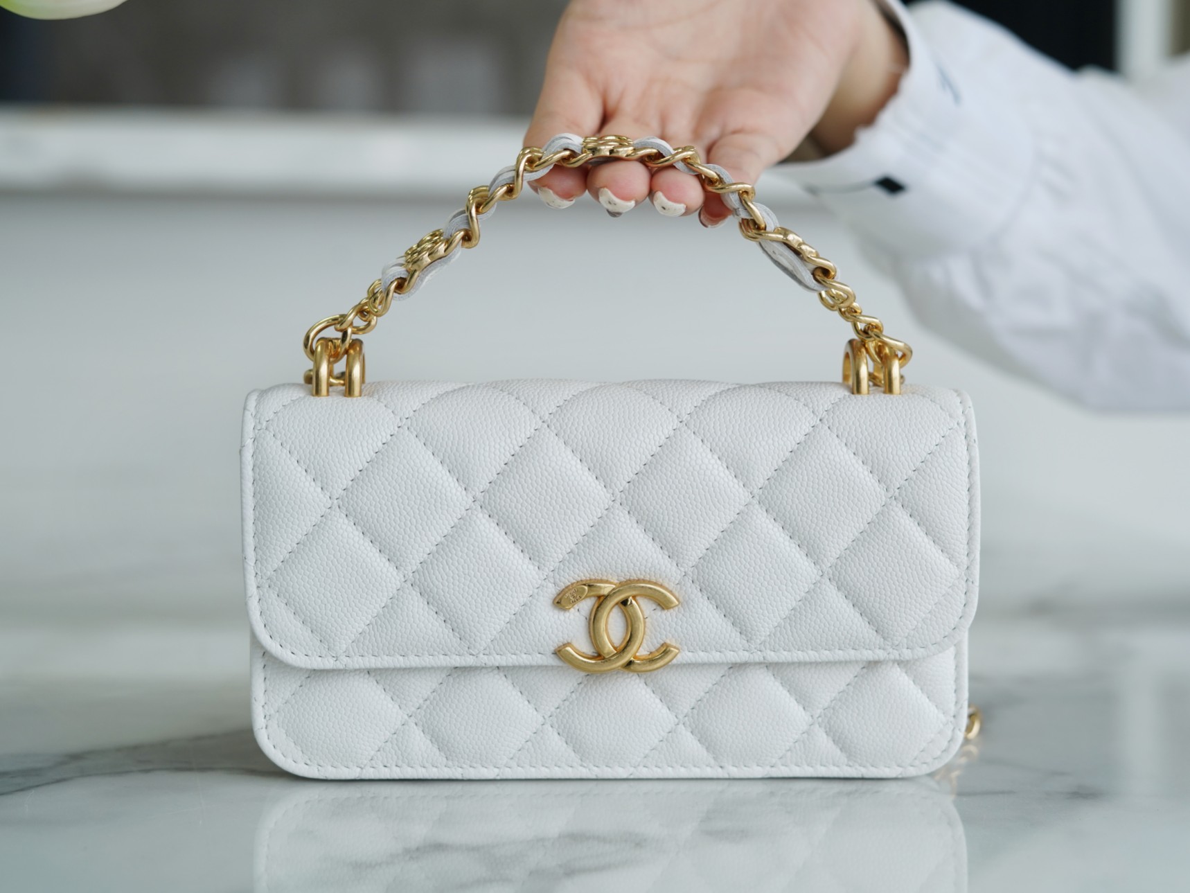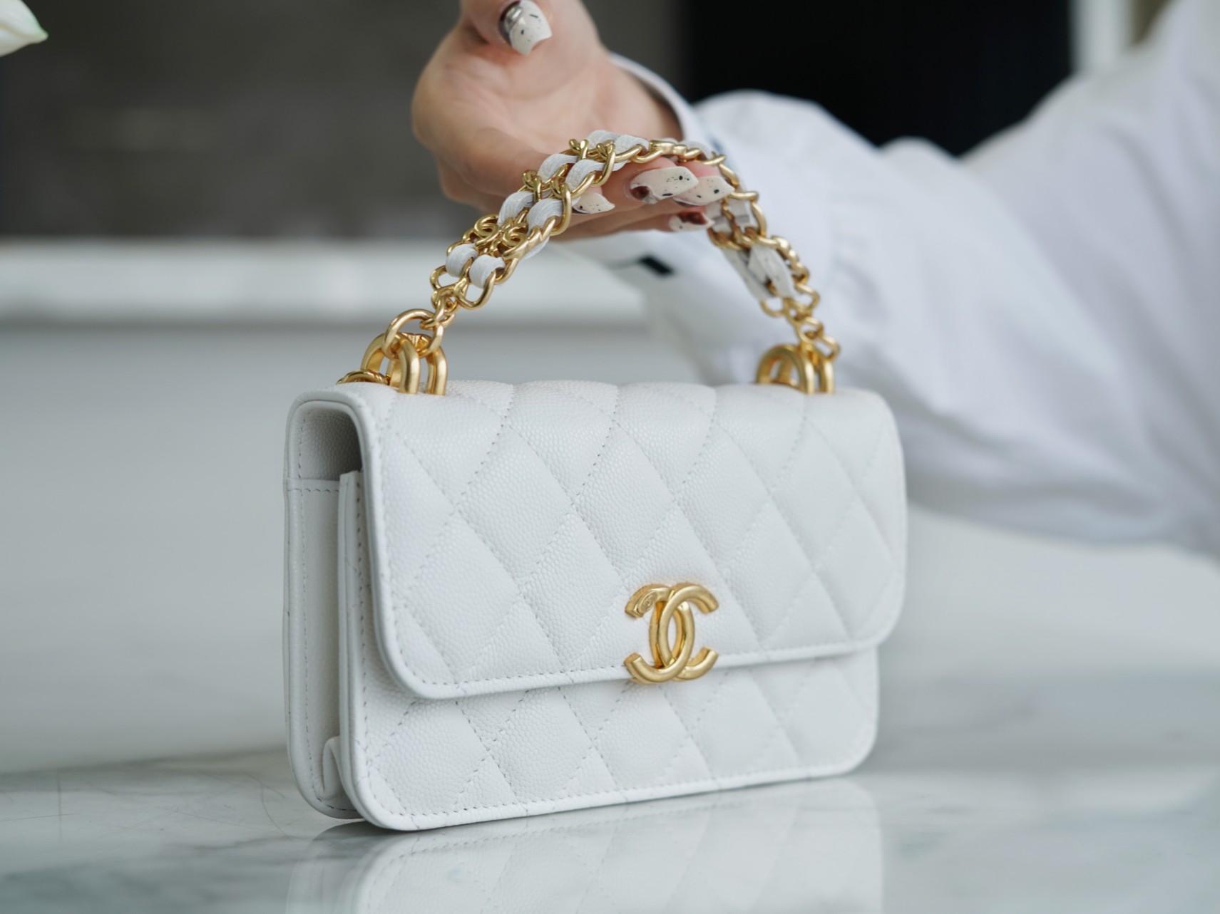 The CHANEL New Chain Mini WOC Phone Bag is the hottest item of the season. It is made with Italian grained calfskin, featuring a particularly stylish color. The mini size appears even more delicate, with enough space to easily fit a promax-sized phone . It showcases the classic CF bag shape with a large logo magnetic clasp and is complemented by a double C woven handle, breaking away from the traditional chain design. It exudes a rich autumn and winter charm while maintaining a vintage feel. It’s a classic piece that stands out from the crowd.