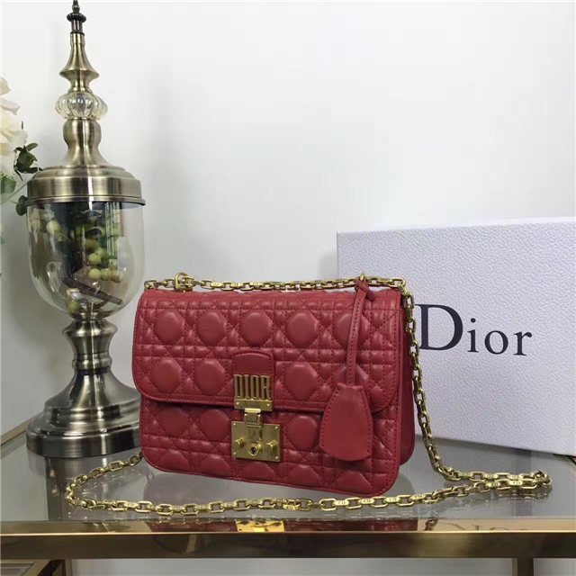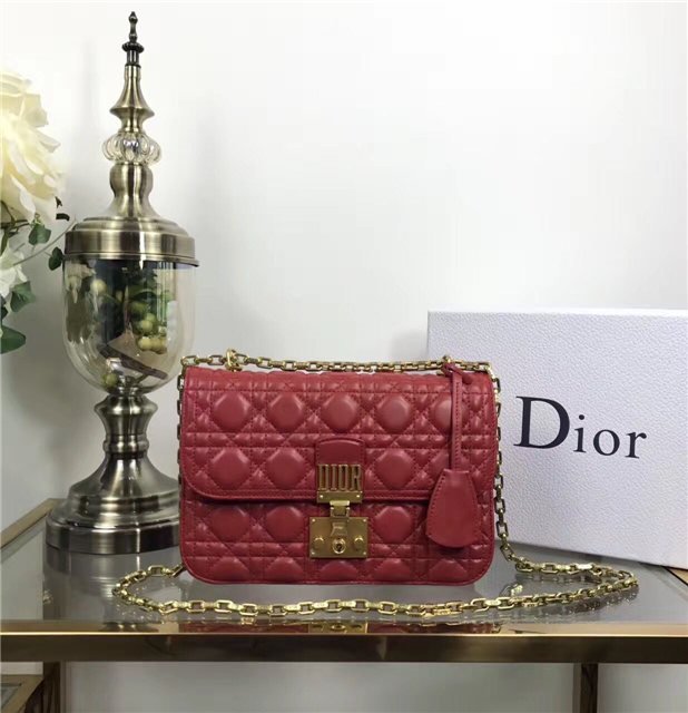 “Dioraddict” flap bag in Red Cannage lambskin, signature clasp and detachable chain in aged gold-tone metal.
