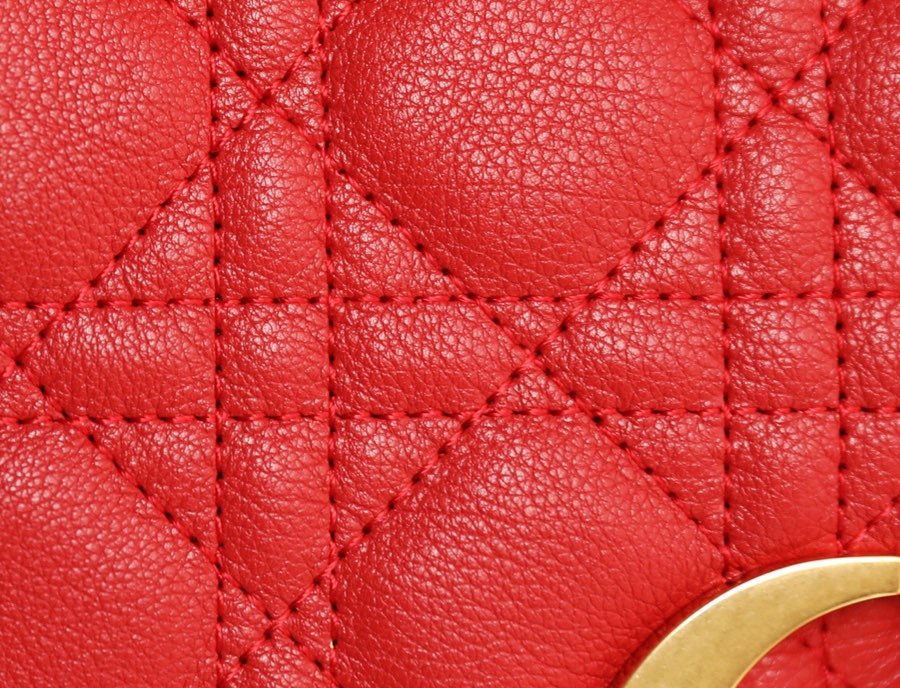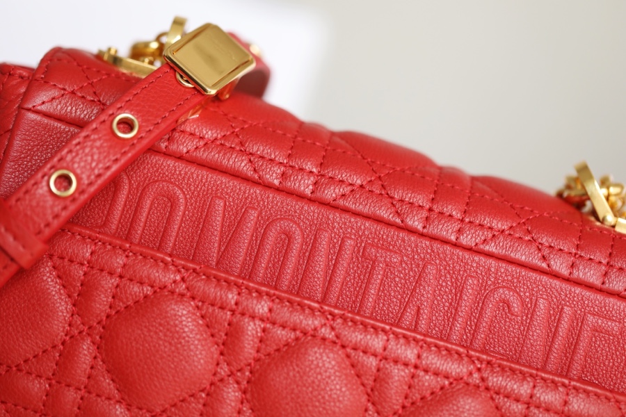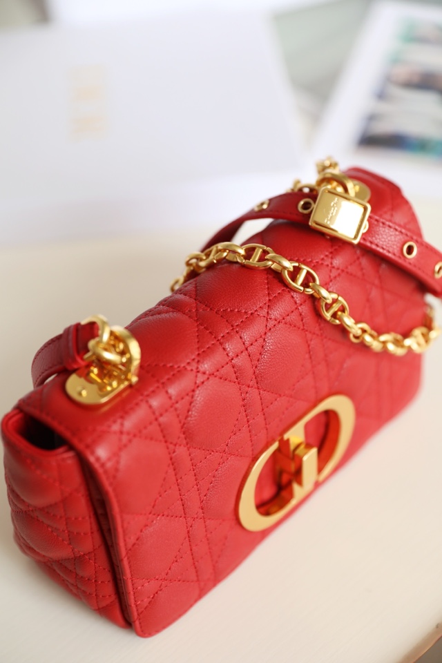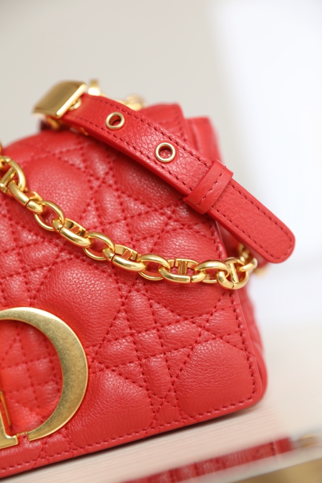 The Dior Caro handbag is meticulously crafted from red calfskin leather, featuring the iconic cane grid topstitching for intricate detailing. The material is soft, and the flap is adorned with a vintage gold-finished metal “CD” buckle, inspired by the closure of Christian Dior perfume bottles. It comes in a small size and can be paired with a detachable iconic “CD” chain shoulder strap, which can be replaced with a dragon embroidery wide shoulder strap for a more elegant and fashionable look. It effortlessly complements both daily outfits and evening parties.