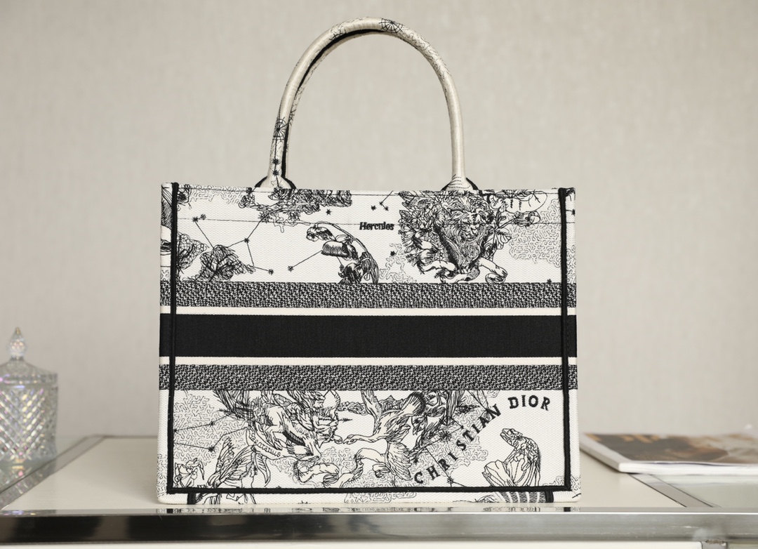 The Book Tote handbag is designed by Maria Grazia Chiuri, the creative director of Dior Women’s Collection. It is a flagship item that embodies Dior’s aesthetics. It incorporates Mr. Dior’s passion for astrology and reinterprets the iconic pattern with Zodiac Toile de Jouy embroidery throughout the body. It can hold various daily essentials. The small-sized version features the “CHRISTIAN DIOR” logo on the front, showcasing Dior’s signature exquisite craftsmanship. It can be carried by hand.