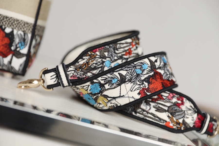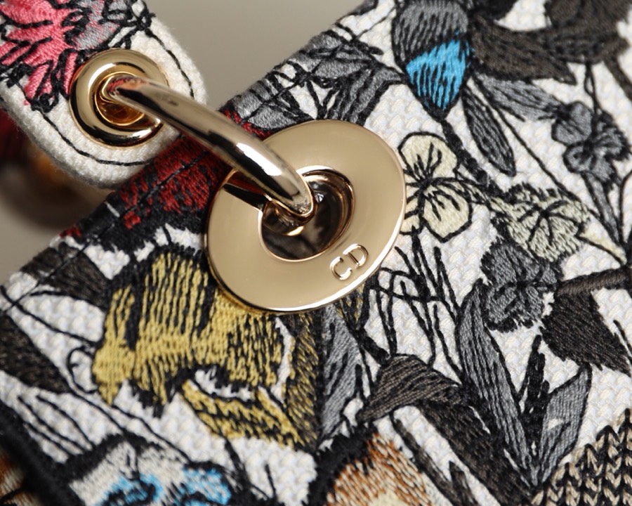 The Dior LADY handbag embodies Dior’s profound insight into elegance and beauty. It showcases a multi-color Dior Hibiscus pattern embroidery embellished with metallic thread, echoing the Pré-Columbian countryside theme of this season’s collection. The design is elegant and timeless, featuring a front adorned with the “Christian Dior” logo, complemented by a textured light gold-finish metal “D.I.O.R” charm and a detachable double-sided embroidered wide shoulder strap. This medium-sized style can be paired with other items from the Dior Hibiscus collection.