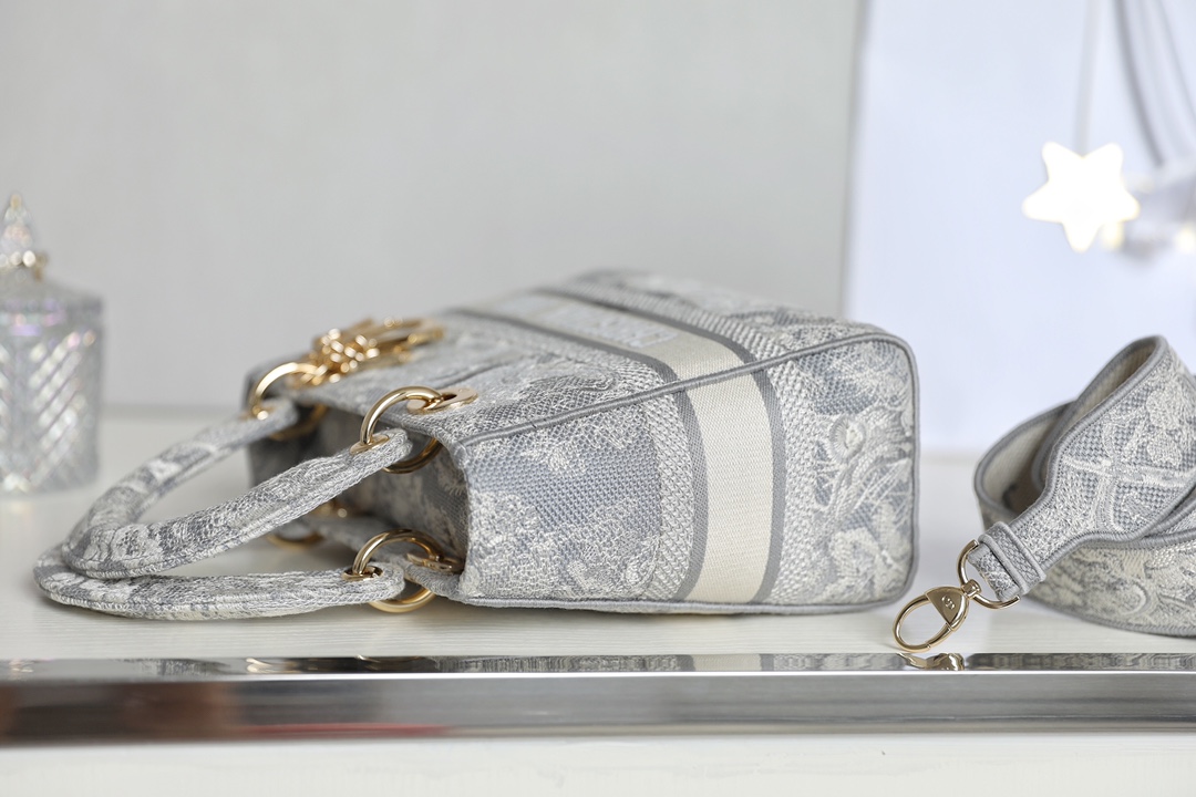 The Lady D-Lite handbag combines classic elegance with the fashionable style of the Dior brand. It is adorned with blue Reverse Ruyi embroidery, showcasing a new interpretation of Dior’s iconic pattern with a contrasting effect. The front is embellished with the “CHRISTIAN DIOR” logo and a textured light gold-finish metal “D.I.O.” charm, adding a touch of liveliness to the exquisite silhouette. This medium-sized style comes with a detachable reversible embroidered wide shoulder strap, allowing it to be carried by hand, worn on the shoulder, or crossbody. The detachable wide shoulder strap features a large zippered pocket on the inside for versatile pairing with other embroidered shoulder straps.
