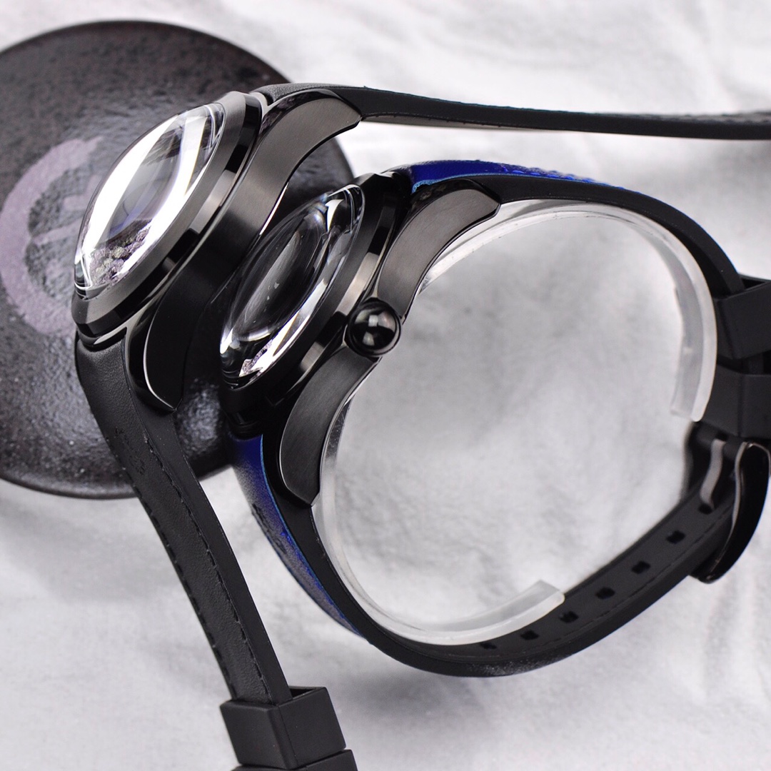 This is a Corum Bubble watch from the Kunlun Bubble series, returning with a brand new colored dial design. The new version of the watch has a diameter expanded to 46mm and features a spherical crown. It has a thickness of 18.8mm, with the crystal alone measuring 8mm. The towering crystal has a magnifying lens function, which can enlarge and distort the visual effect of the dial. The curved case fits closely to the wrist, ensuring the most comfortable wearing experience.