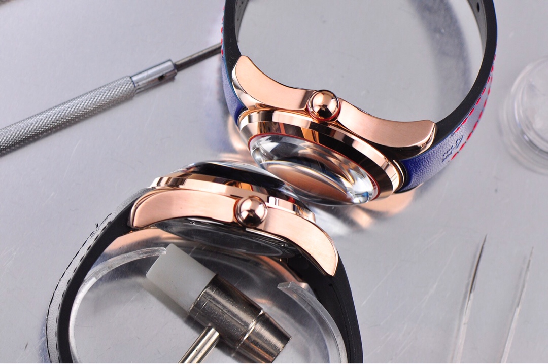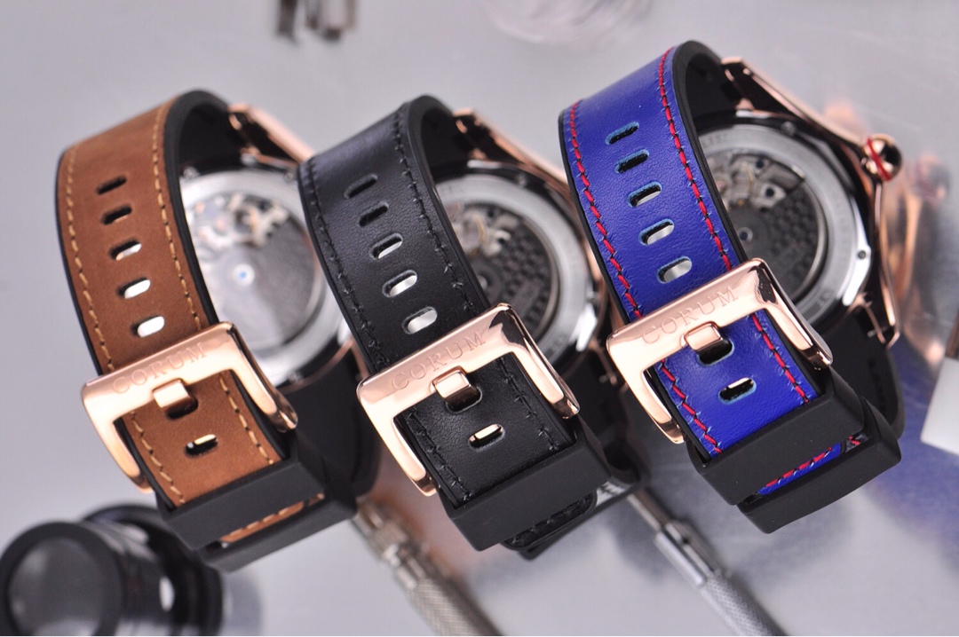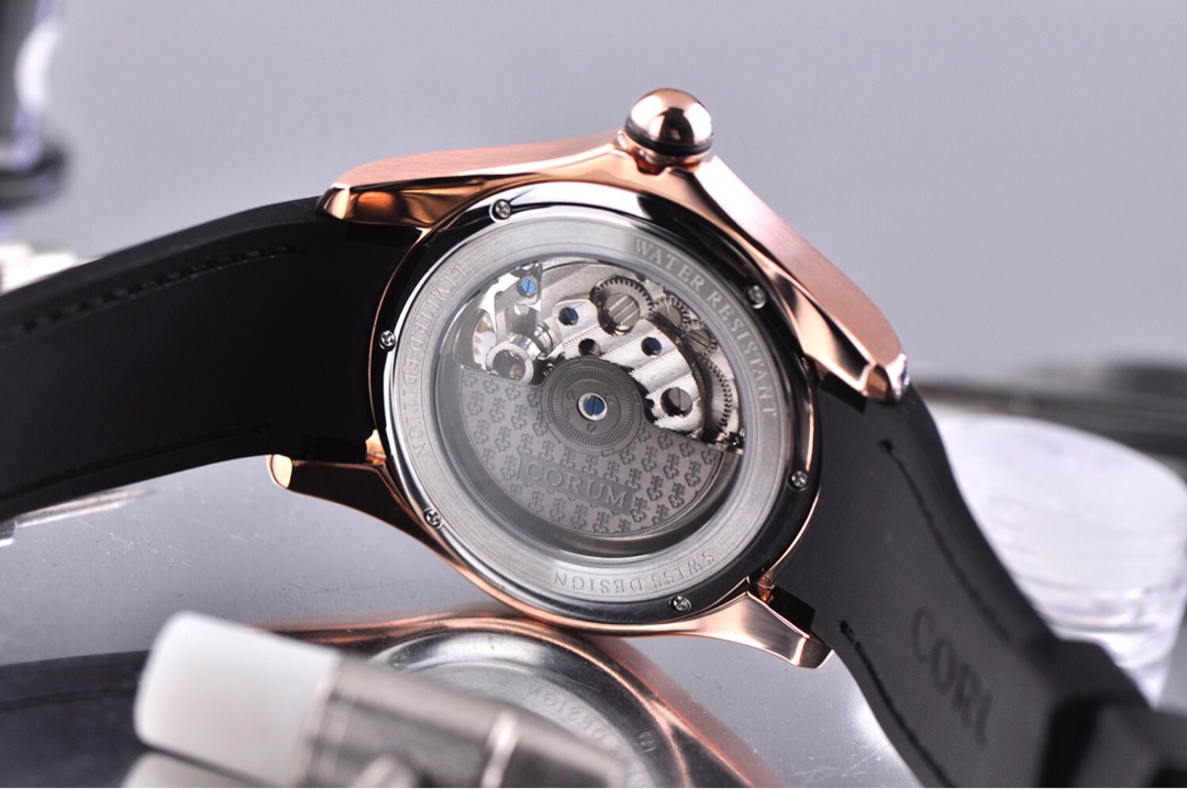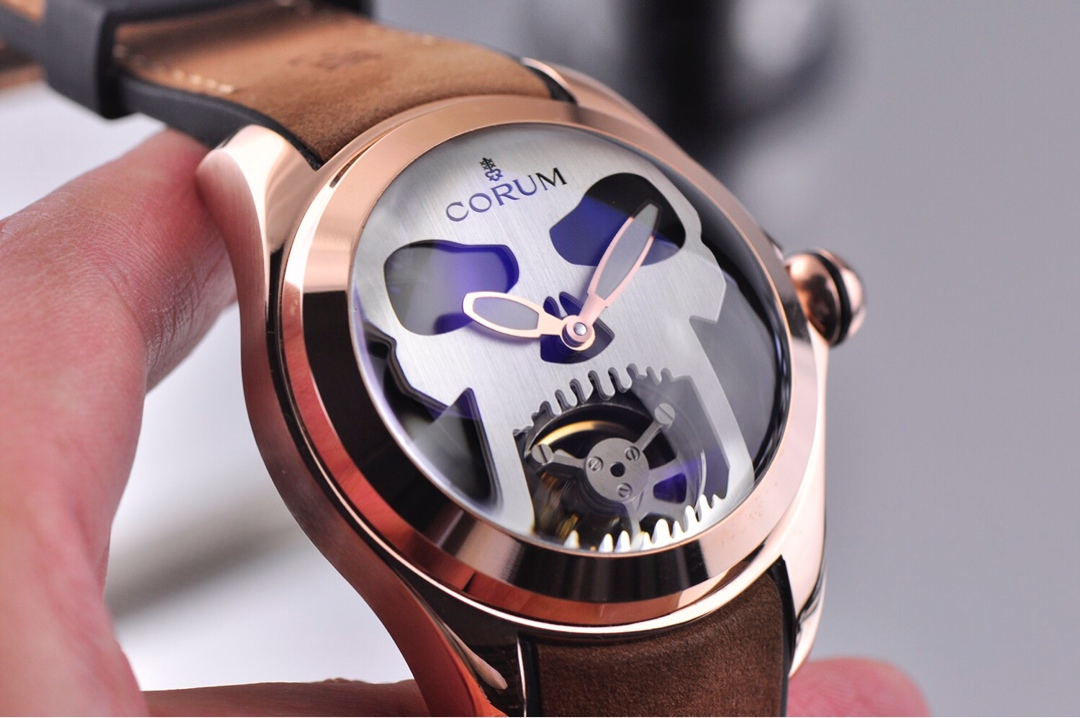 This is the CORUM Bubble series 46mm floating tourbillon watch. The mysterious skull totem on the dial, surrounded by a shiny and vibrant rose gold case, with the deep hollow eye sockets of the skull gazing at the wearer. The open jaw of the skull houses a floating tourbillon, as if piercing through the sharply defined skull, showcasing the fascinating top-level watchmaking craftsmanship and the micro-mechanical world of CORUM. The arched anti-reflective coated sapphire crystal, paired with a black glossy leather strap, directs the focus to the skull pattern, creating a striking and unforgettable presence on the wrist, exuding a sense of hidden elegance.