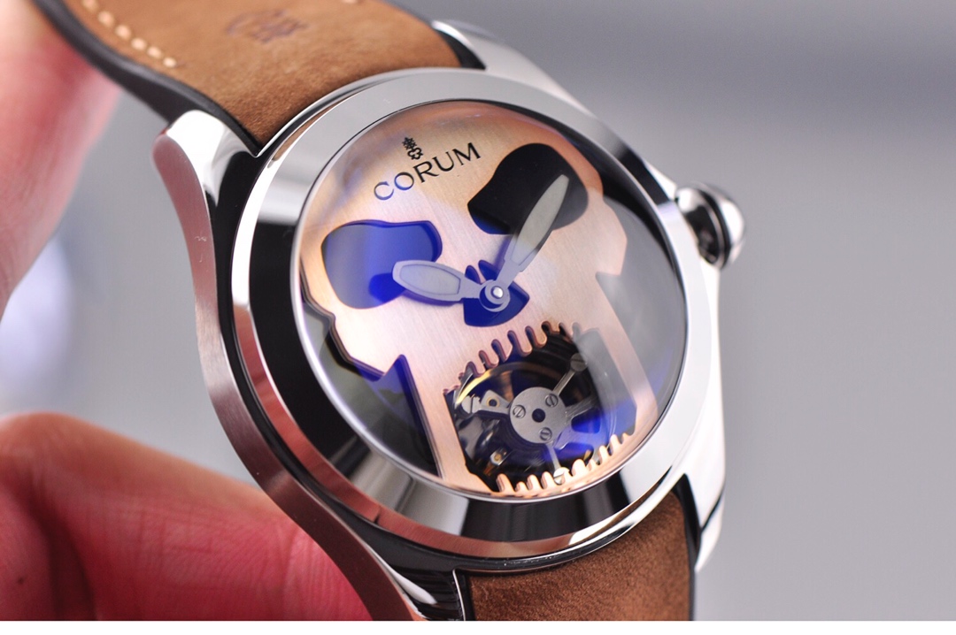 This is the CORUM Bubble series 46mm floating tourbillon watch. The mysterious skull totem on the dial, surrounded by a shiny and vibrant rose gold case, with the deep hollow eye sockets of the skull gazing at the wearer. The open jaw of the skull houses a floating tourbillon, as if piercing through the sharply defined skull, showcasing the fascinating top-level watchmaking craftsmanship and the micro-mechanical world of CORUM. The arched anti-reflective coated sapphire crystal, paired with a black glossy leather strap, directs the focus to the skull pattern, creating a striking and unforgettable presence on the wrist, exuding a sense of hidden elegance.