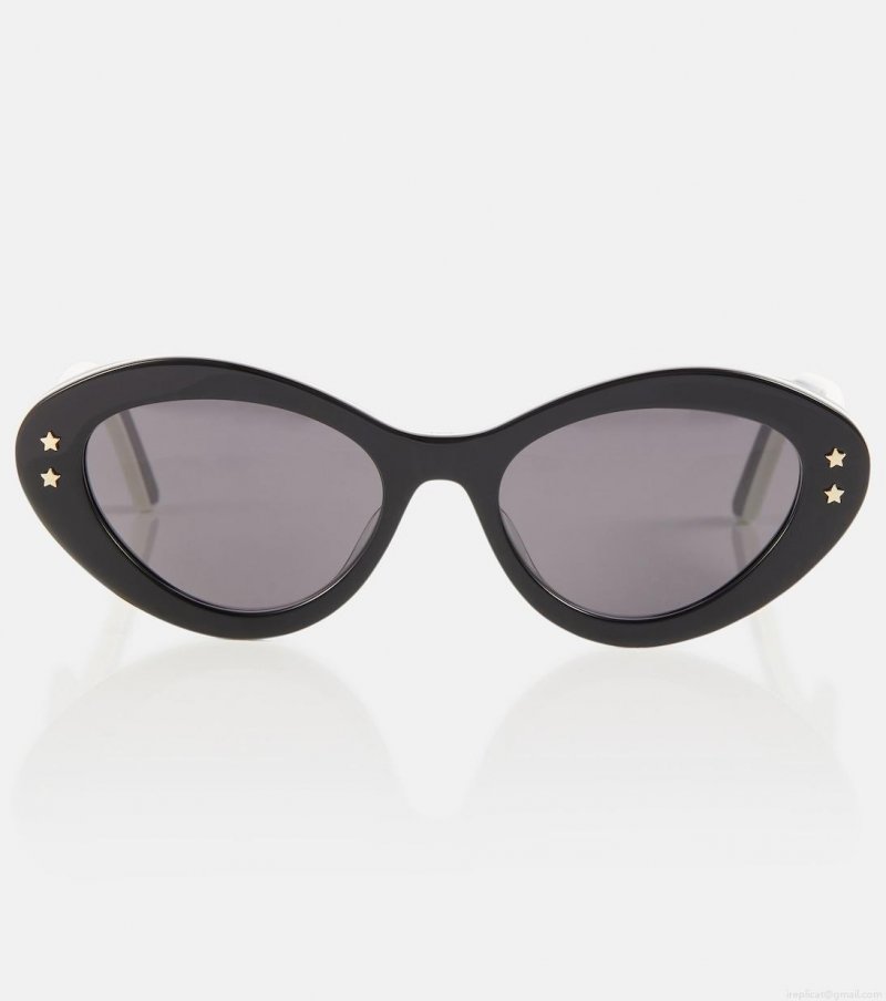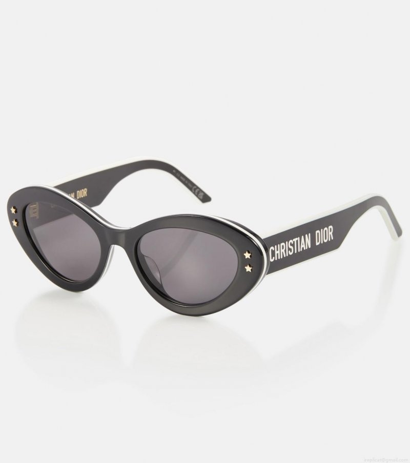The DiorPacific B1U sunglasses have a distinctive butterfly shape and white-edged black acetate frames with golden star accents. They're finished with bold Dior Eyewear lettering on the temples.