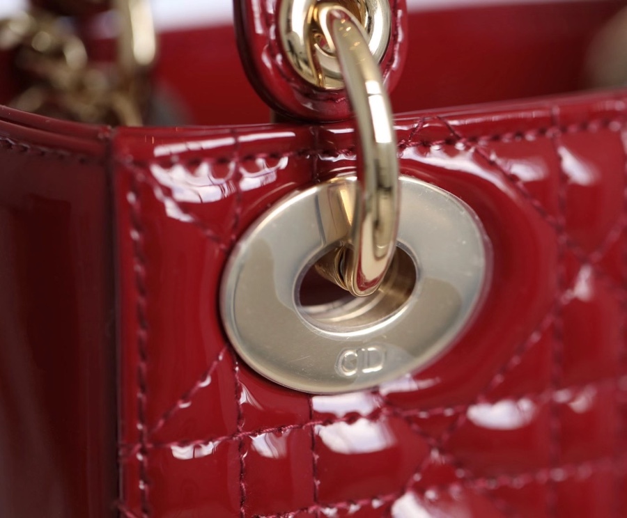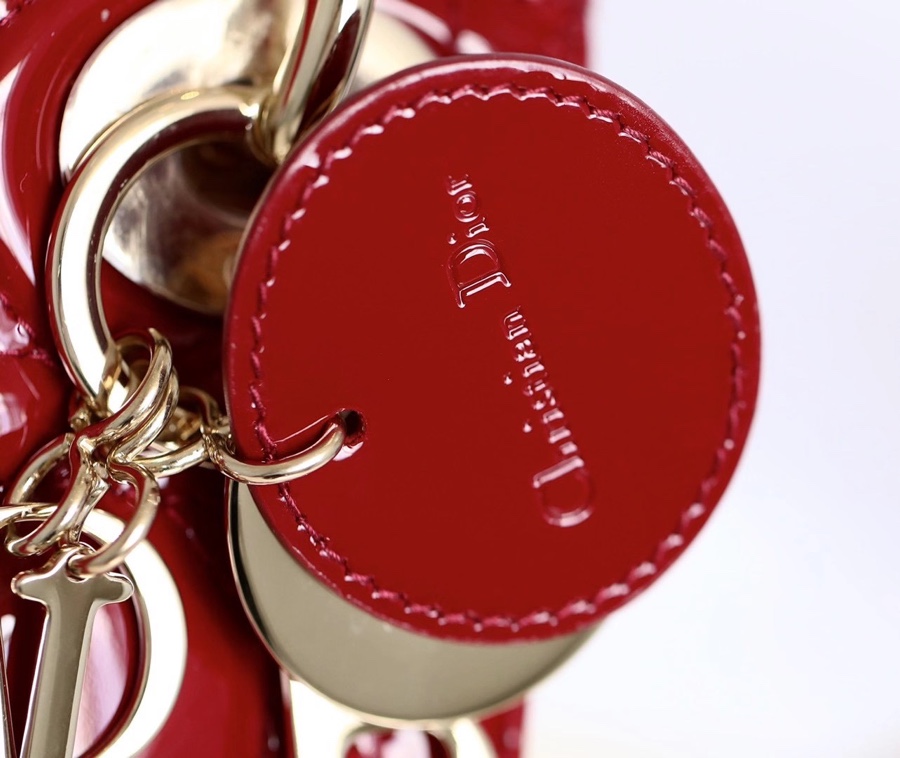 Lady Dior Cannage Wicker Pattern Patent Leather Mini Bag, featuring a chain strap and light gold-tone metal accents, comes with a long detachable chain strap.