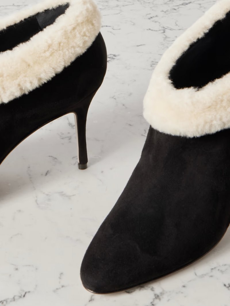 - Black suede (Goat), off-white shearling (Lamb)
