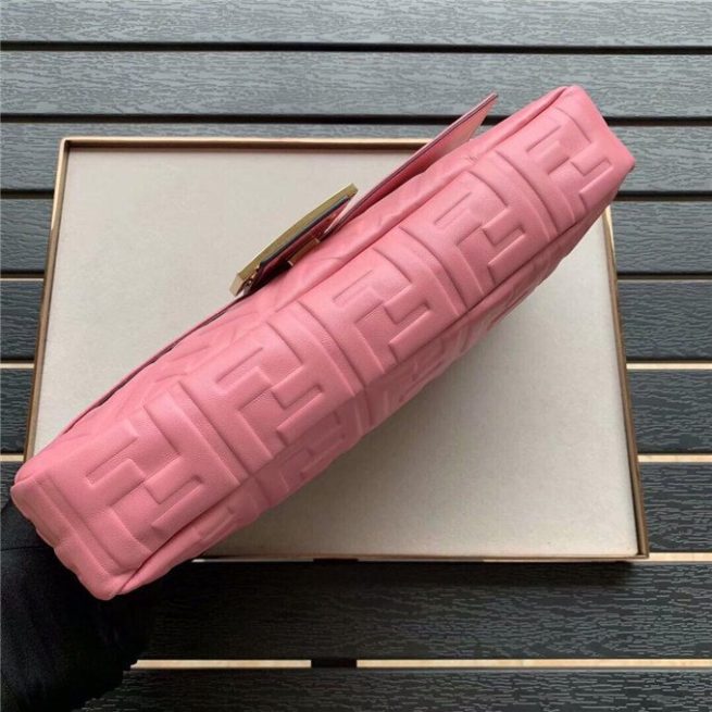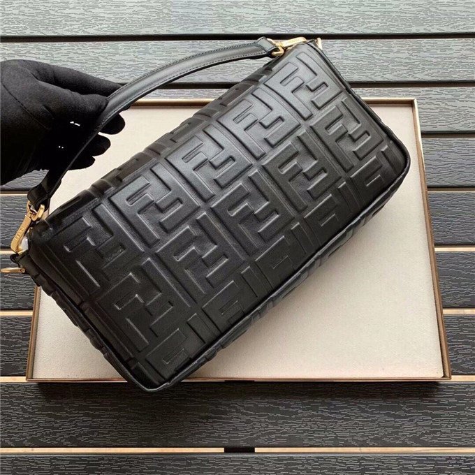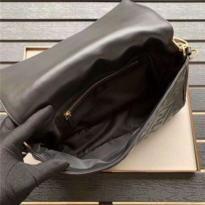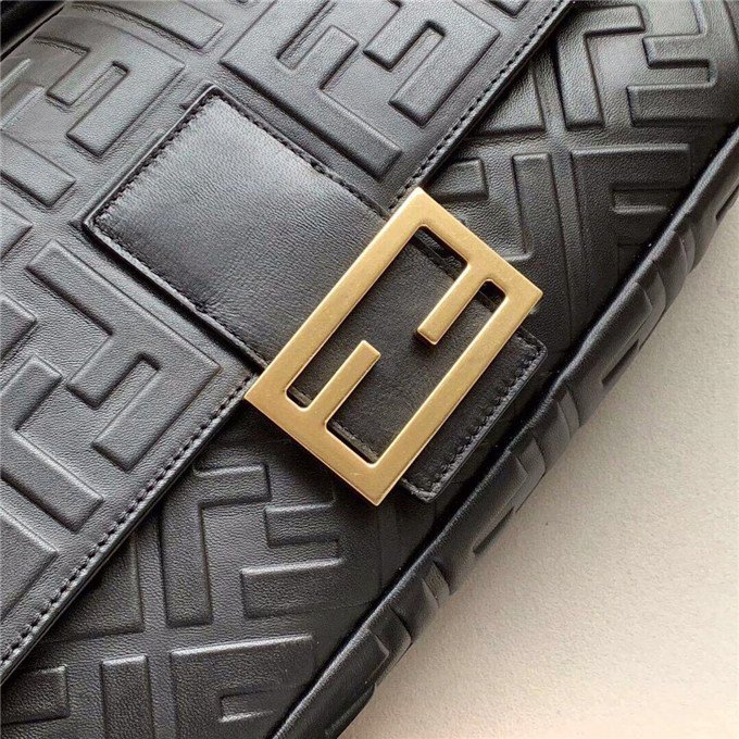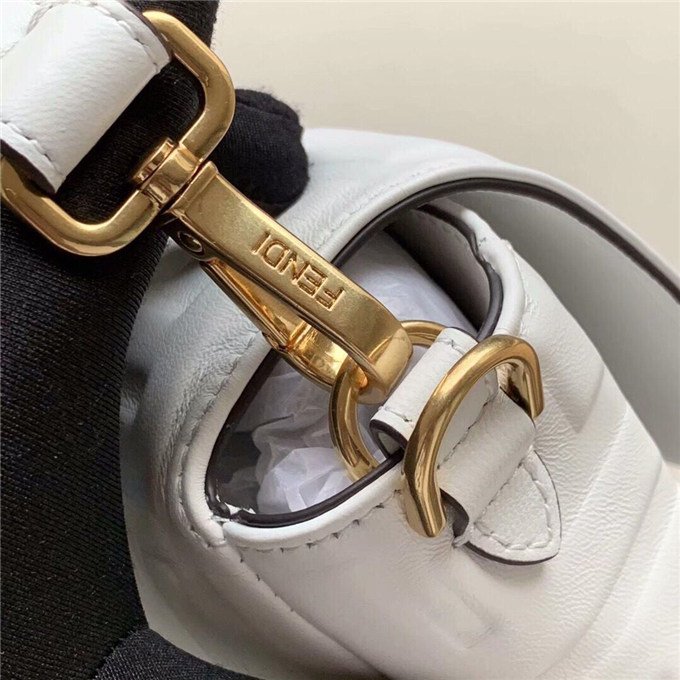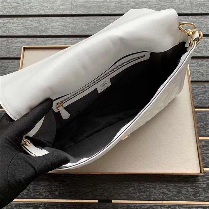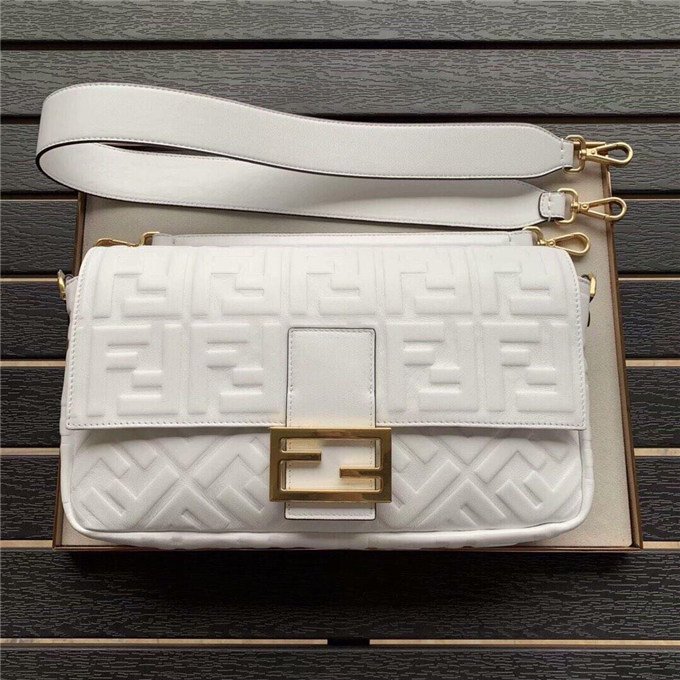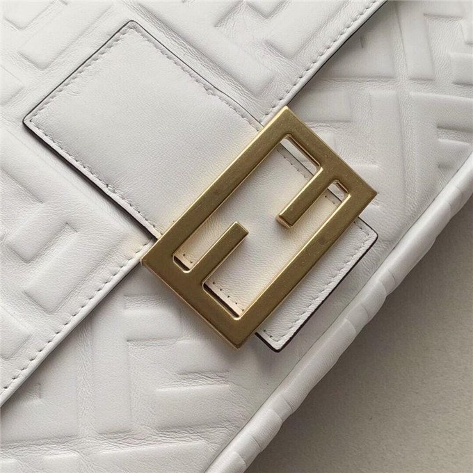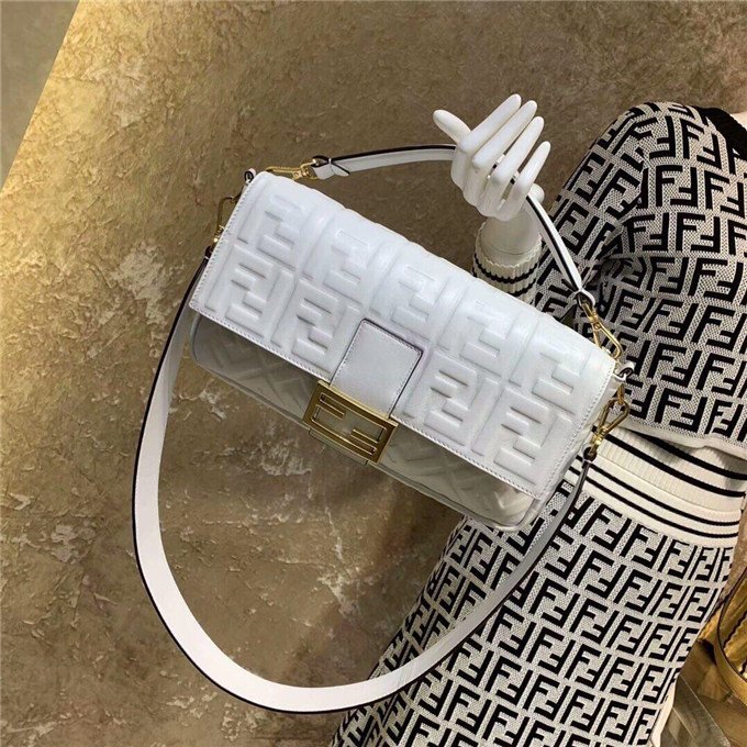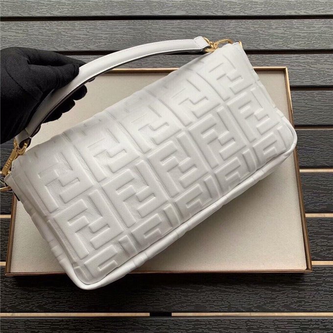 Iconic Baguette bag in large size, with flap and FF fastening with magnetic clasp. Lining with zip pocket. Can be carried by hand or worn cross-body thanks to its handle and shoulder strap, both detachable. Made of white lambskin with an all-over FF motif in a soft, three-dimensional texture. Gold-finish metalware.
