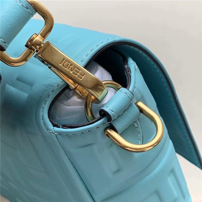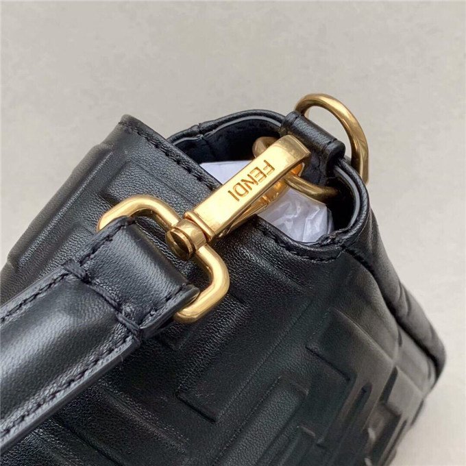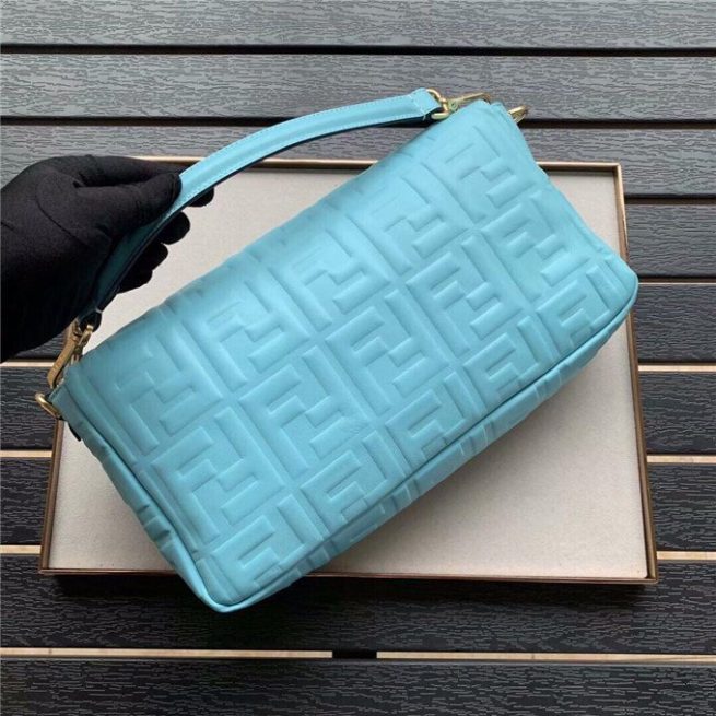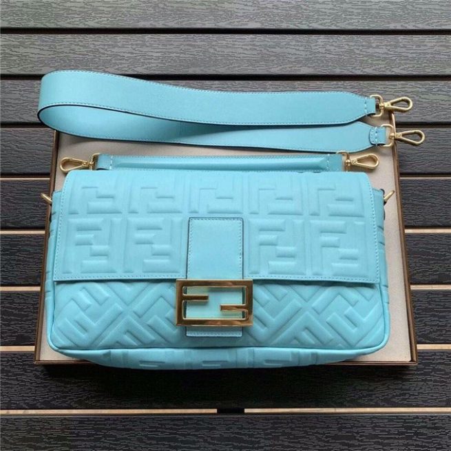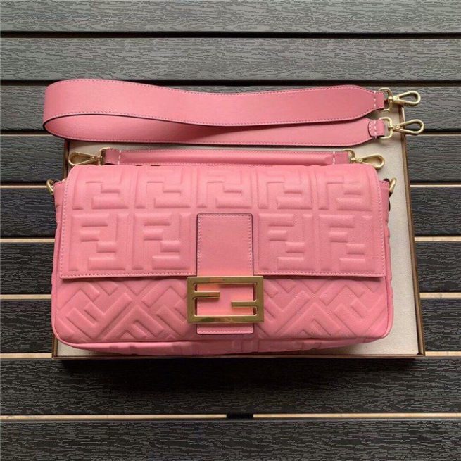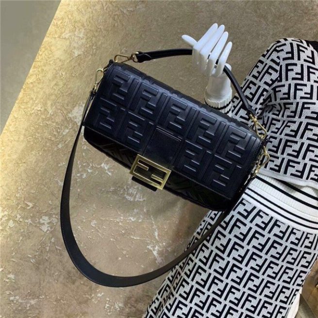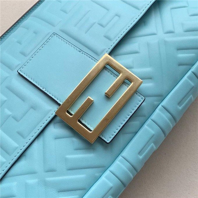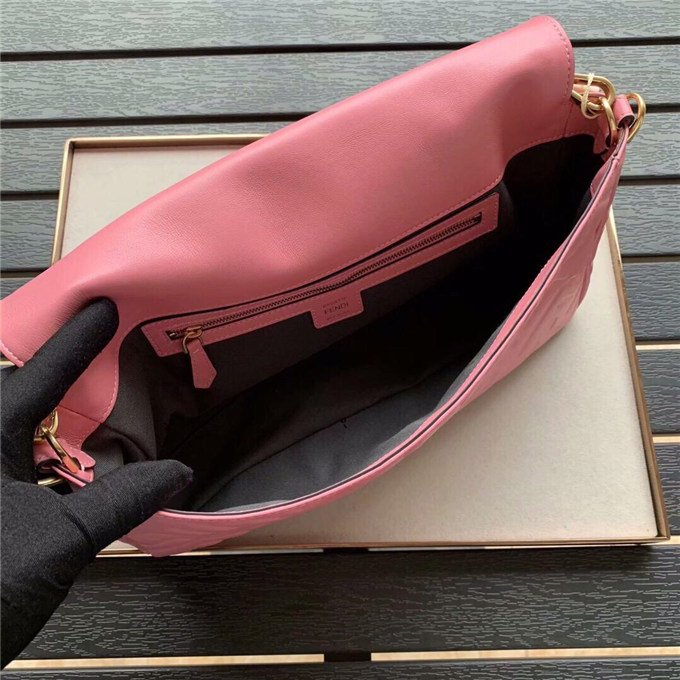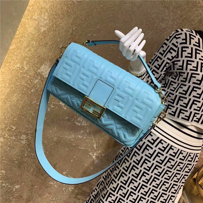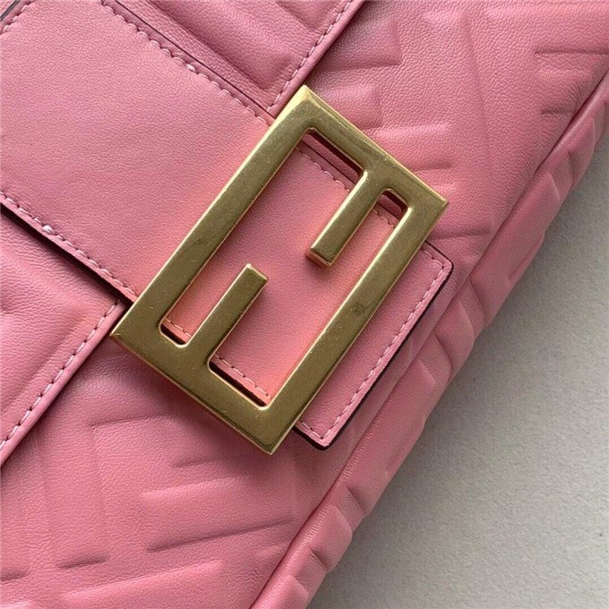Iconic Baguette bag in large size, with flap and FF fastening with magnetic clasp. Lining with zip pocket. Can be carried by hand or worn cross-body thanks to its handle and shoulder strap, both detachable. Made of white lambskin with an all-over FF motif in a soft, three-dimensional texture. Gold-finish metalware.