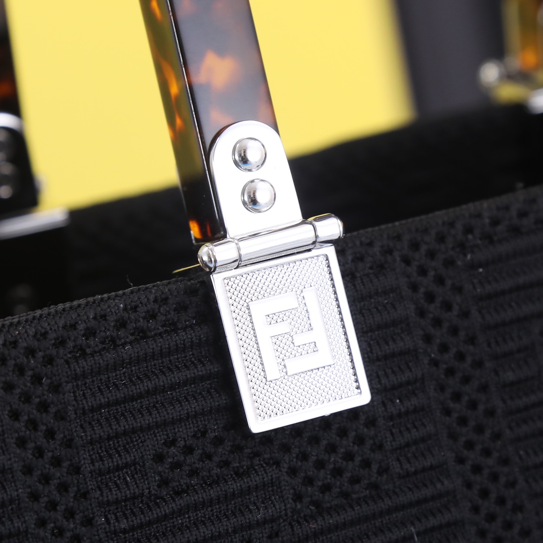 Fendi x Skims joint capsule collection limited edition Fend1 Tote features a high-tech mesh fabric with a 3D texture FF pattern. The standout feature of the entire bag is the amber-colored double handles, which can be twisted for a stylish and comfortable grip. It also comes with a wide shoulder strap. The overall vintage feel makes it perfect for fashion enthusiasts who love retro styles. Highly recommended!