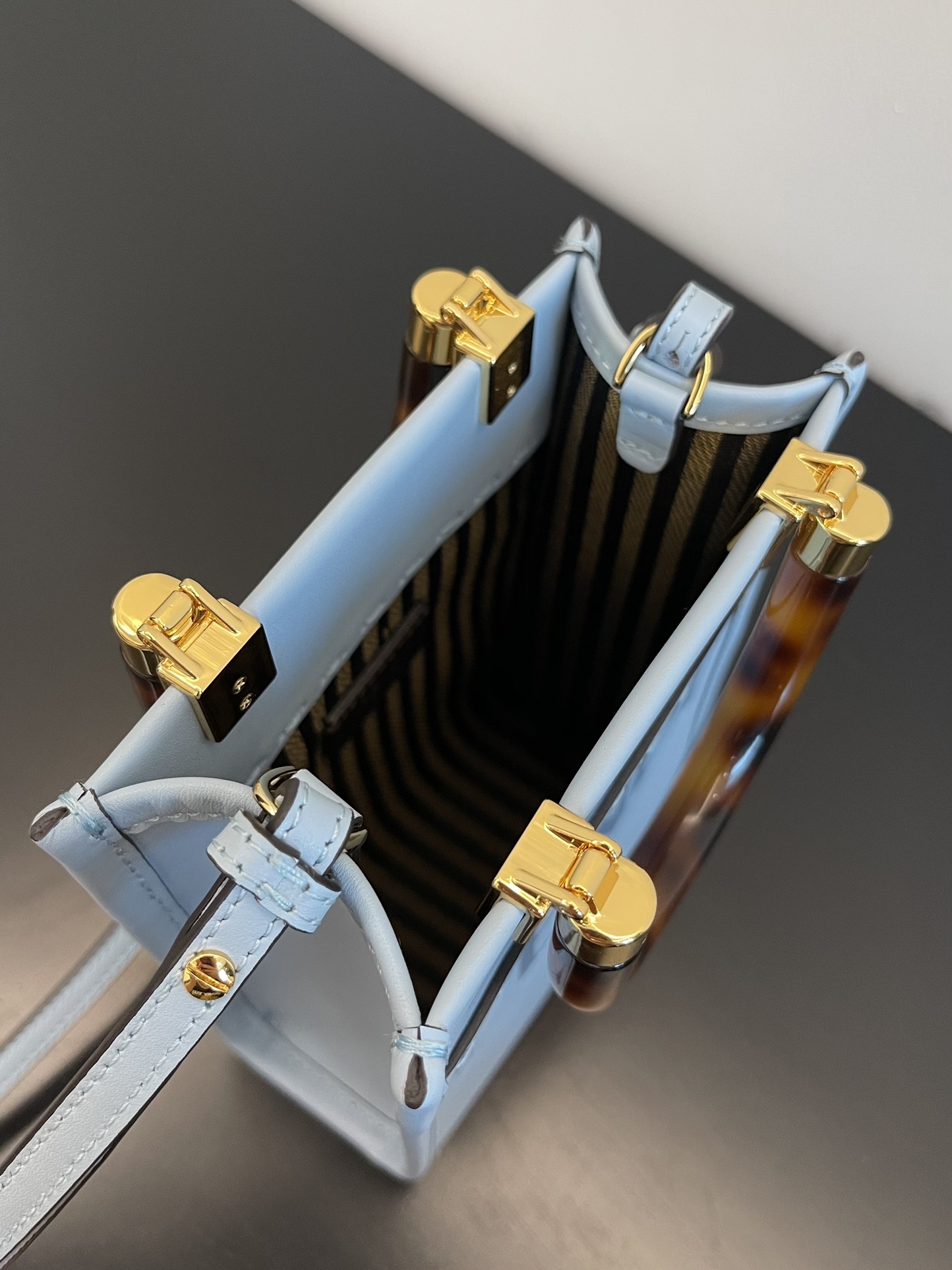 Introducing the FENDI Sunshine Mini Tortoiseshell Tote, a super exquisite mini tote bag featuring a tortoiseshell handle. It is undoubtedly the must-have “it” bag of the year! Don’t be fooled by its small size, as it can fit all your essential belongings for when you’re on the go. This adorable little bag is truly irresistible.