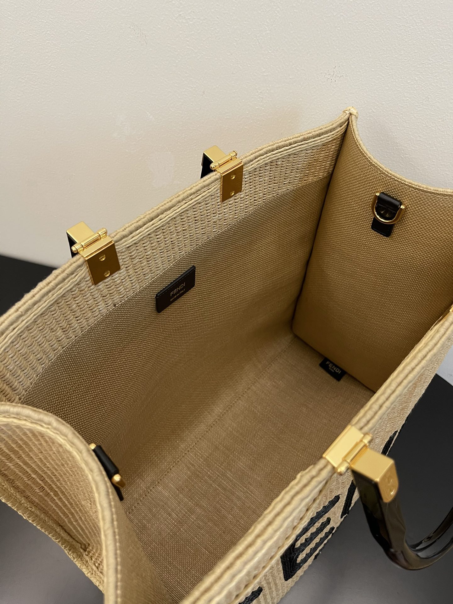 Introducing the FEND1 Sunshine Woven Tote Bag, handcrafted from raffia grass, exuding a vacation vibe. Its spacious capacity makes you feel like you can fit the entire summer inside, and its large size and fashionable appearance make it the perfect choice for fashionistas on their travels!