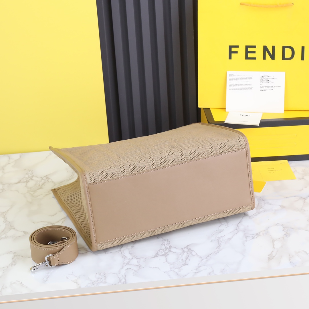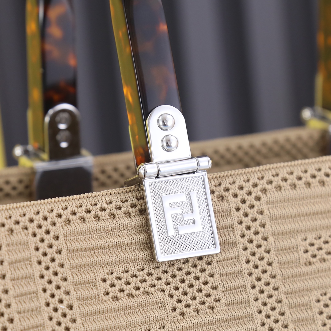 Fendi x Skims joint capsule collection limited edition Fend1 Tote features a high-tech mesh fabric with a 3D texture FF pattern. The standout feature of the entire bag is the amber-colored double handles, which can be twisted for a stylish and comfortable grip. It also comes with a wide shoulder strap. The overall vintage feel makes it perfect for fashion enthusiasts who love retro styles. Highly recommended!