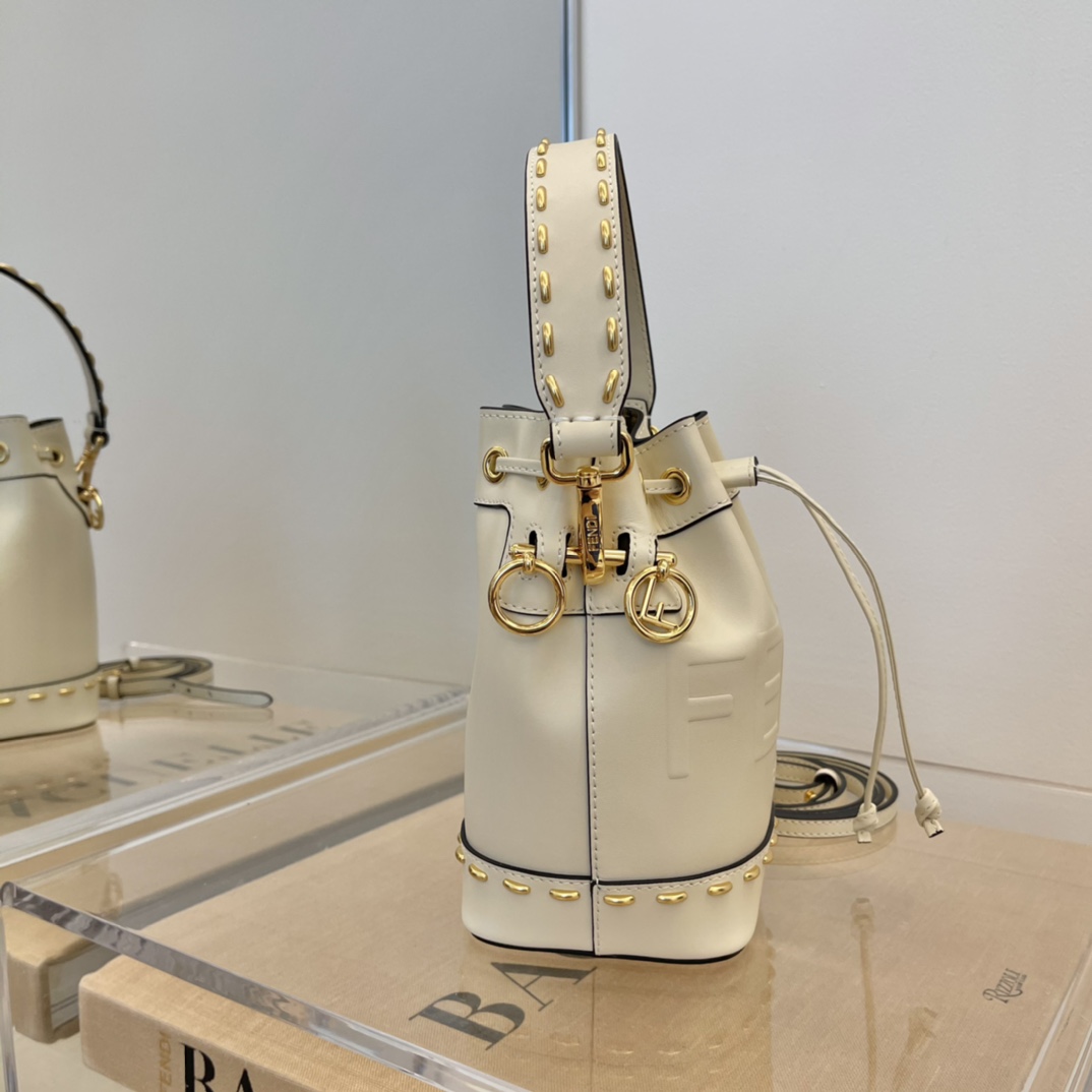 Introducing the FENDI Mon Trésor bucket bag, a petite and stylish accessory that can be worn diagonally across the shoulder, serving as a decorative piece. Compared to the mature look of the classic double F logo, this small white bag with a large logo and metallic accents exudes simplicity and versatility.