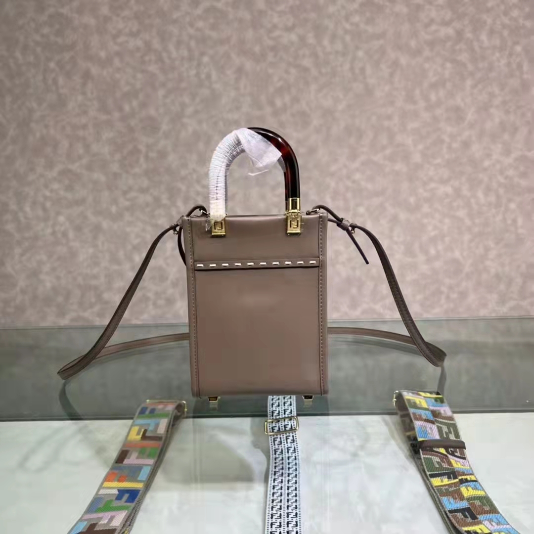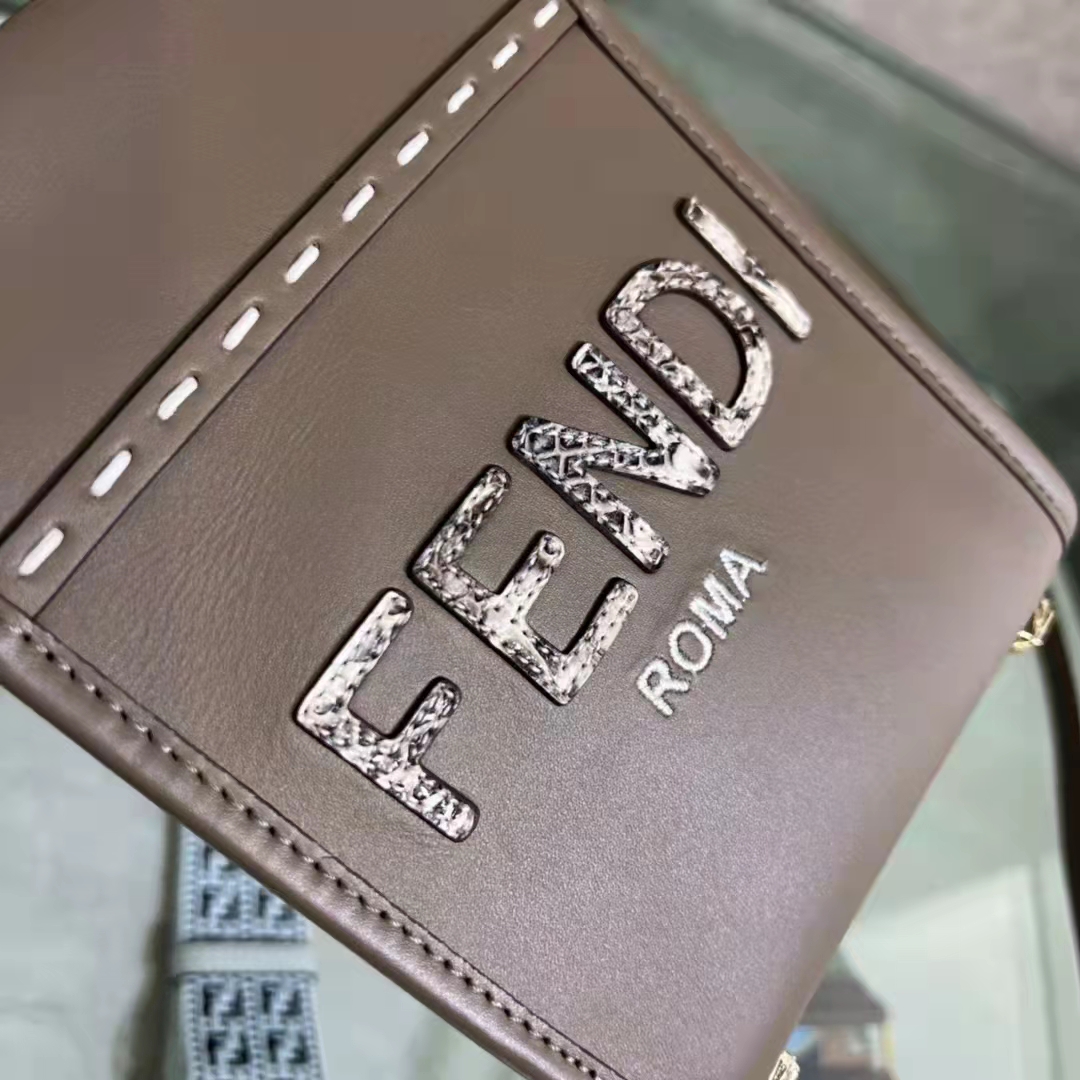 Mini Sunshine Shopper bag made of gray leather with FENDI ROMA lettering in python-look printed elaphe and stiff tortoiseshell-effect plexiglass handles.