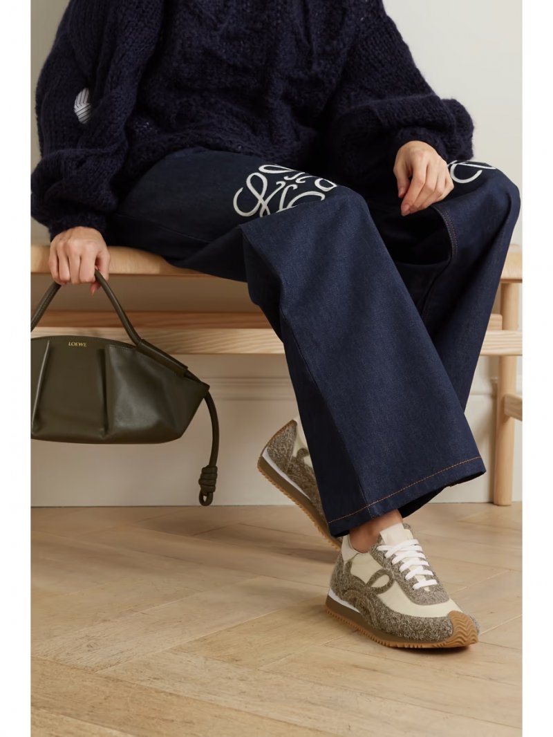 - Cream shell, army-green suede, off-white leather