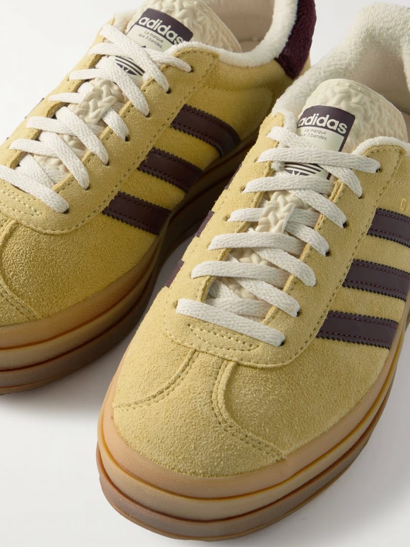 - Yellow suede (Pig), burgundy and white leather (Cow), burgundy terrycloth