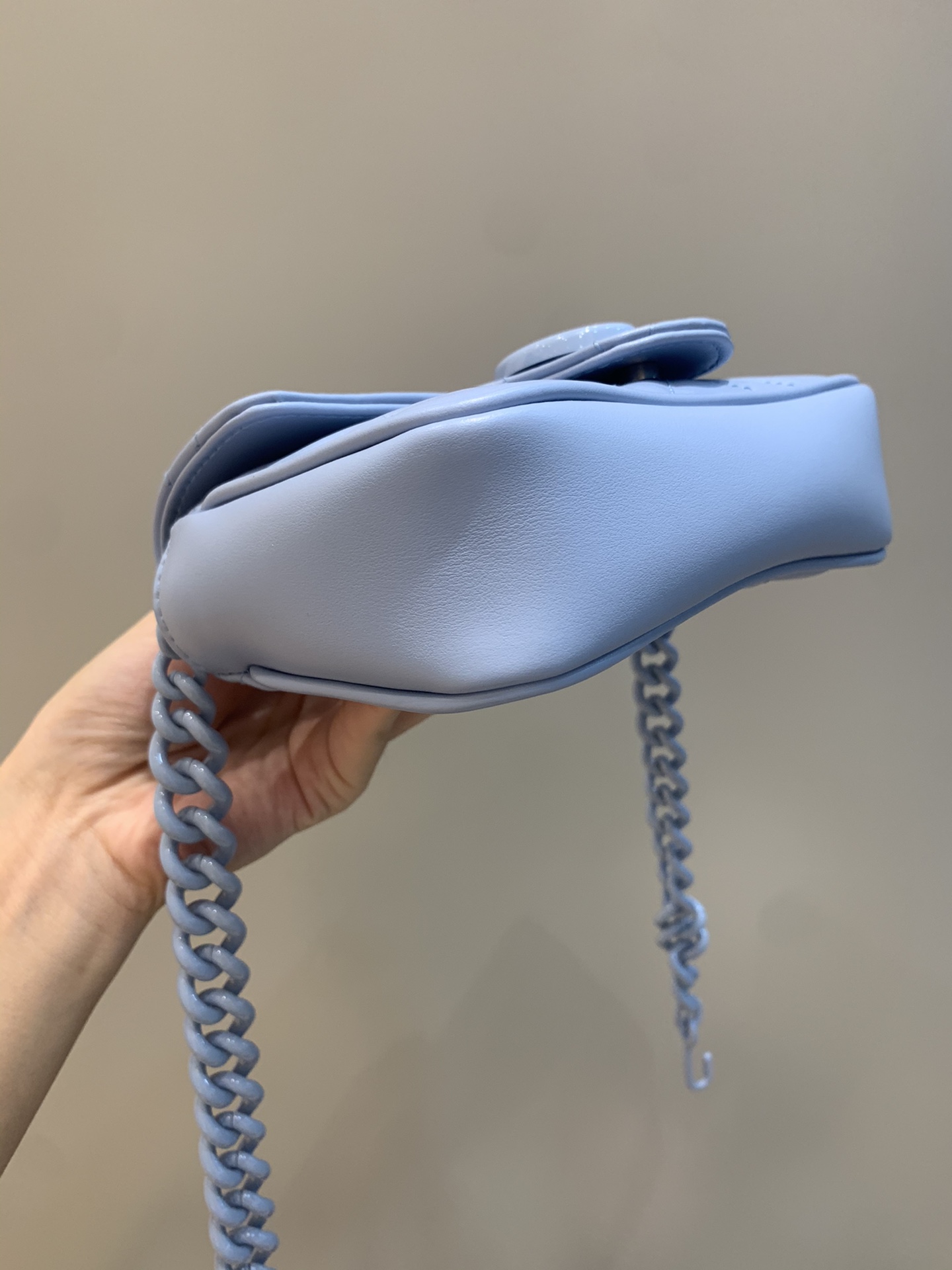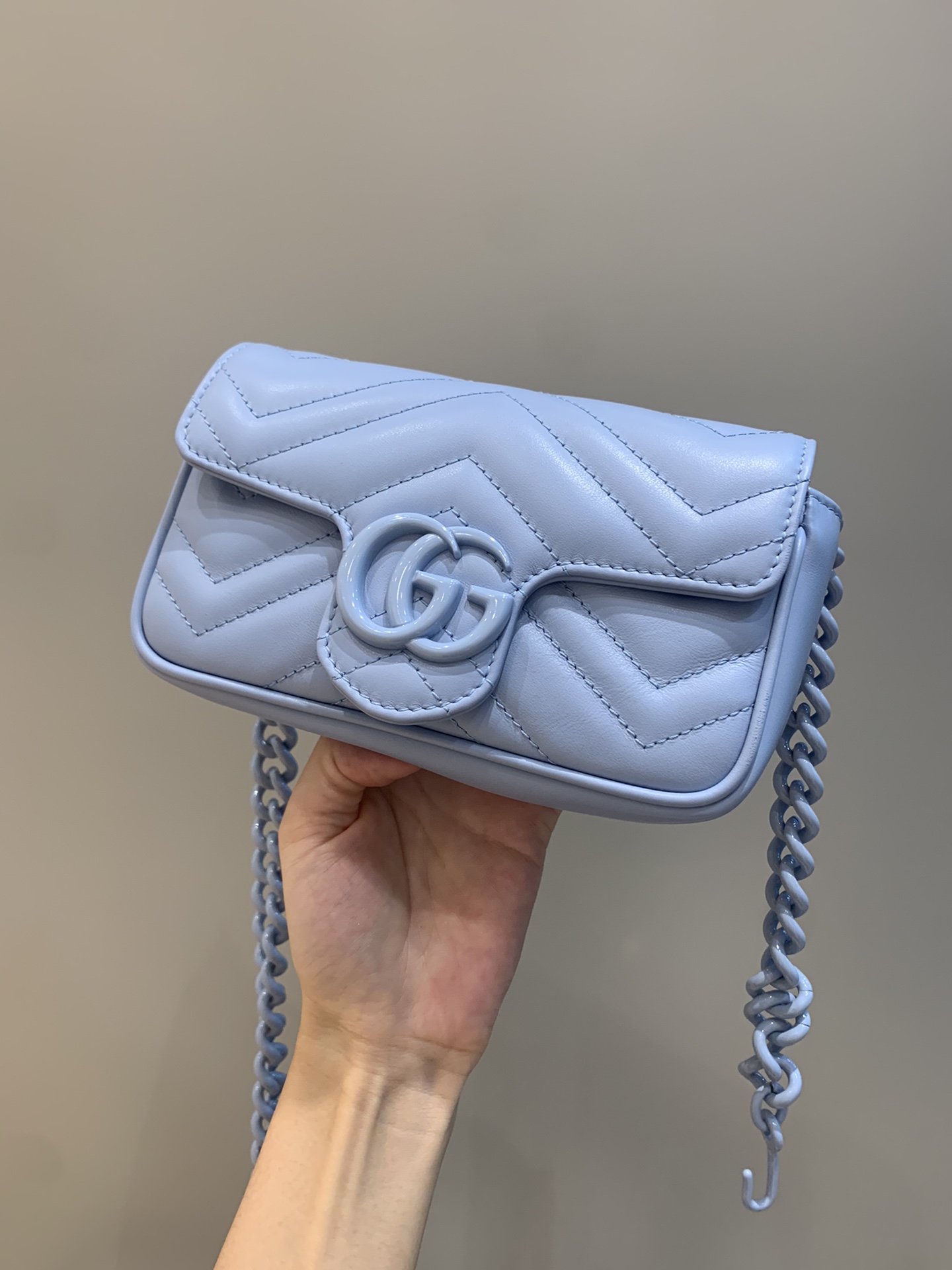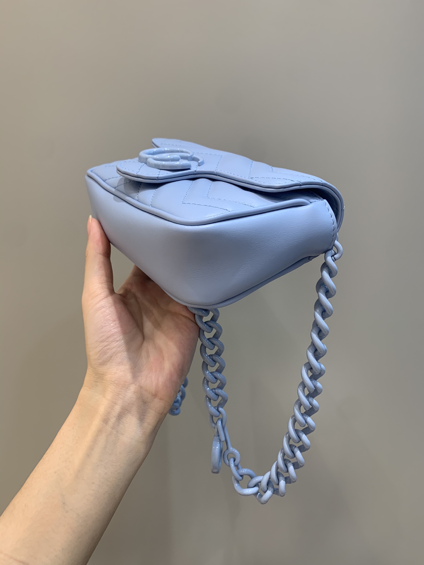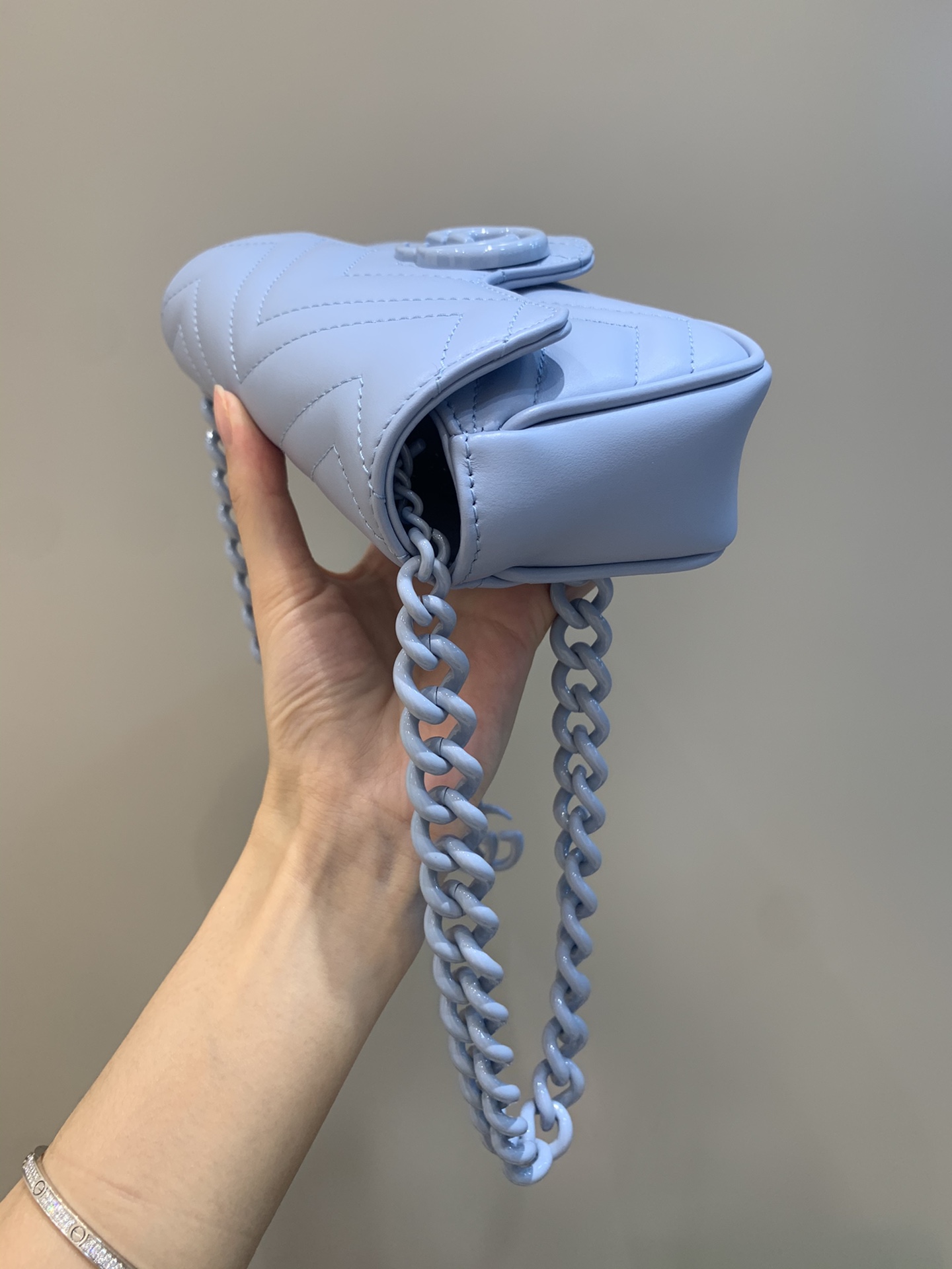 Accessories continue to come to the fore of the Creative Director’s collections. A distinctly contemporary accessory, the belt bag is presented in new ways throughout the Gucci narrative, emphasizing different elements of the versatile style. Here, it is introduced as part of the GG Marmont universe in light blue chevron matelassé leather with a chain strap.
