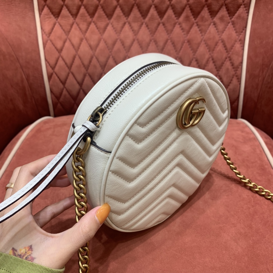 In the 2019 early spring series, the GG Marmont series mini handbags adopt a round design and are novelly presented with chain shoulder straps. The Double G-shaped accessories are unique and eye-catching. They are made of quilted V-shaped leather and decorated with a heart-shaped pattern on the back, which is full of retro atmosphere.