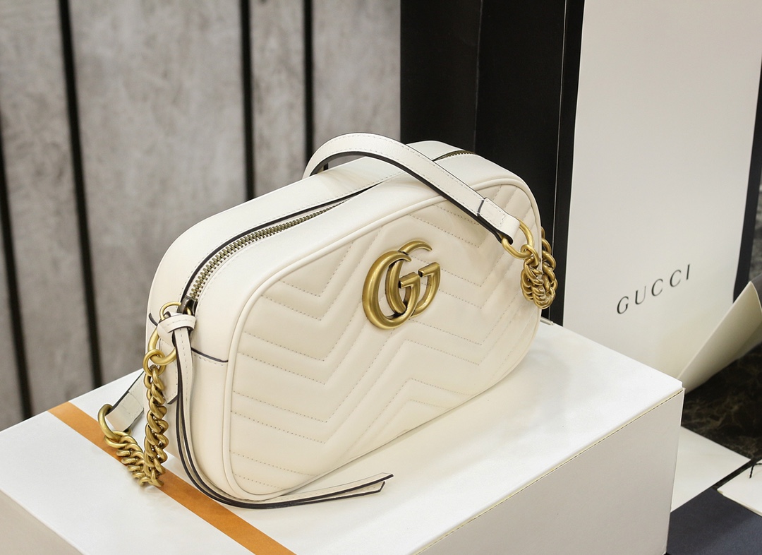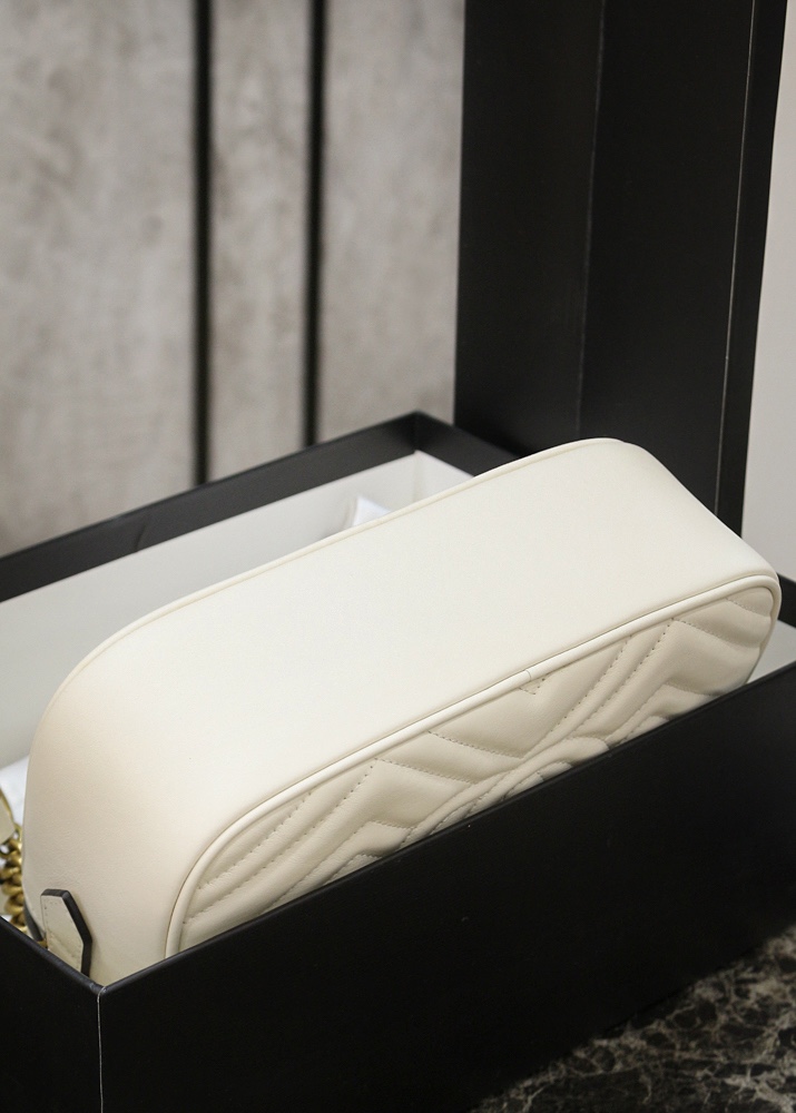 The small GG Marmont chain shoulder bag has a softly structured shape and a zip top closure with the Double G hardware. The chain shoulder strap has a leather shoulder detail. Made in matelassé leather with a chevron design and GG on the back.