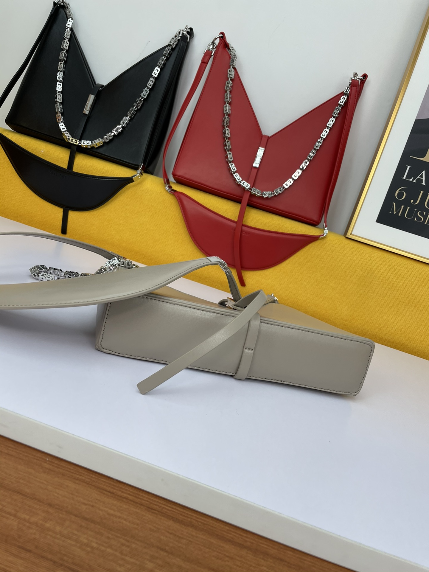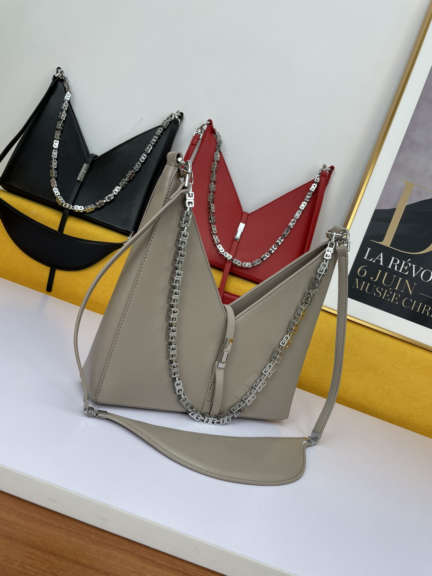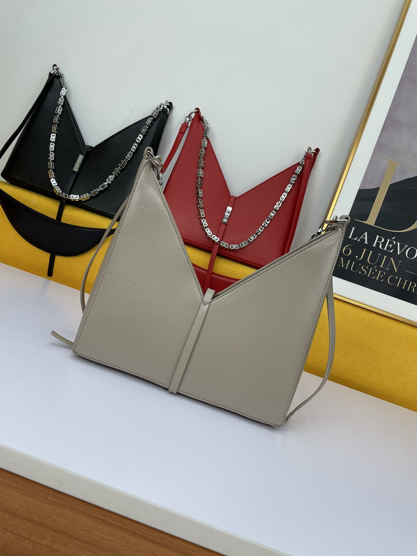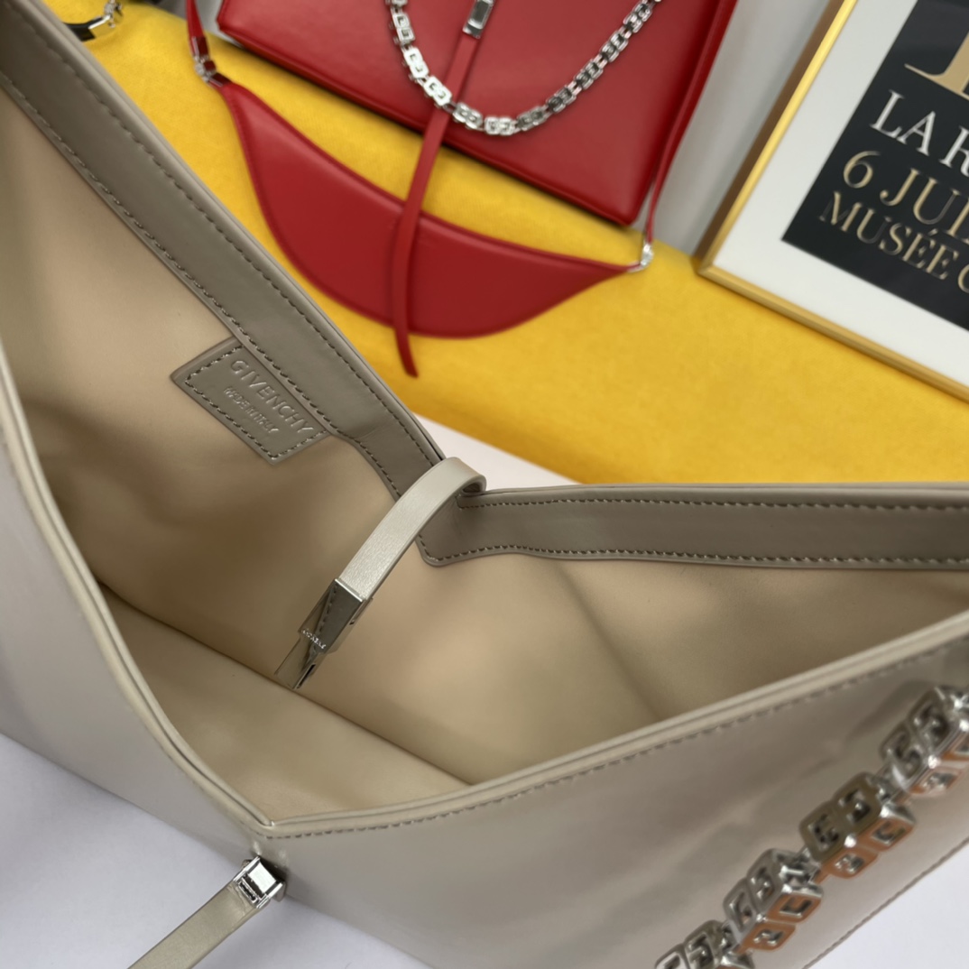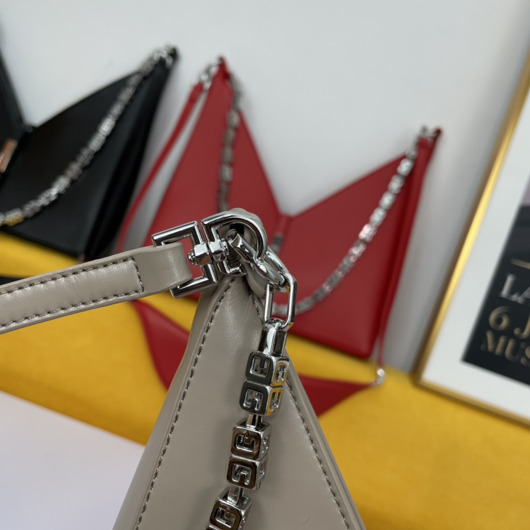 Givenchy’s new release, the V-shaped Cut Out handbag, is a unique and stylish design from the renowned French brand. Made of genuine leather and featuring original hardware, it is paired with a cast copper 4G metal chain.