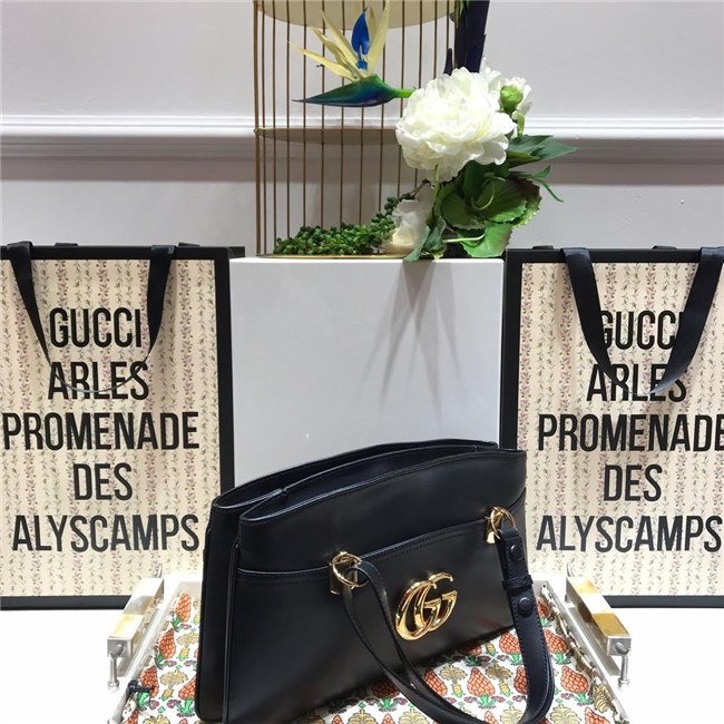 Brought back from the 1970s archives, the Double G hardware defines a new line of handbags. The oversize emblem decorates the front of a leather tote, designed with a vintage feel. The accessory was presented in the Cruise 2019 collection, revealed in the evocative setting of the Promenade des Alyscamps, an ancient Roman necropolis in the town of Arles, France—which gives the name to the line.