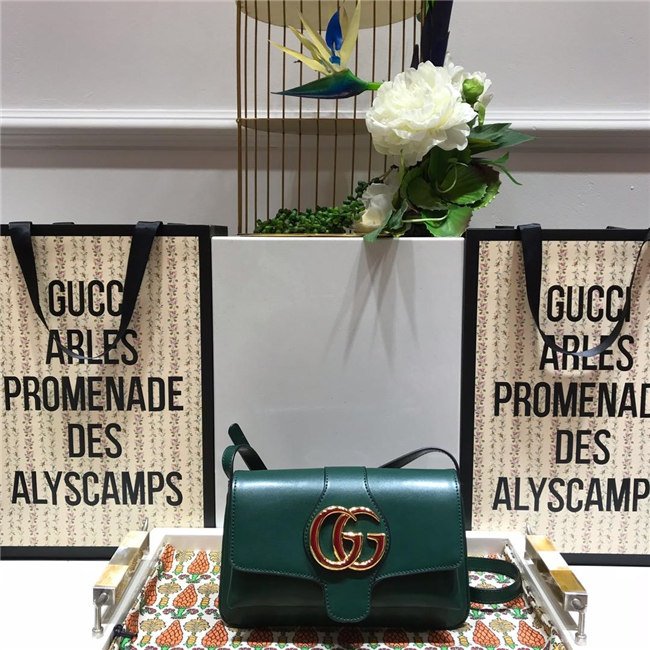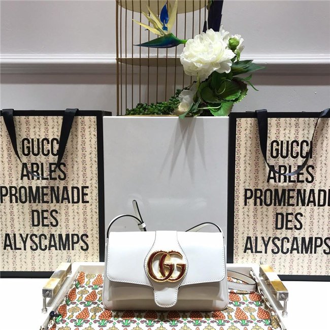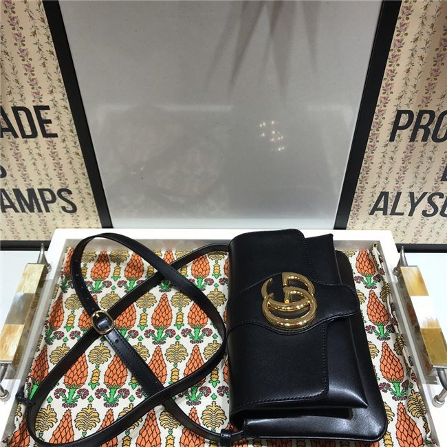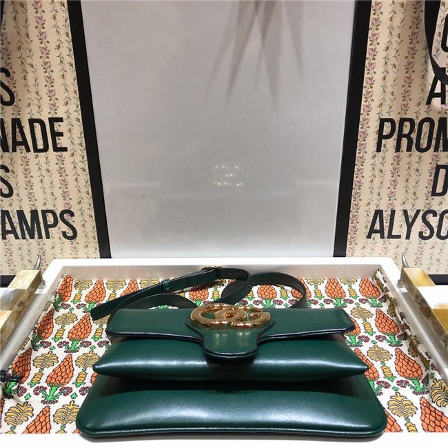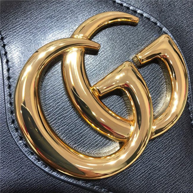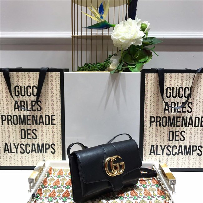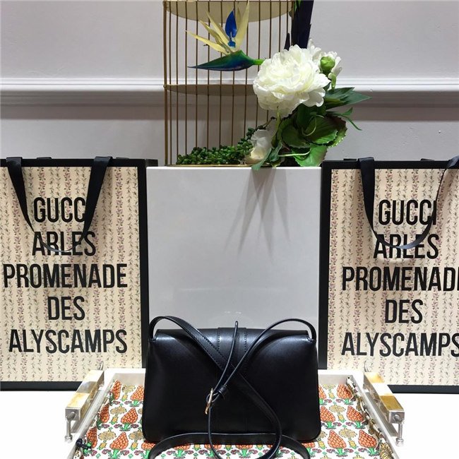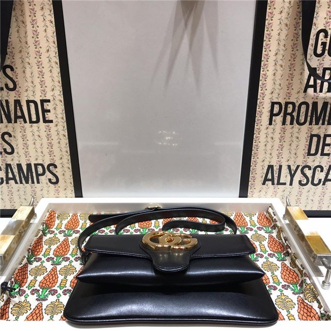 Brought back from the 1970s archives, the Double G hardware defines a new line of shoulder bags. The oversize emblem decorates the exaggerated flap closure of a small shoulder bag. The silhouette has a vintage feel with an adjustable shoulder strap, crafted in black leather with a rich softness and shiny look. The accessory was first presented in the Cruise 2019 collection, revealed in the evocative setting of the Promenade des Alyscamps, an ancient Roman necropolis in the French town of Arles—which gives the name to the line.