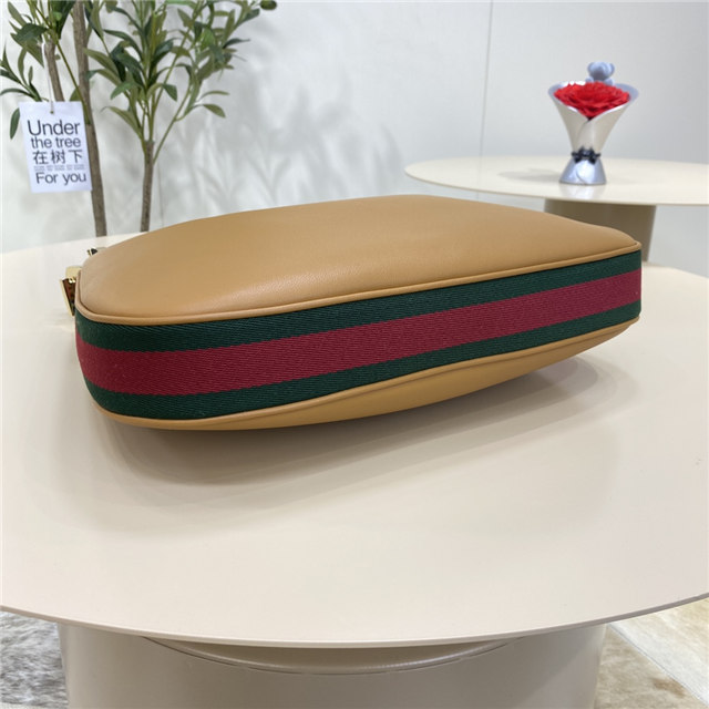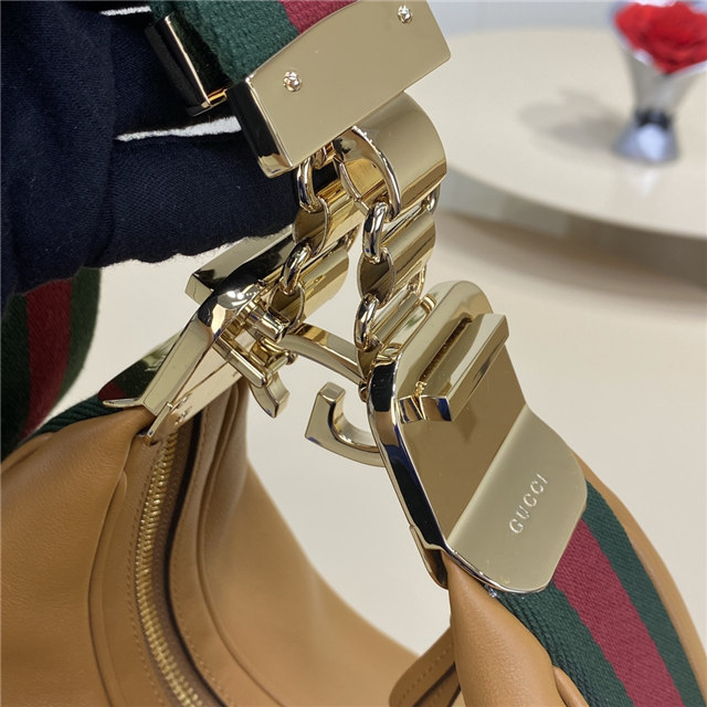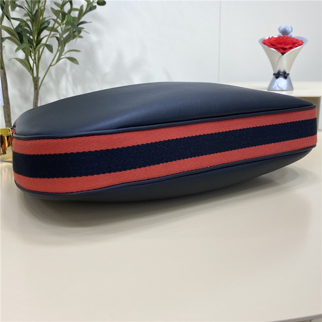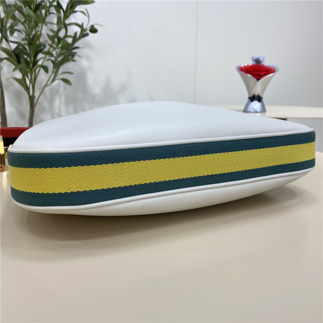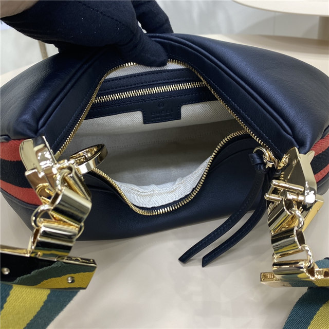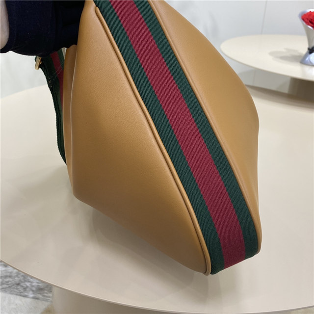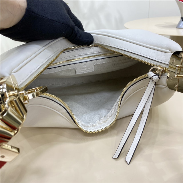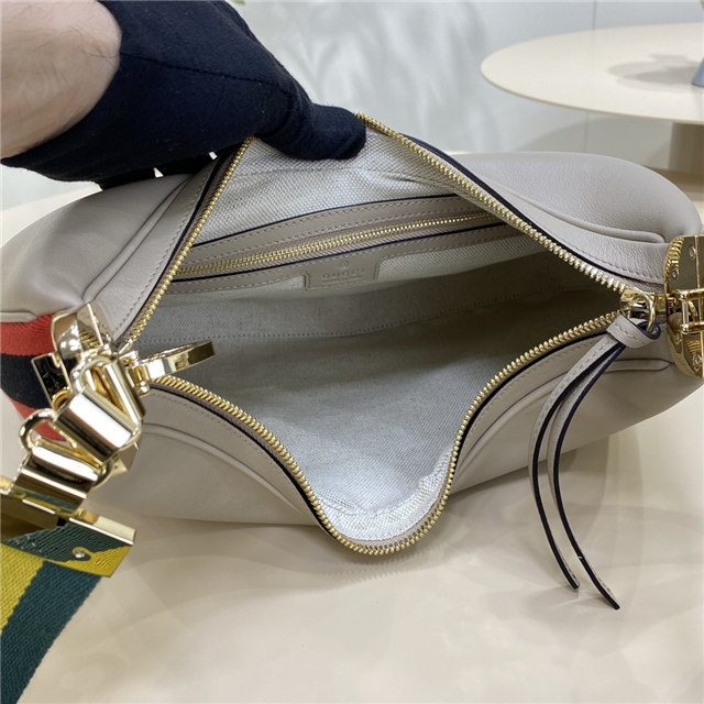 An ode to the timeless Hollywood glamour that shaped Gucci Love Parade, classic elements from the House”s archives are reintroduced. Distinguished by its crescent moon shape, the accessory is further defined by a G shaped hook closure. Paired with soft materials, the heritage hardware creates a refined design with vintage appeal. This large version is crafted in black leather with orange and black Web trim.