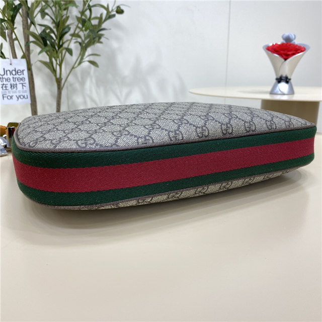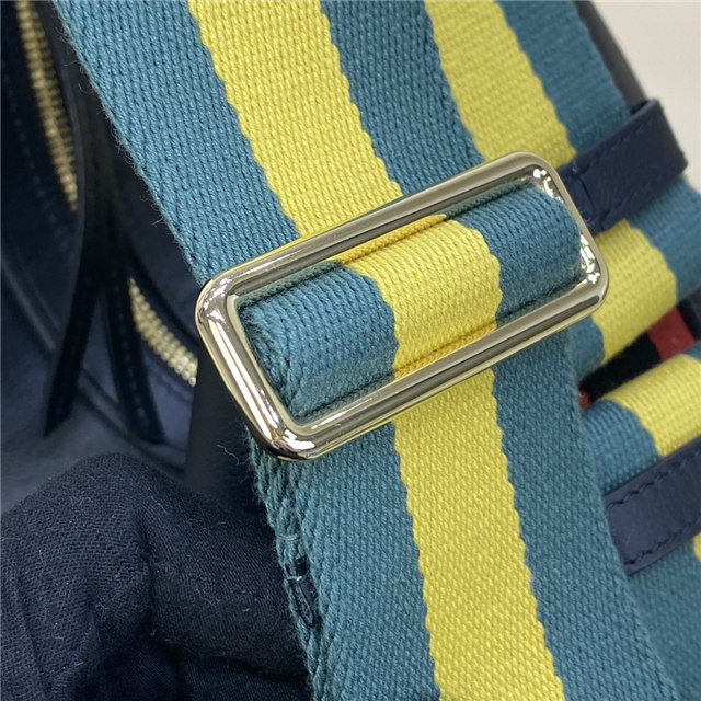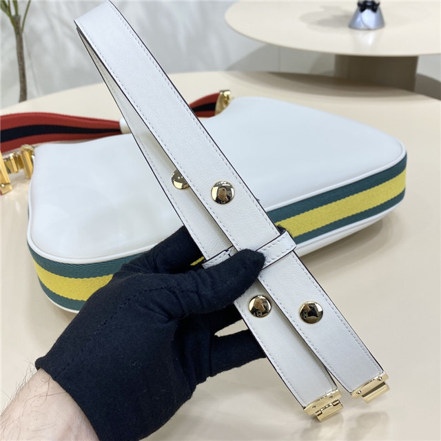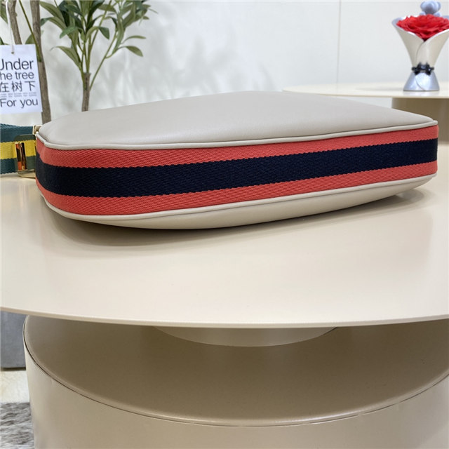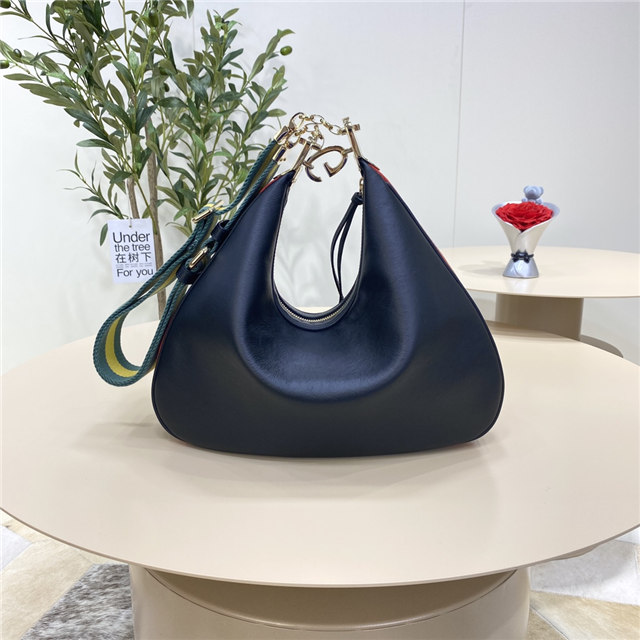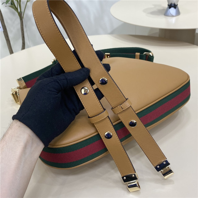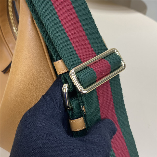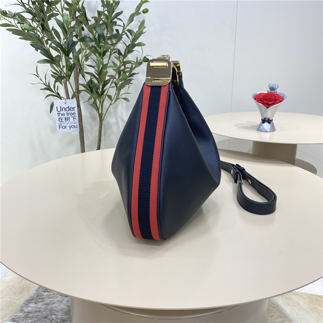 An ode to the timeless Hollywood glamour that shaped Gucci Love Parade, classic elements from the House”s archives are reintroduced. Distinguished by its crescent moon shape, the accessory is further defined by a G shaped hook closure. Paired with soft materials, the heritage hardware creates a refined design with vintage appeal. This large version is crafted in black leather with orange and black Web trim.