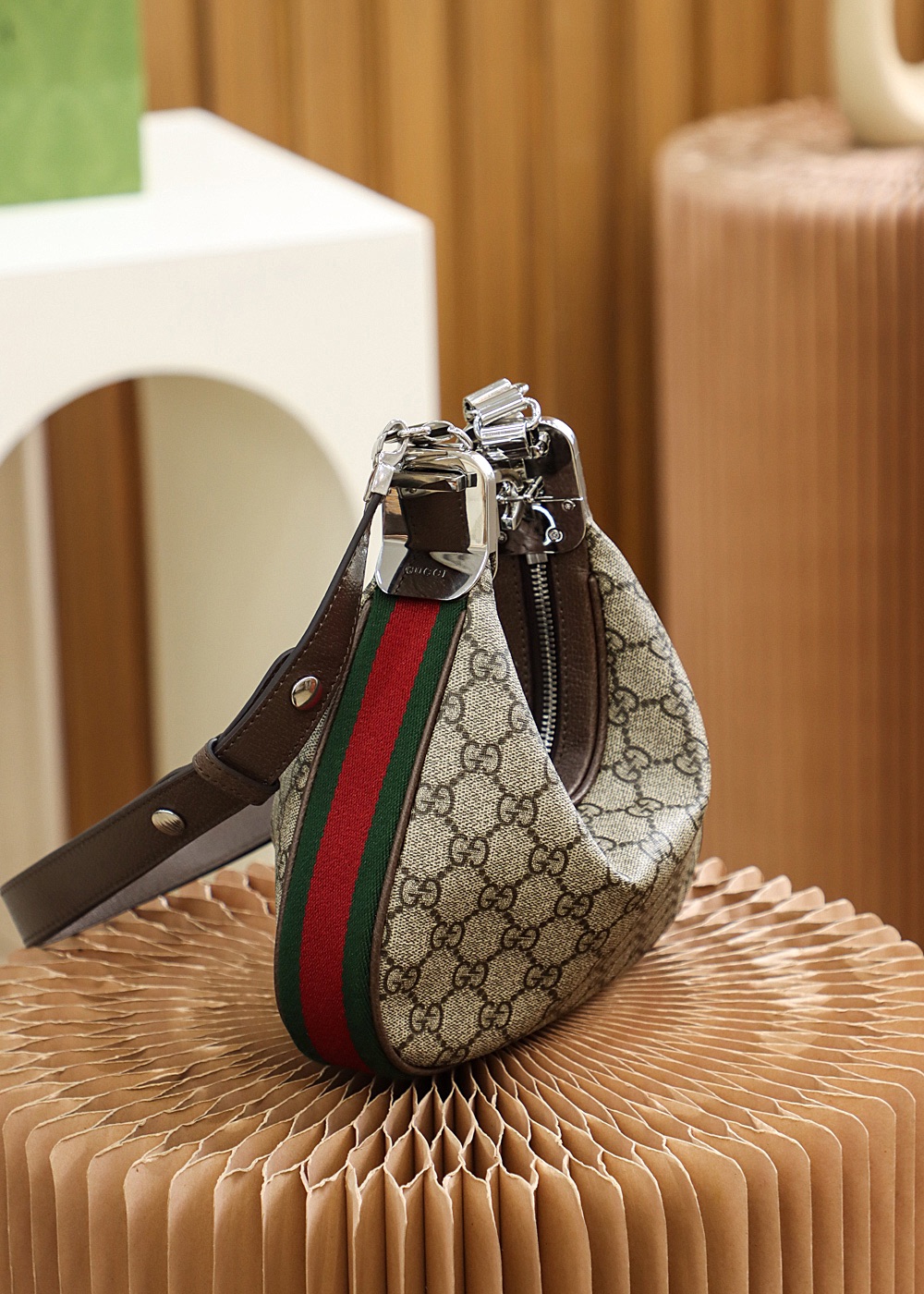 An ode to the timeless Hollywood glamour that shaped Gucci Love Parade, classic elements from the House’s archives are reintroduced. Distinguished by its crescent moon shape, the accessory is further defined by a G shaped hook closure. Paired with soft materials, the heritage hardware creates a refined design with vintage appeal. This small version is crafted in beige and ebony GG Supreme canvas with brown leather trim.