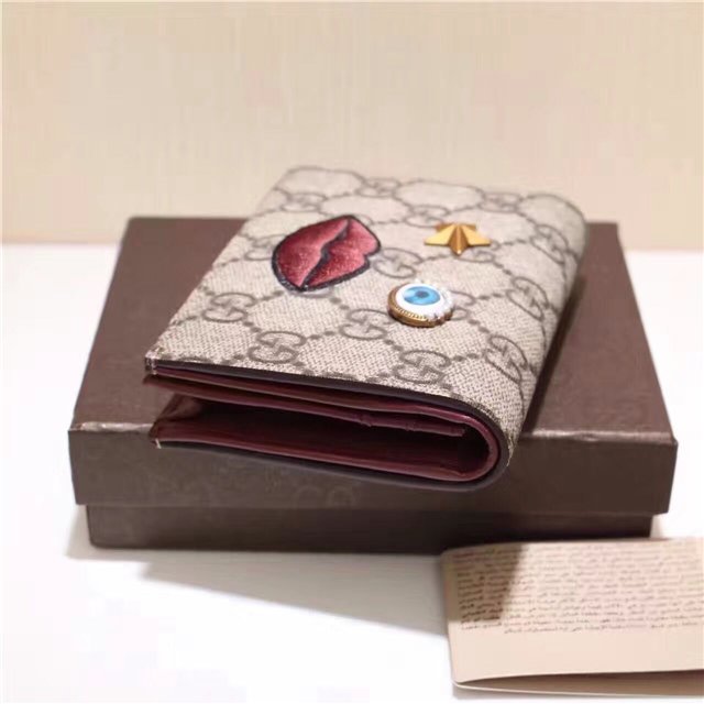 This card case made in our GG Supreme canvas has a star, eye and mouth applique on the front which forms a face. Beige/ebony GG Supreme canvas, a material with low environmental impact, with red leather detail and star, eye, and mouth appliques.