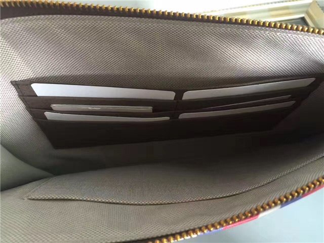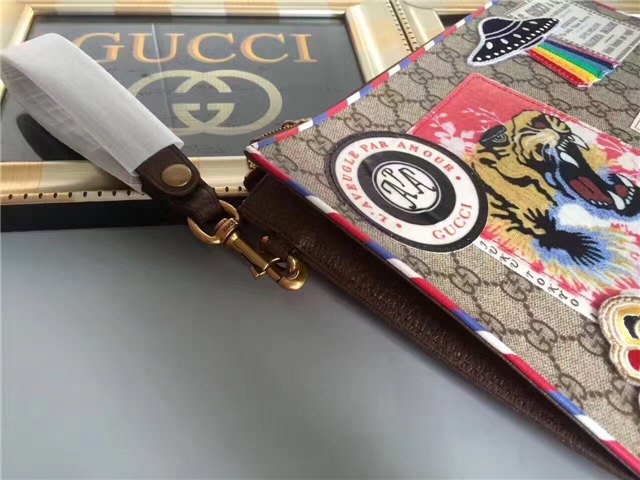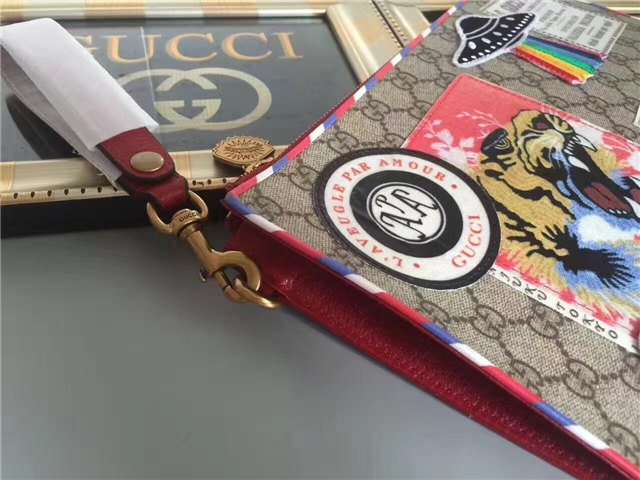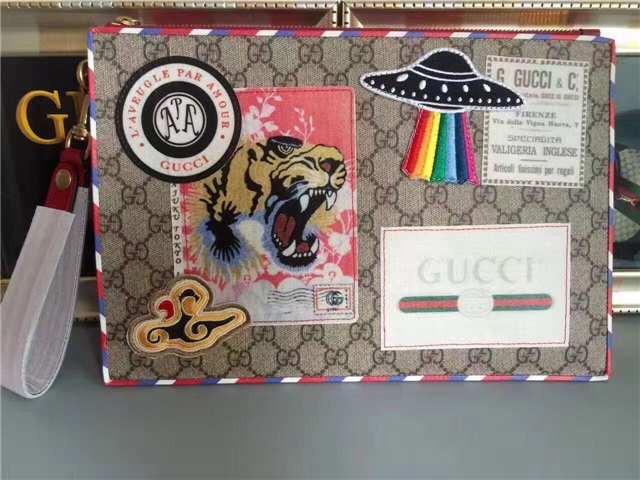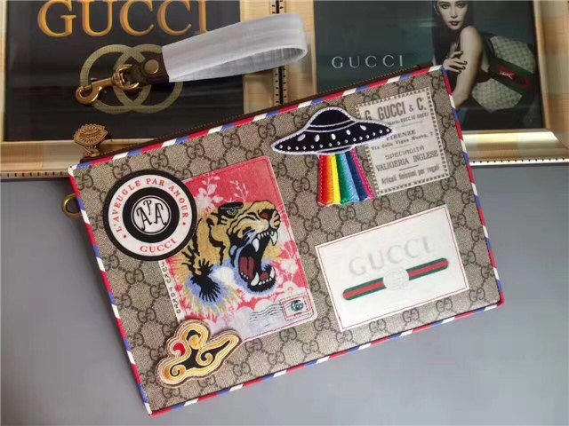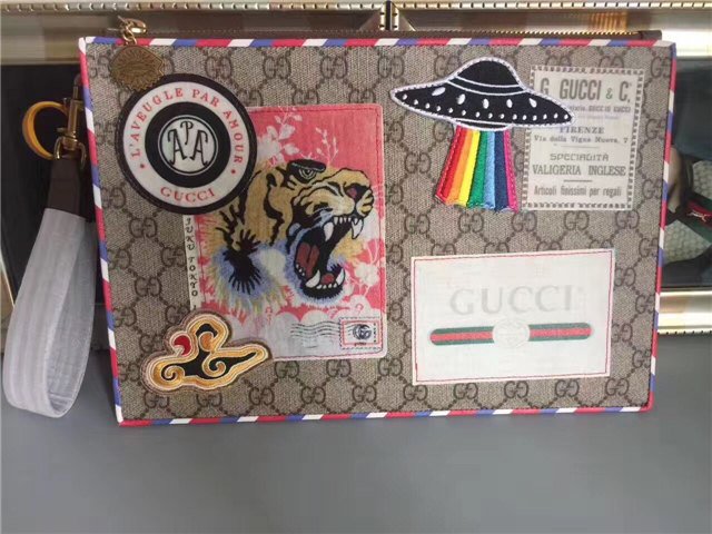 Travel continues to be a source of inspiration for Alessandro Michele. A collection of accessories in the GG motif is enriched with a blend of contemporary embroideries-like the UFO-and vintage inspired details, including airmail trims and vintage Gucci vintage logo from the archives.
