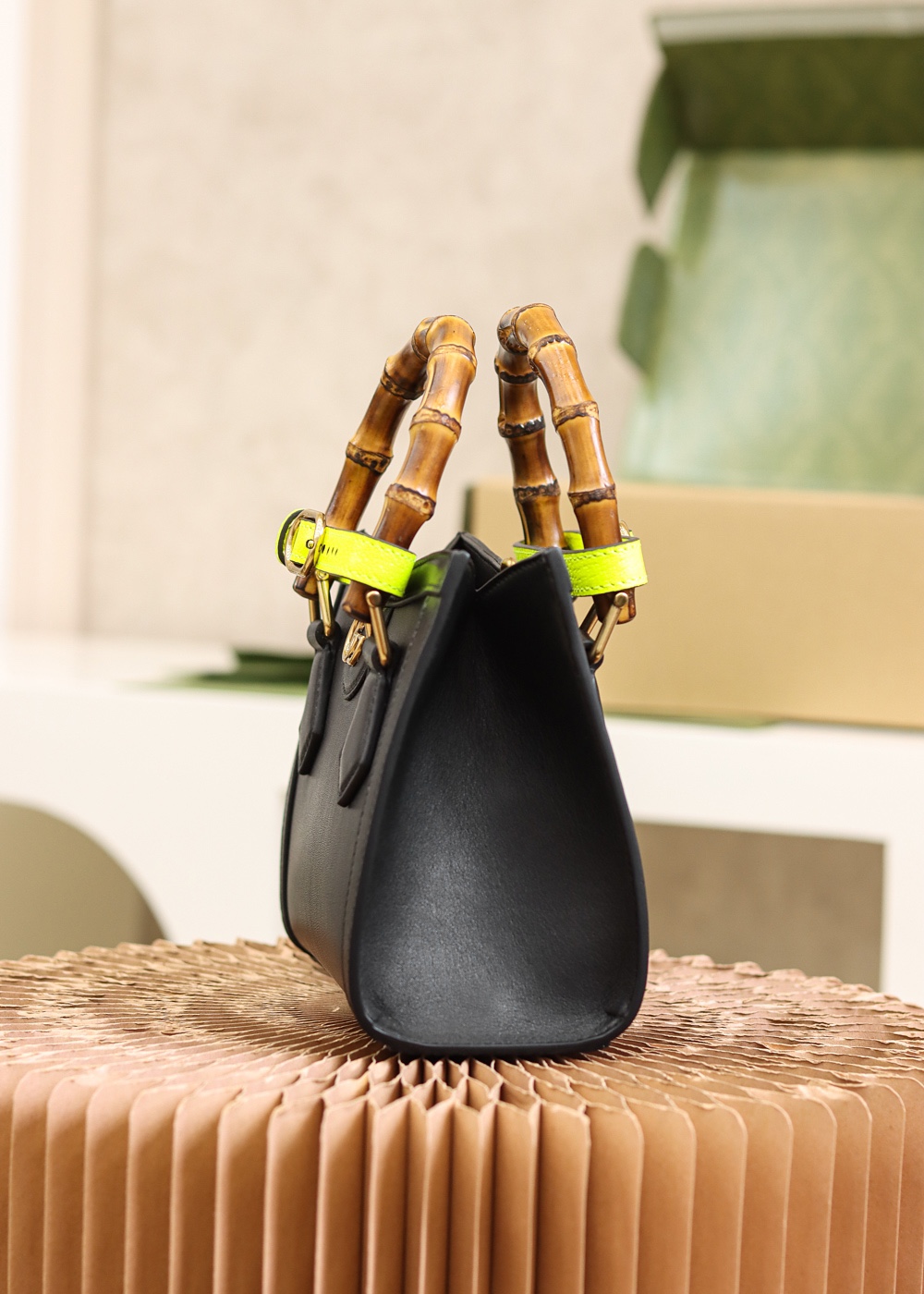 An evolution of a bamboo handle tote first introduced in 1991, the Gucci Diana represents the notion of style in constant evolution and is reimagined with removable, neon leather belts—a nod to the functional bands used to keep the handles in shape.