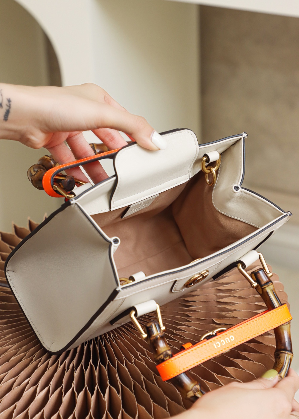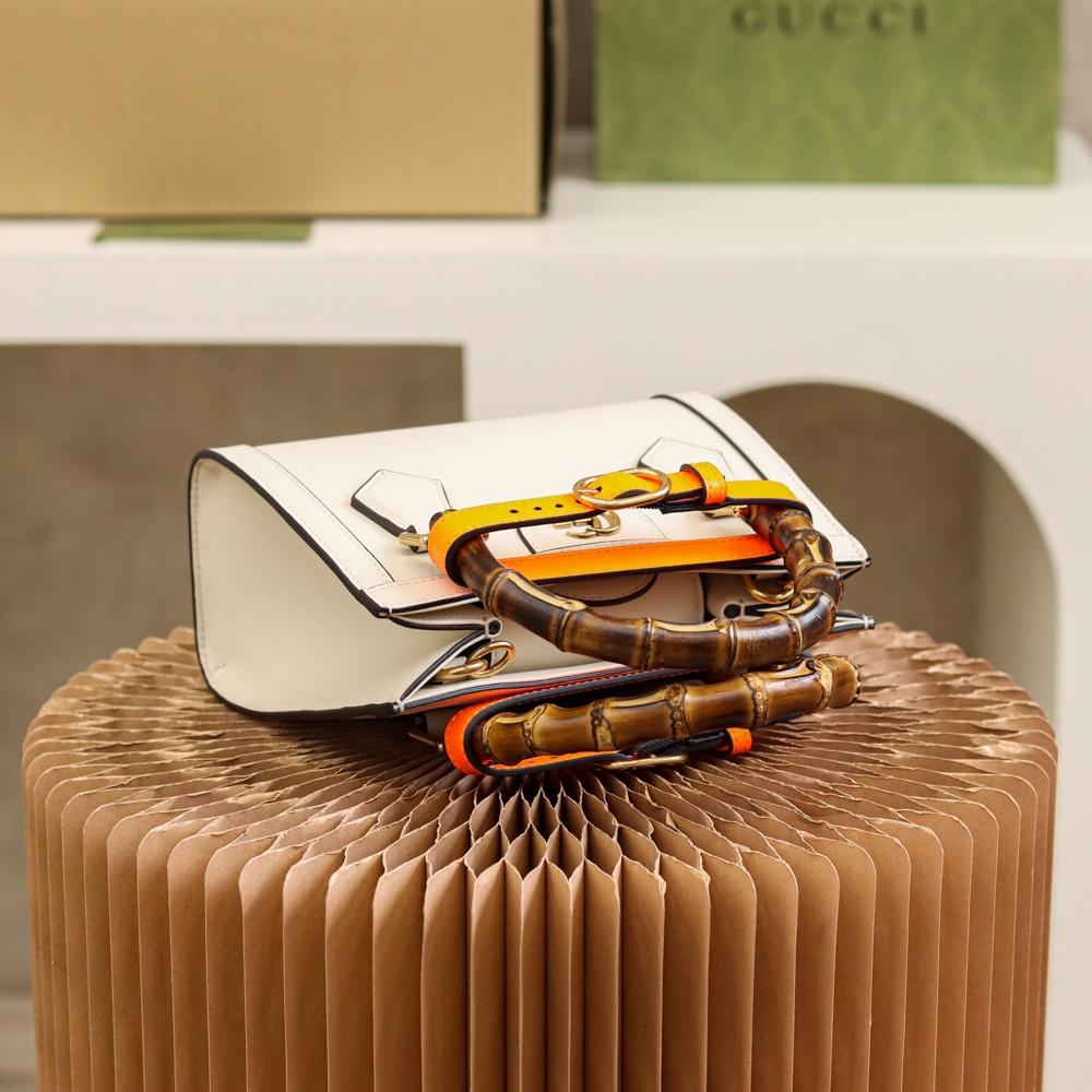 An evolution of a bamboo handle tote first introduced in 1991, the Gucci Diana represents the notion of style in constant evolution and is reimagined with removable, neon leather belts—a nod to the functional bands used to keep the handles in shape.