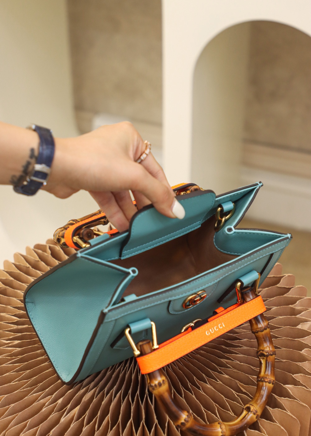 An evolution of a bamboo handle tote first introduced in 1991, the Gucci Diana represents the notion of style in constant evolution and is reimagined with removable, neon leather belts—a nod to the functional bands used to keep the handles in shape.