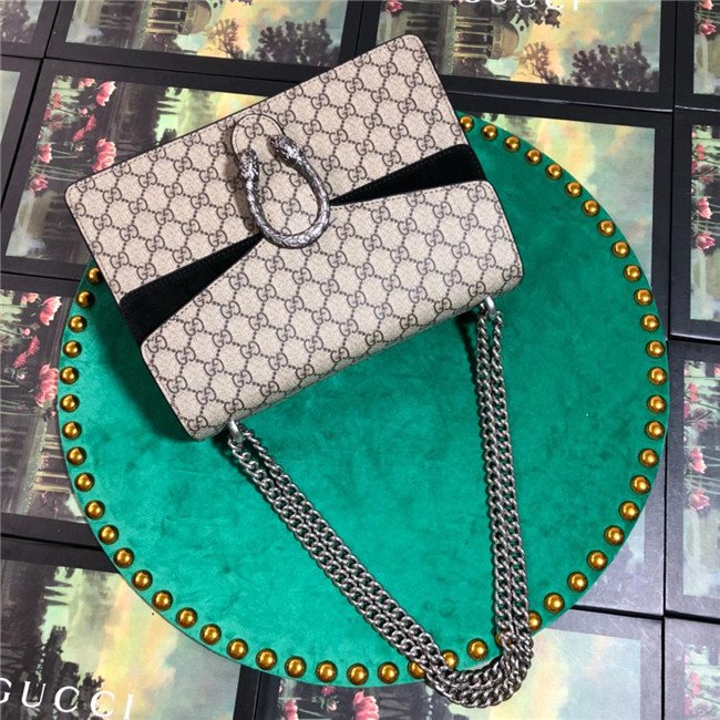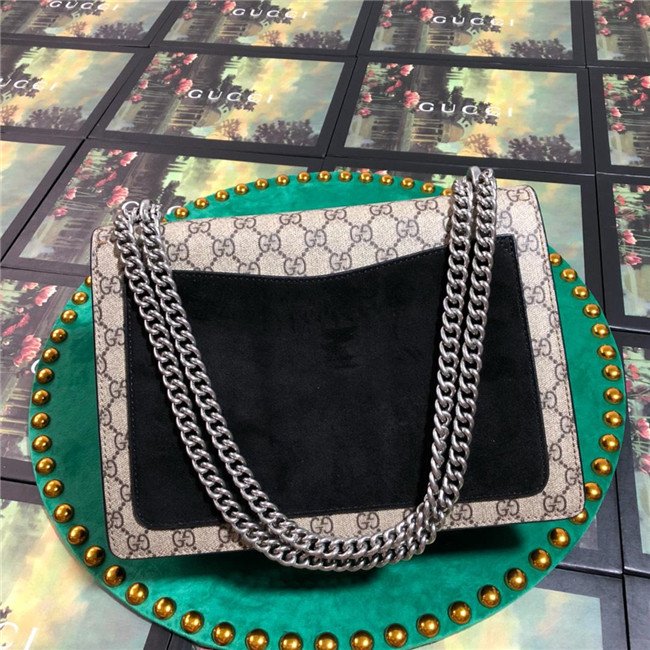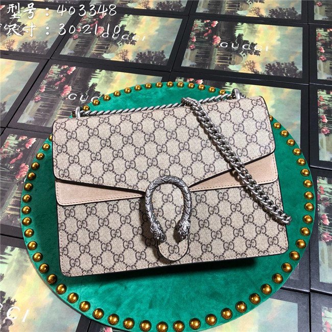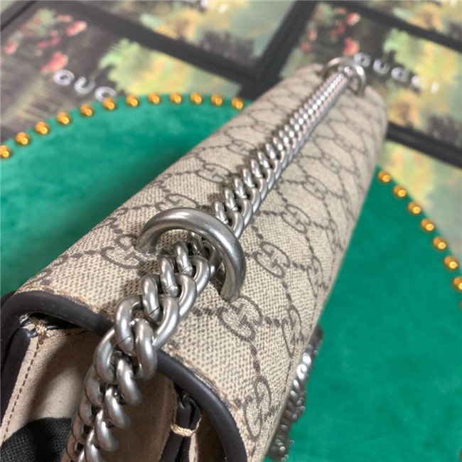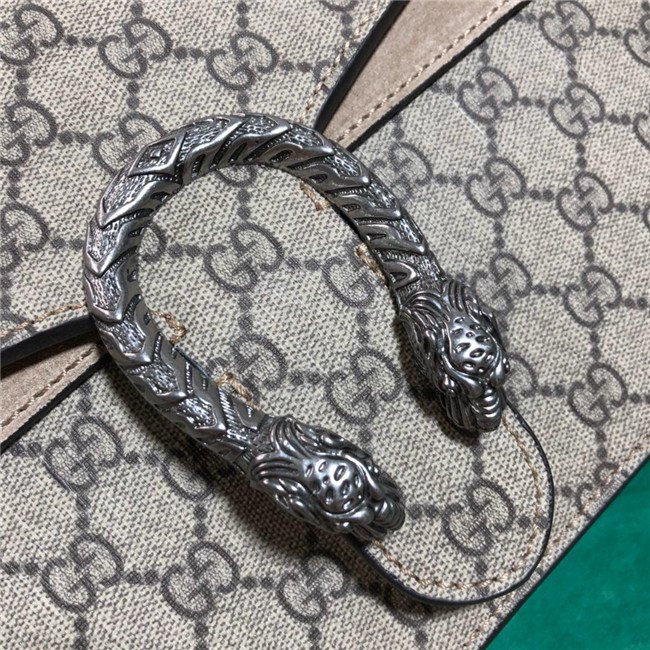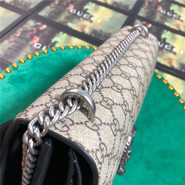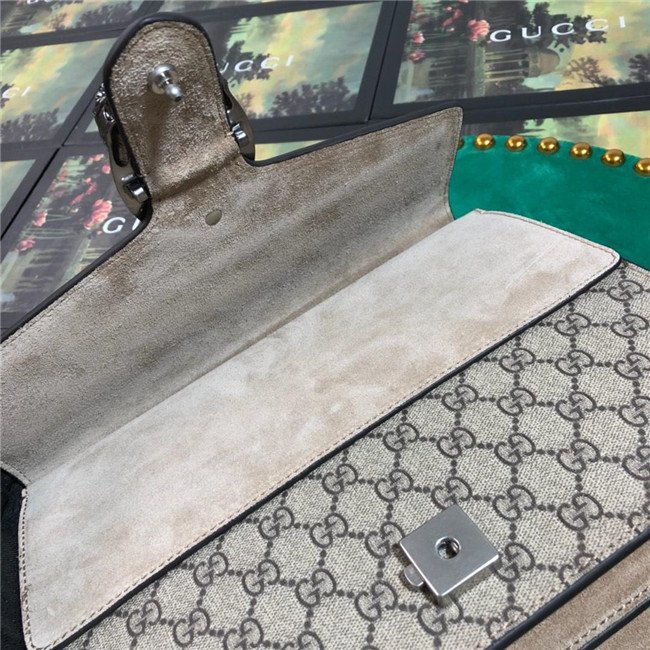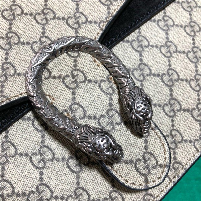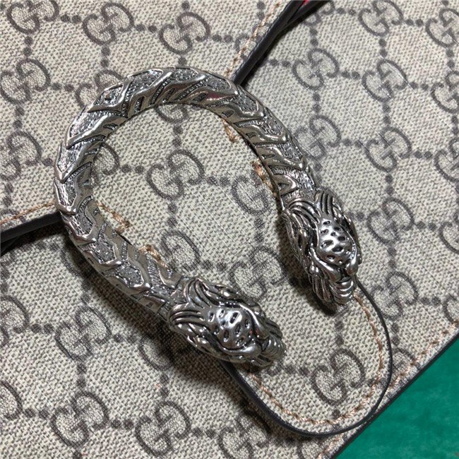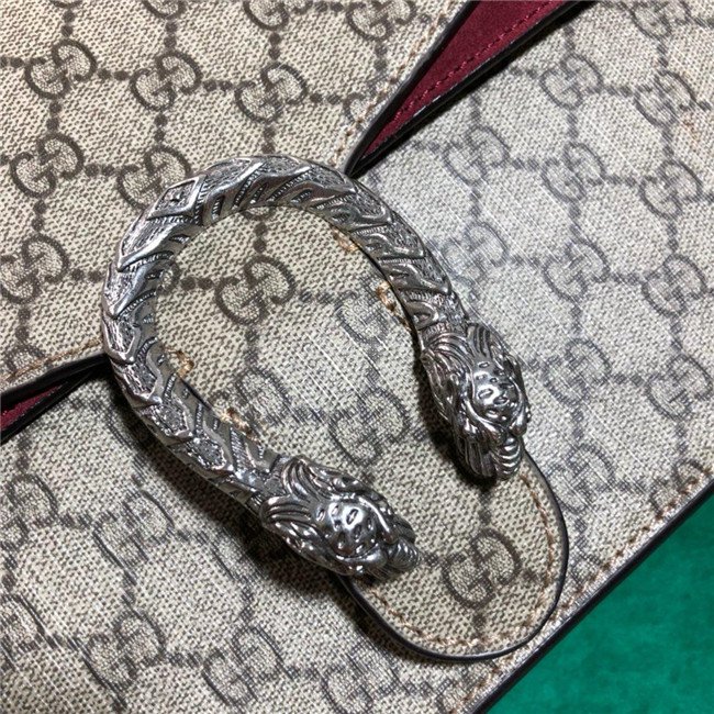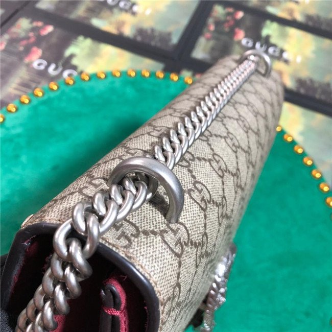 A structured GG Supreme canvas bag with our textured tiger head closure-a unique detail referencing the Greek god Dionysus, who in myth is said to have crossed the river Tigris on a tiger sent to him by Zeus. The sliding chain strap can be worn multiple ways, changing between a shoulder and a top handle bag.