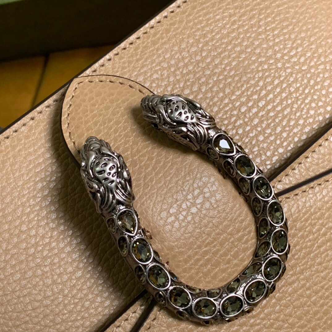 The Dionysus mini bag is presented in beige textured leather with the now defining tiger head closure—a unique detail referencing the Greek god Dionysus. The closure is further enhanced with Swarovski crystals. The sliding chain strap can be worn multiple ways, changing between a shoulder and a top handle bag.