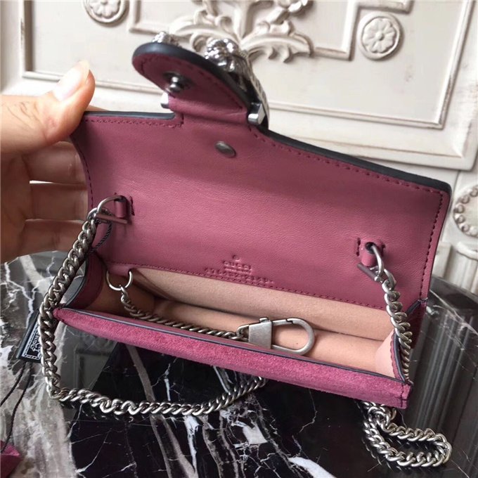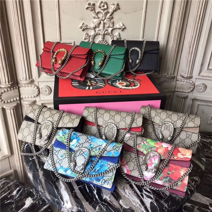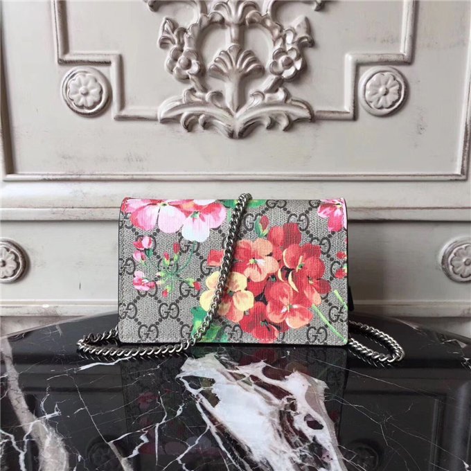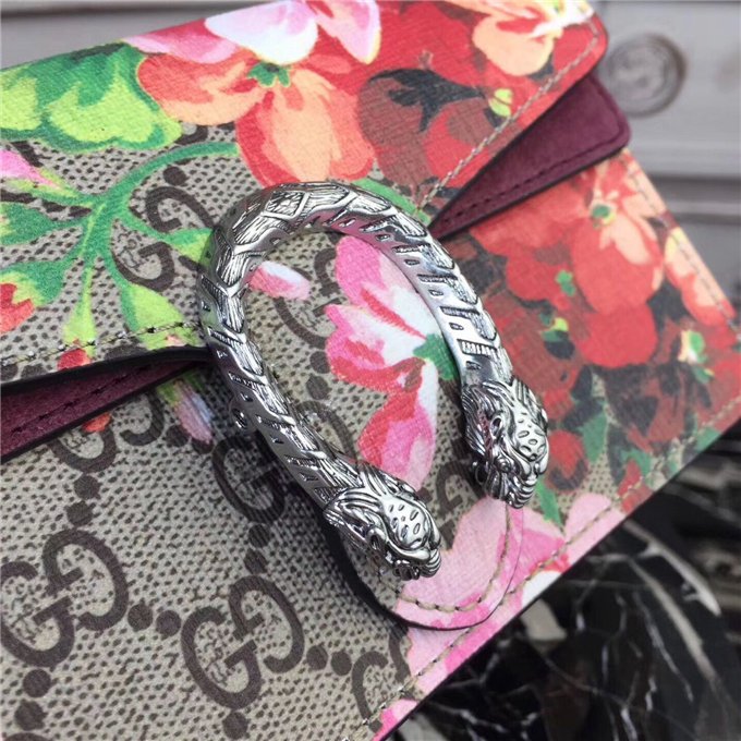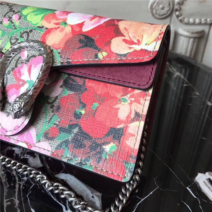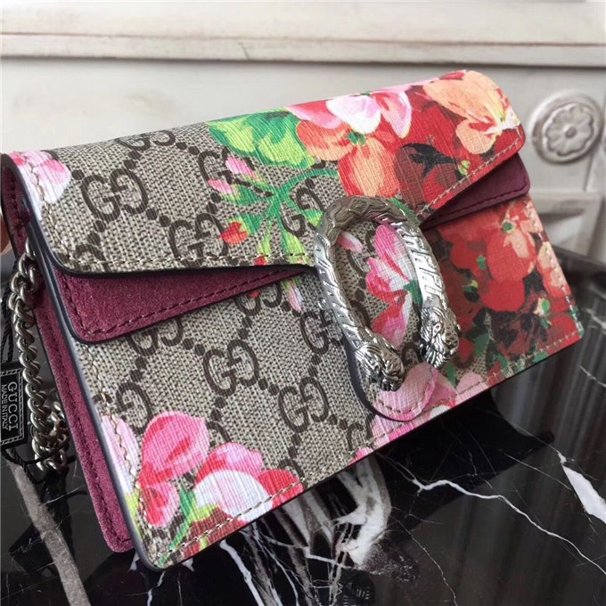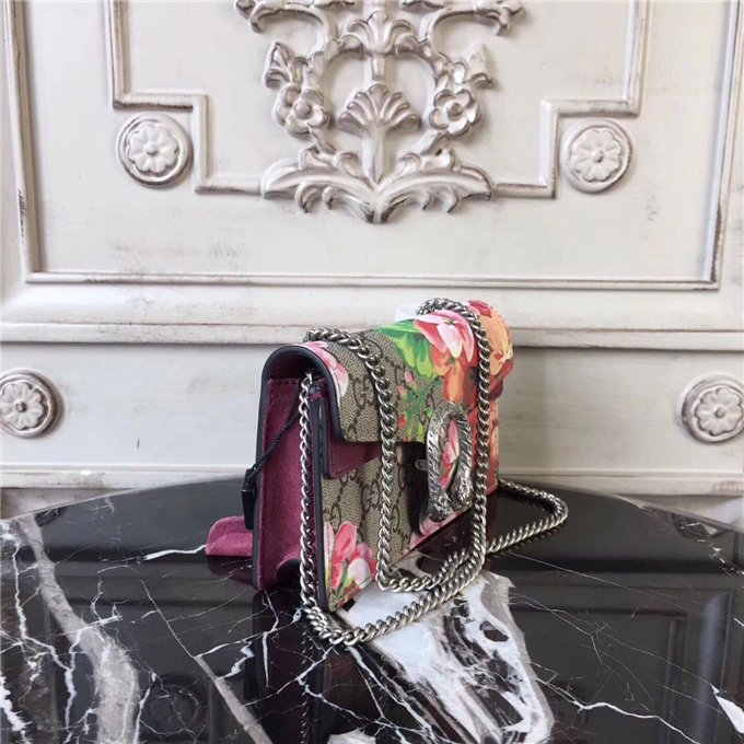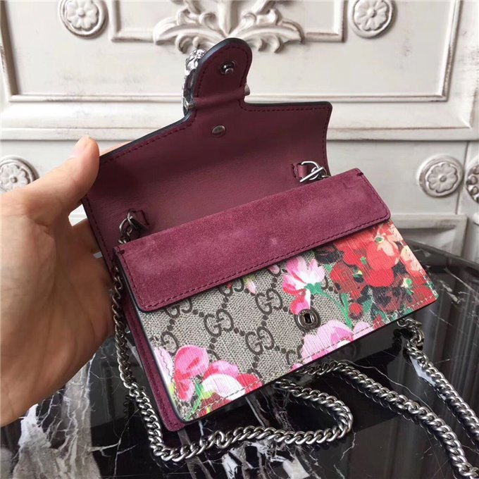 A structured Blooms GG Supreme canvas chain super mini bag with a key ring that can be used to attach this bag to a separate larger bag. The closure has the textured tiger head spur closure-a unique detail referencing the Greek god Dionysus, who in myth is said to have crossed the river Tigris on a tiger sent to him by Zeus. The tiger head closure is enriched with Swarovski crystal stones.