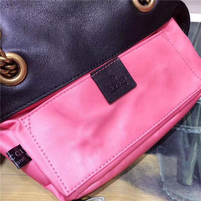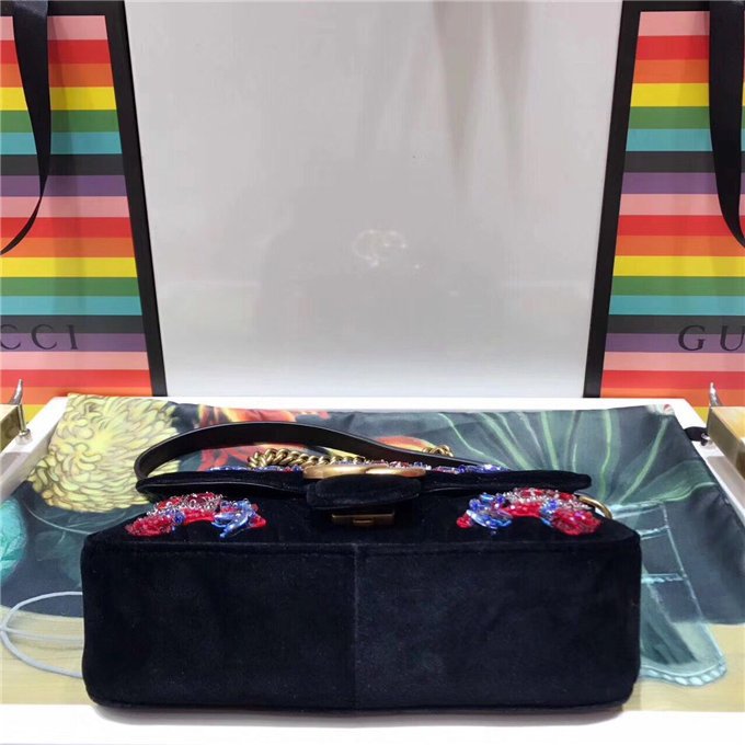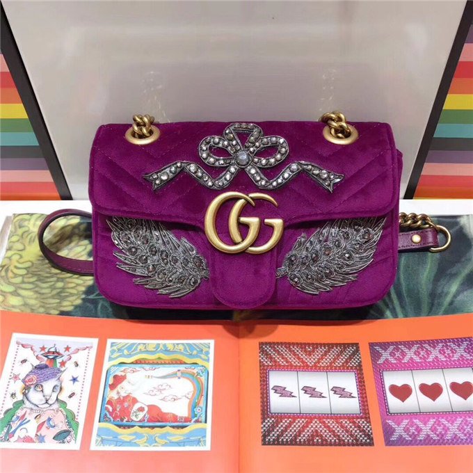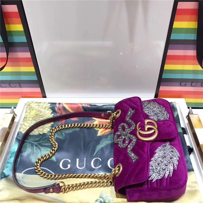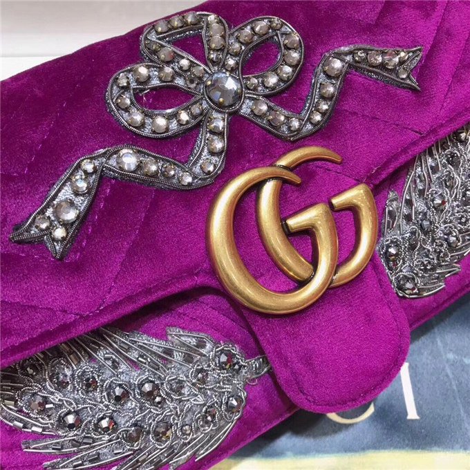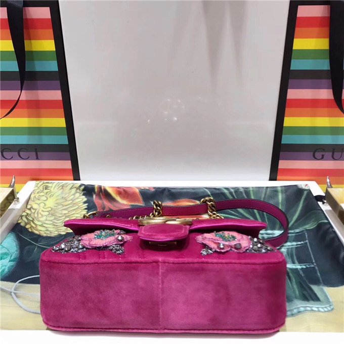 The mini GG Marmont chain shoulder bag has a softly structured shape and an oversized flap closure with Double G hardware. Feminine floral appliques in sequins and crystals decorate the front. The sliding chain strap can be worn multiple ways, changing between a shoulder and a top handle bag. Made in embroidered chevron velvet with a heart on the back.