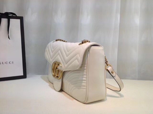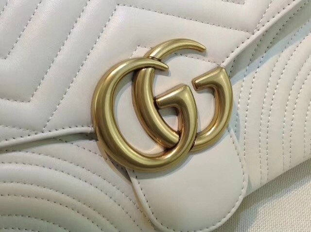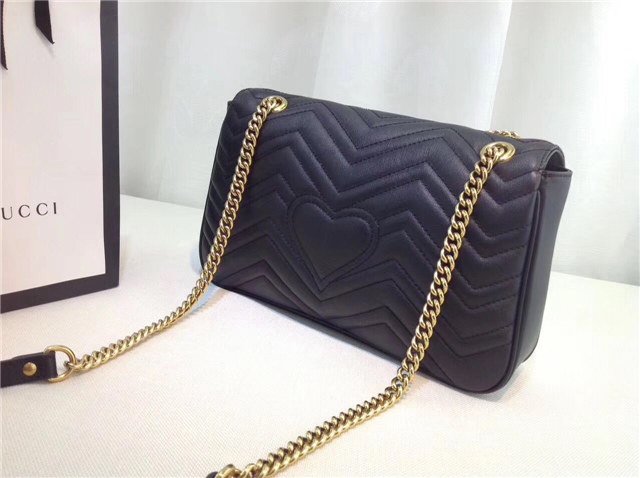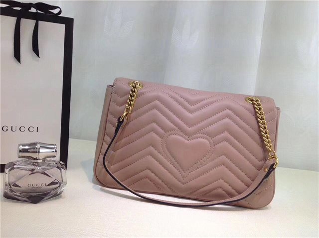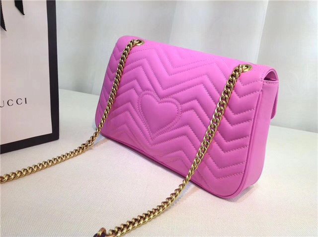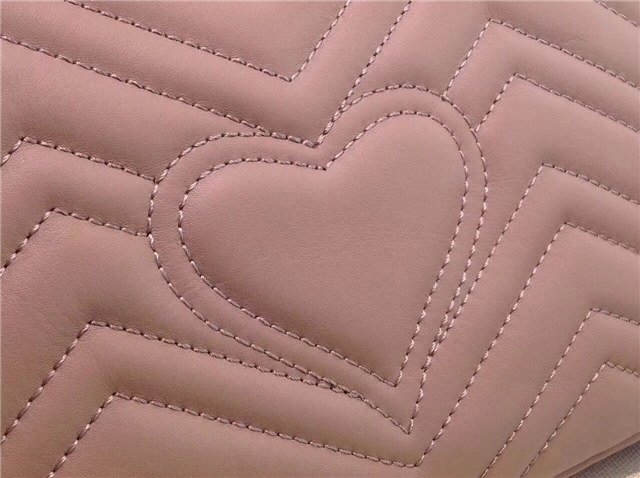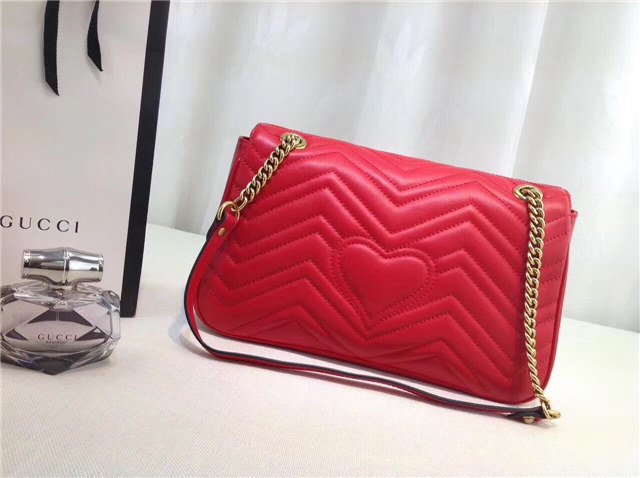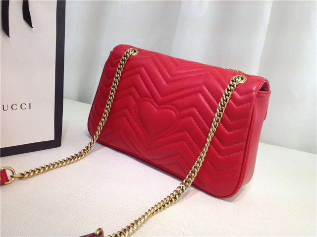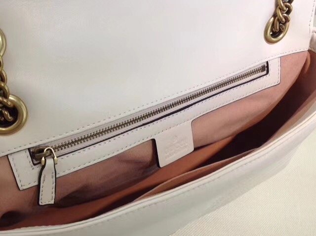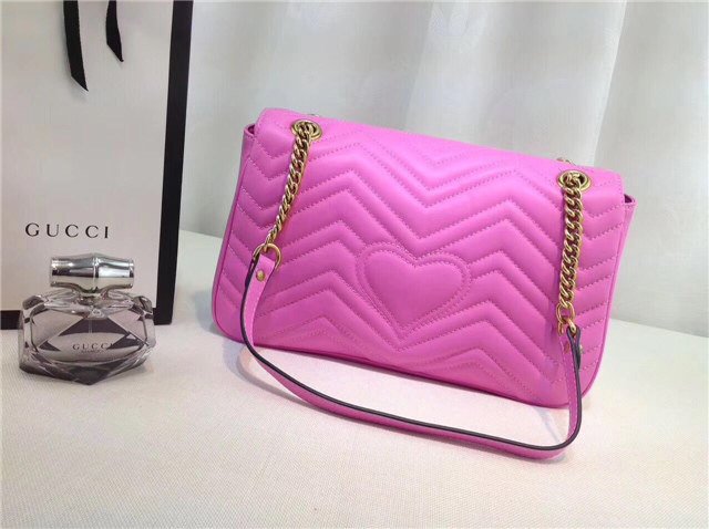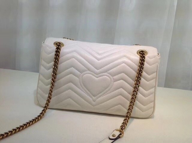 The Large GG Marmont chain shoulder bag has a softly structured shape and an oversized flap closure with Double G hardware. The sliding chain strap can be worn multiple ways, changing between a shoulder and a top handle bag. Made in matelasse chevron leather with a heart on the back.