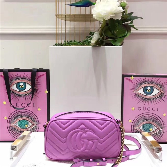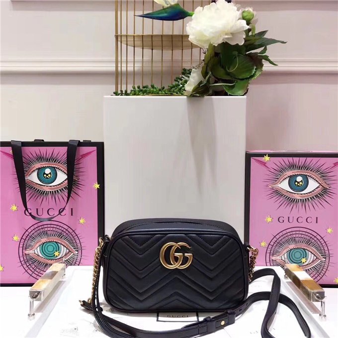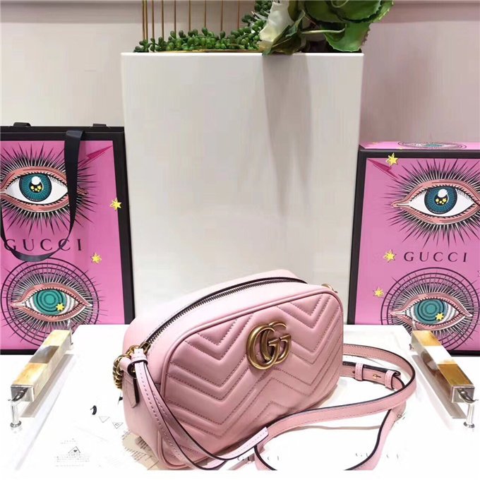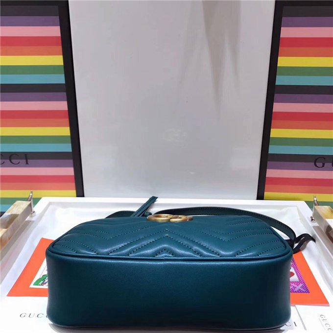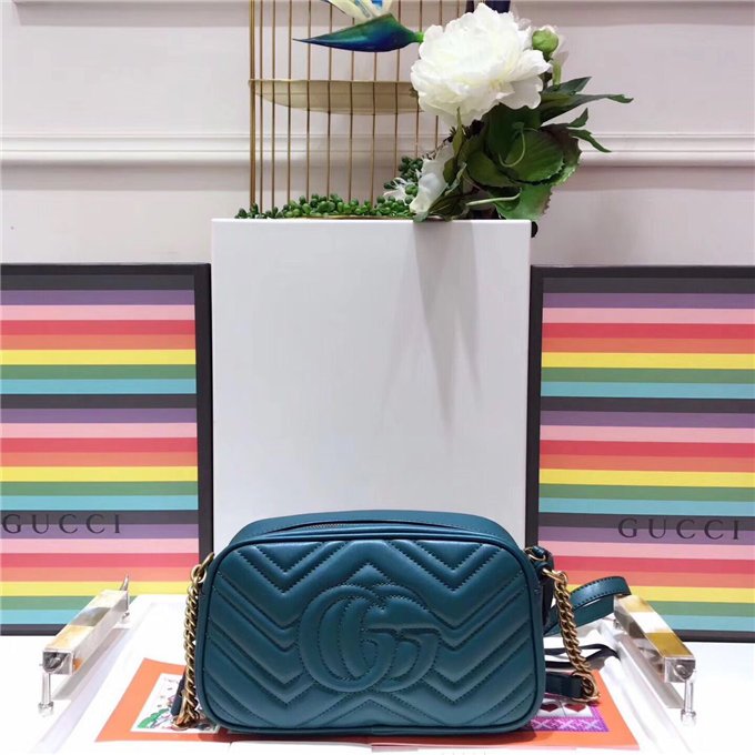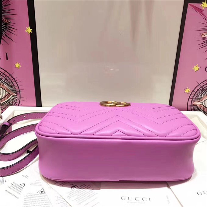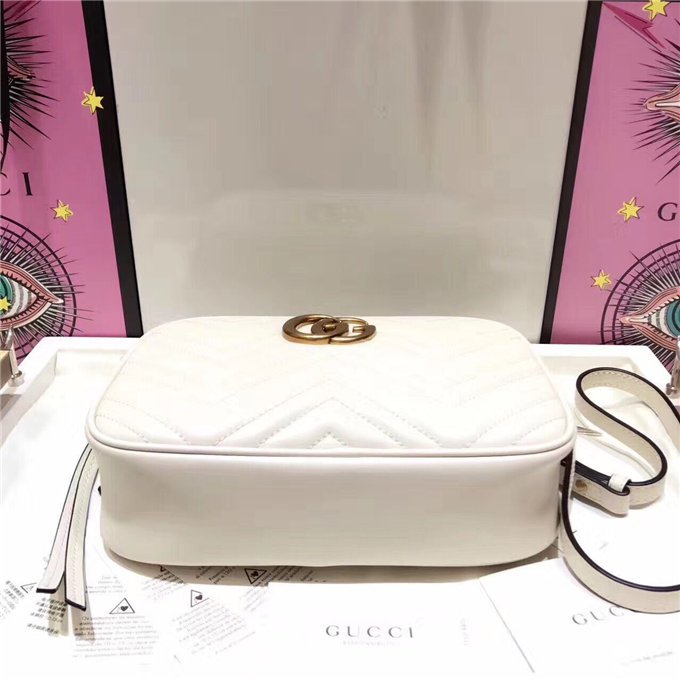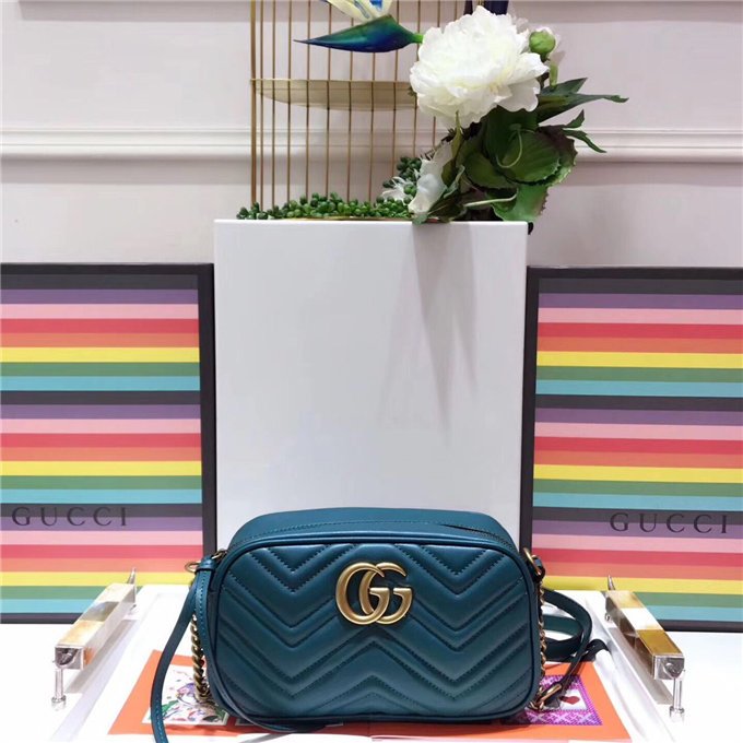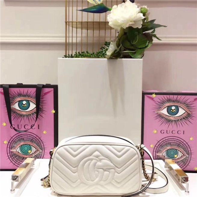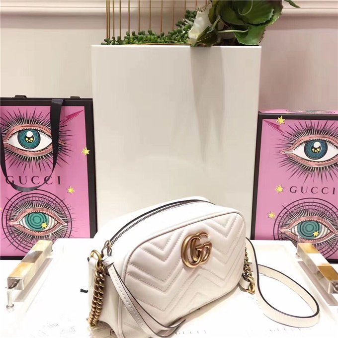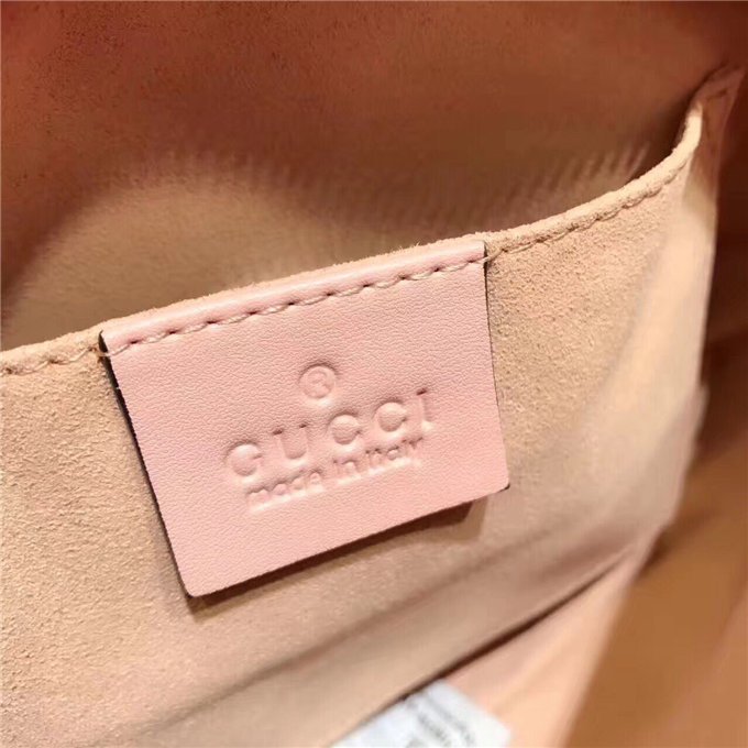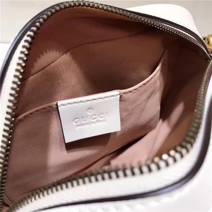 The medium GG Marmont chain shoulder bag has a softly structured shape and a zip top closure with the Double G hardware. The chain shoulder strap has a leather shoulder detail. Made in matelasse leather with a chevron design and GG on the back.