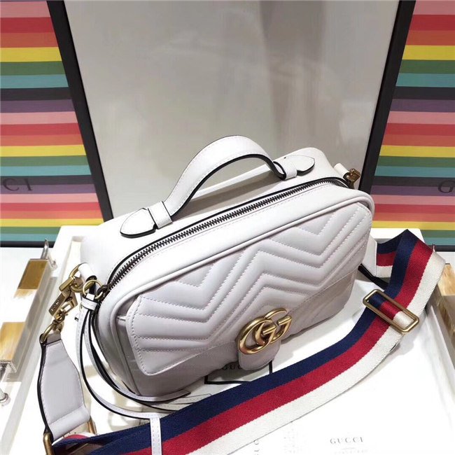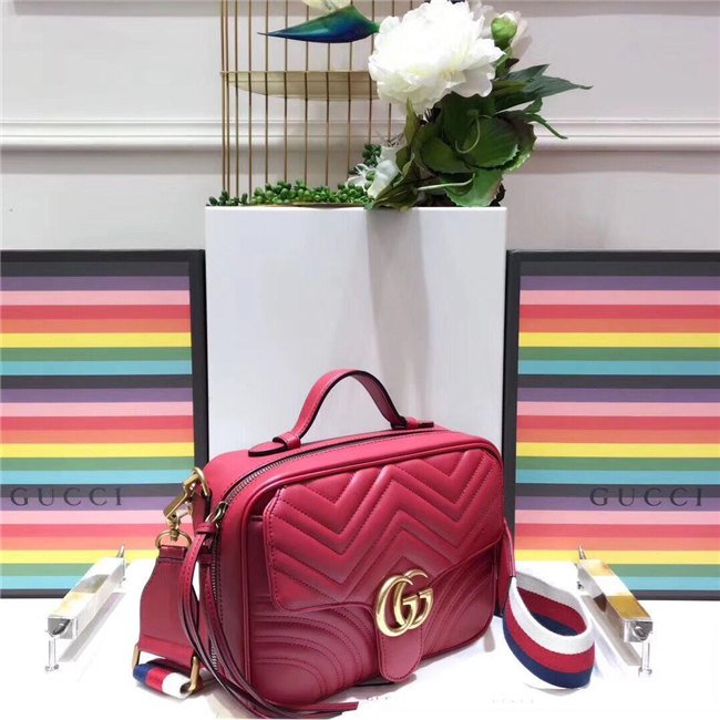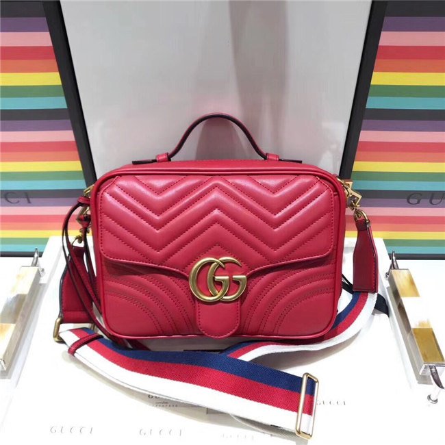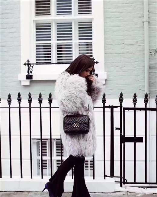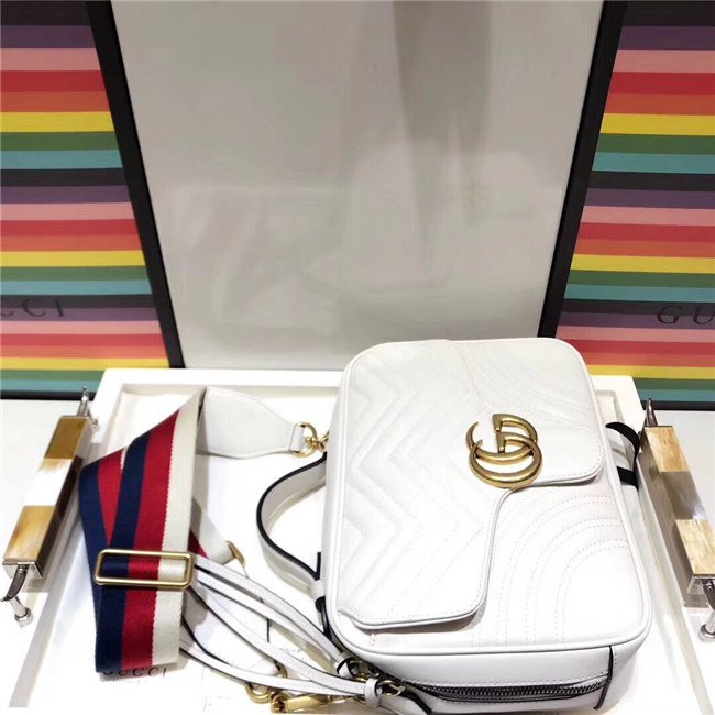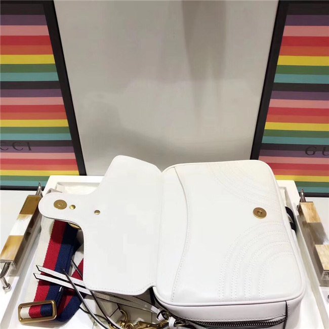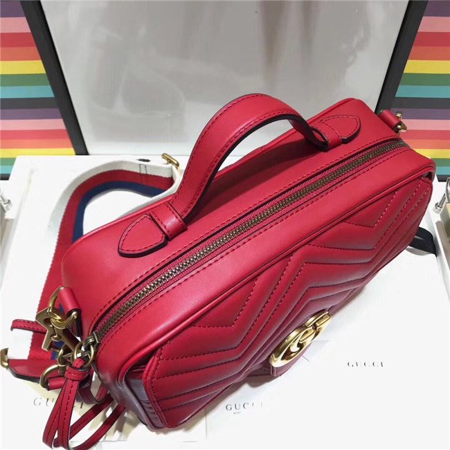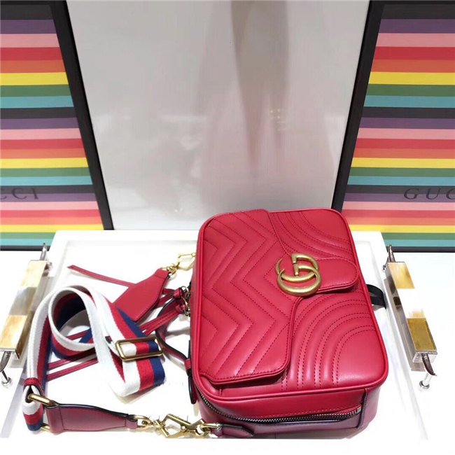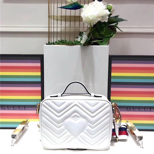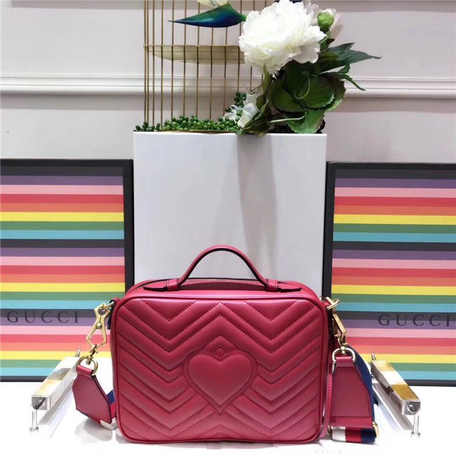 The GG Marmont shoulder bag has a softly structured shape with zip around closure and an oversized front flap with Double G hardware. The shoulder strap features the Sylvie Web stripe, an evolution of the Gucci Web in blue, red and white. Made in matelasse chevron leather with a heart on the back.