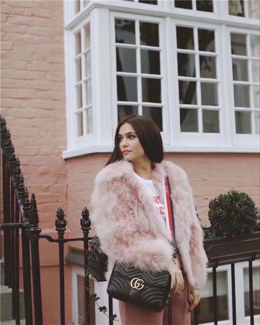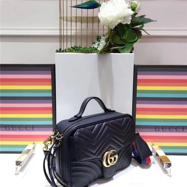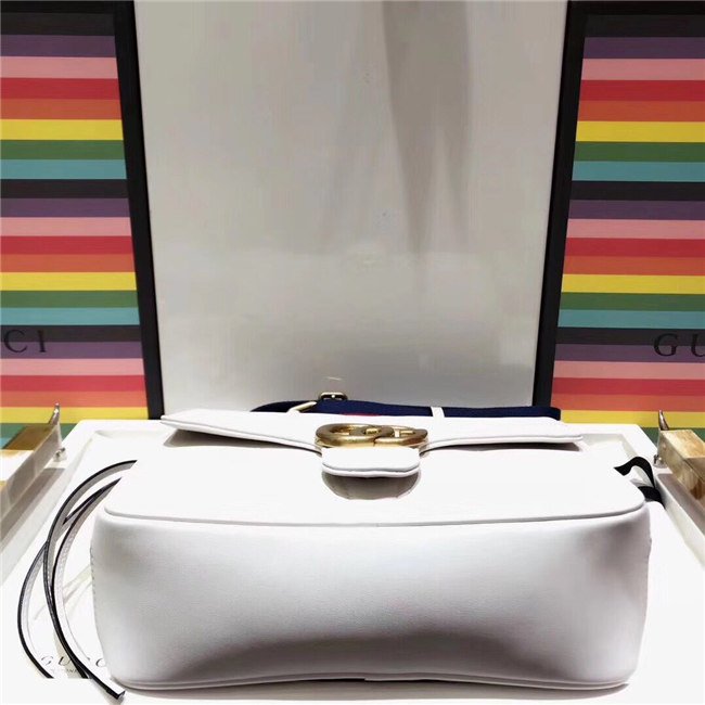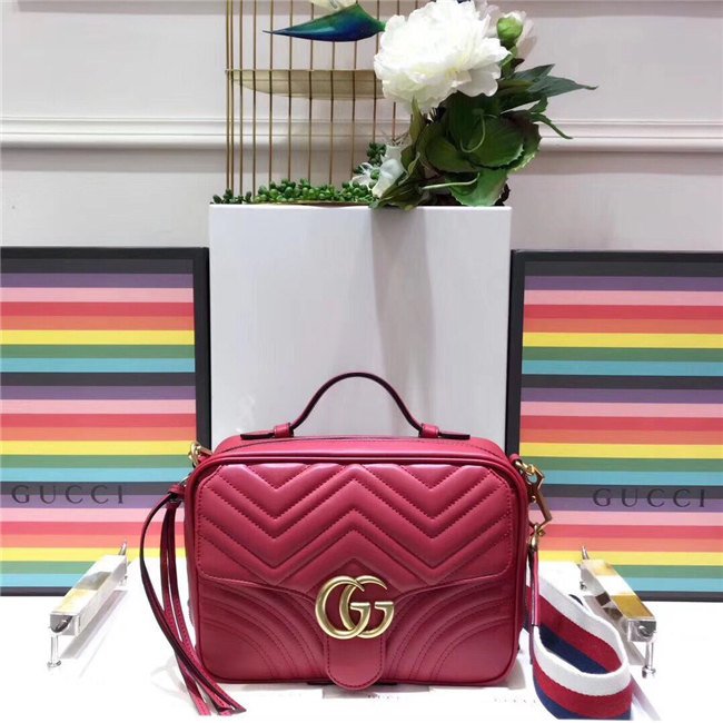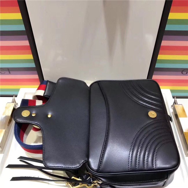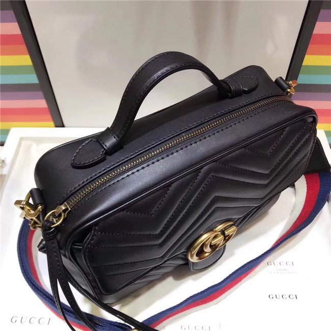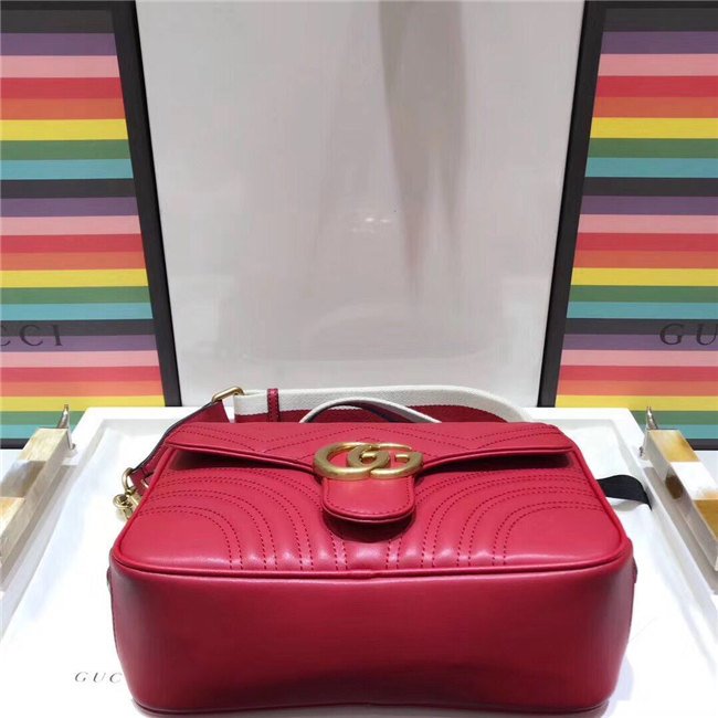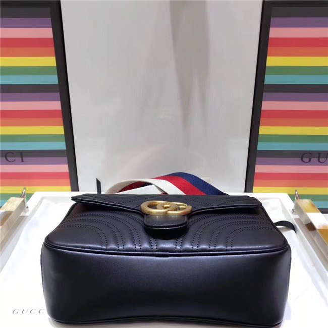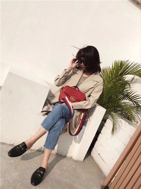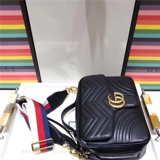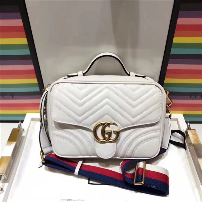 The GG Marmont shoulder bag has a softly structured shape with zip around closure and an oversized front flap with Double G hardware. The shoulder strap features the Sylvie Web stripe, an evolution of the Gucci Web in blue, red and white. Made in matelasse chevron leather with a heart on the back.